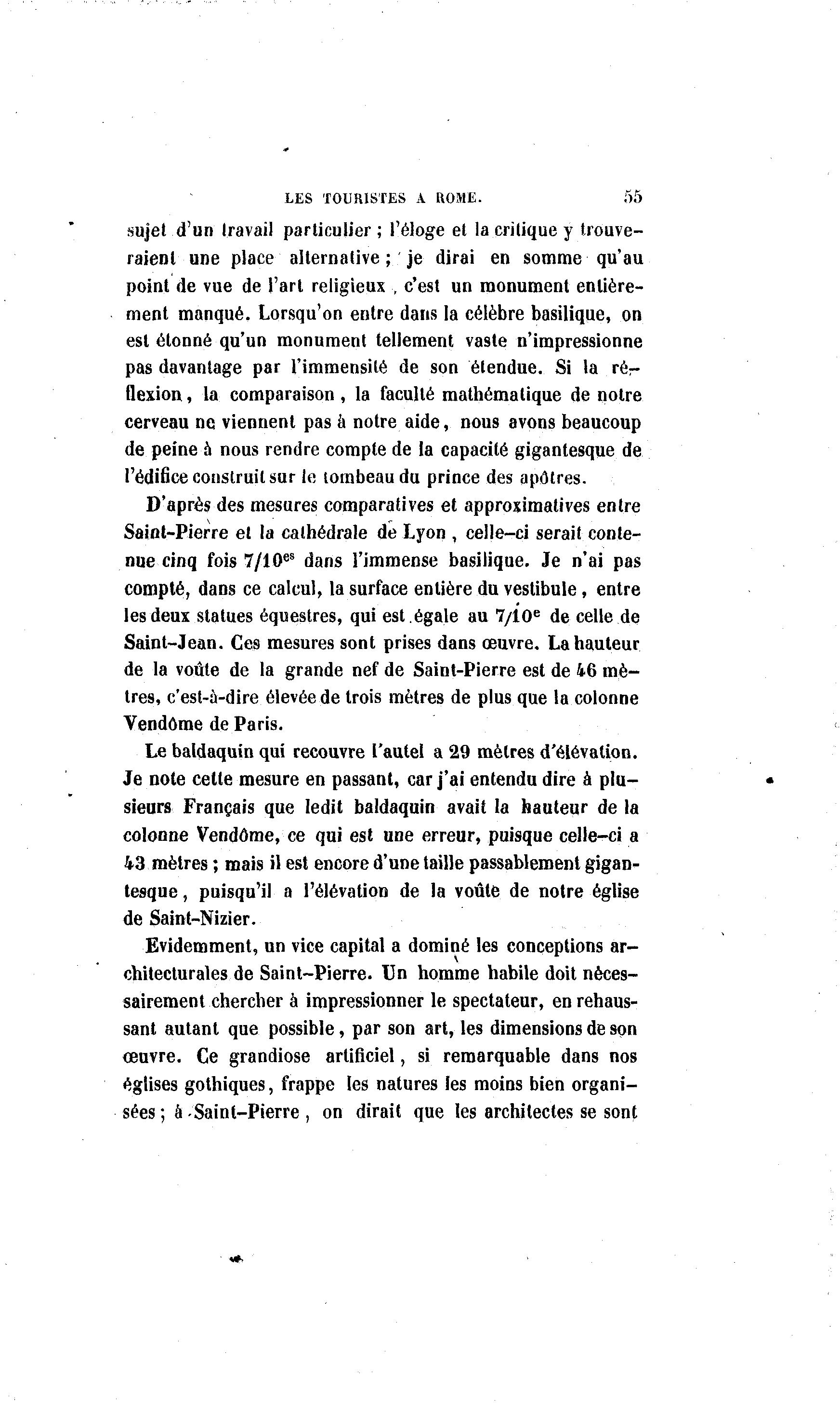 LES TOURISTES A ROME. 55 sujet d'un travail particulier ; l'éloge et la critique y trouve- raient une place alternative ; je dirai en somme qu'au point de vue de l'art religieux , c'est un monument entière- ment manqué. Lorsqu'on entre dans la célèbre basilique, on est étonné qu'un monument tellement vaste n'impressionne pas davantage par l'immensité de son étendue. Si la ré- flexion , la comparaison , la faculté mathématique de notre cerveau ne viennent pas a notre aide, nous avons beaucoup de peine à nous rendre compte de la capacité gigantesque de l'édifice construit sur le tombeau du prince des apôtres. D'après des mesures comparatives et approximatives entre Saint-Pierre et la cathédrale de Lyon , celle-ci serait conte- nue cinq fois 7/10es dans l'immense basilique. Je n'ai pas compté, dans ce calcul, la surface entière du vestibule, entre les deux statues équestres, qui est.égale au 7/10e de celle de Saint-Jean. Ces mesures sont prises dans œuvre. La hauteur de la voûte de la grande nef de Saint-Pierre est de 46 mè- tres, c'est-à -dire élevée de trois mètres de plus que la colonne Vendôme de Paris. Le baldaquin qui recouvre l'autel a 29 mètres d'élévation. Je note celte mesure en passant, car j'ai entendu dire à plu- sieurs Français que ledit baldaquin avait la hauteur de la colonne Vendôme, ce qui est une erreur, puisque celle-ci a 43 mètres ; mais il est encore d'une taille passablement gigan- tesque , puisqu'il a l'élévation de la voûte de notre église de Saint-Nizier. Evidemment, un vice capital a dominé les conceptions ar- chitecturales de Saint-Pierre. Un homme habile doit néces- sairement chercher à impressionner le spectateur, en rehaus- sant autant que possible, par son art, les dimensions de son ceuvre. Ce grandiose artificiel, si remarquable dans nos églises gothiques, frappe les natures les moins bien organi- sées ; â -Saint-Pierre , on dirait que les architectes se sont