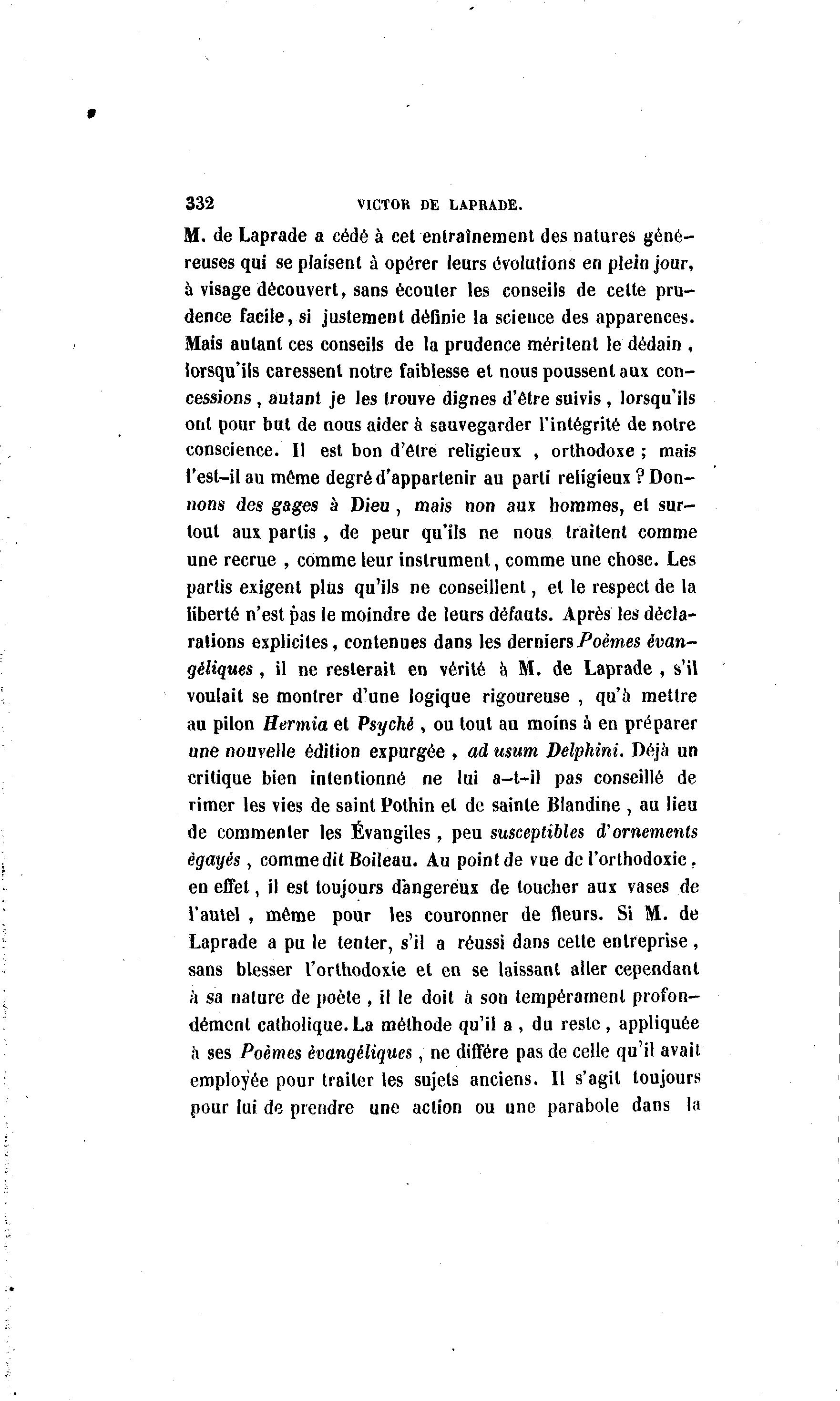332 VICTOR DE LAPRADE. M. de Laprade a cédé à cet entraînement des natures géné- reuses qui se plaisent à opérer leurs évolutions en plein jour, à visage découvert, sans écouter les conseils de celte pru- dence facile, si justement définie la science des apparences. Mais autant ces conseils de la prudence méritent le dédain , lorsqu'ils caressent notre faiblesse et nous poussent aux con- cessions , autant je les trouve dignes d'être suivis , lorsqu'ils ont pour but de nous aider à sauvegarder l'intégrité de notre conscience. Il est bon d'être religieux , orthodoxe ; mais l'est-ilau même degré d'appartenir au parti religieux ? Don- nons des gages à Dieu , mais non aux hommes, et sur- tout aux partis , de peur qu'ils ne nous traitent comme une recrue , comme leur instrument, comme une chose. Les partis exigent plus qu'ils ne conseillent, et le respect de la liberté n'est pas le moindre de leurs défauts. Après les décla- rations explicites, contenues dans les derniers Poèmes èwn- gèliques, il ne resterait en vérité à M. de Laprade , s'il voulait se montrer d'une logique rigoureuse , qu'à mettre au pilon Hermia et Psyché , ou tout au moins à en préparer une nouyelle édition expurgée , ad usum Delphini. Déjà un critique bien intentionné ne lui a-t-il pas conseillé de rimer les vies de saint Pothin et de sainte Blandine , au lieu de commenter les Évangiles, peu susceptibles d'ornements égayés , comme dit Boileau. Au point de vue de l'orthodoxie. en effet, il est toujours dangereux de loucher aux vases de l'autel , même pour les couronner de fleurs. Si M. de Laprade a pu le tenter, s'il a réussi dans celte entreprise , sans blesser l'orthodoxie et en se laissant aller cependant à sa nature de poète , il le doit à son tempérament profon- dément catholique. La méthode qu'il a , du reste, appliquée a ses Poèmes èvangêliques, ne diffère pas de celle qu'il avait employée pour traiter les sujets anciens. Il s'agit toujours pour lui de prendre une action ou une parabole dans la