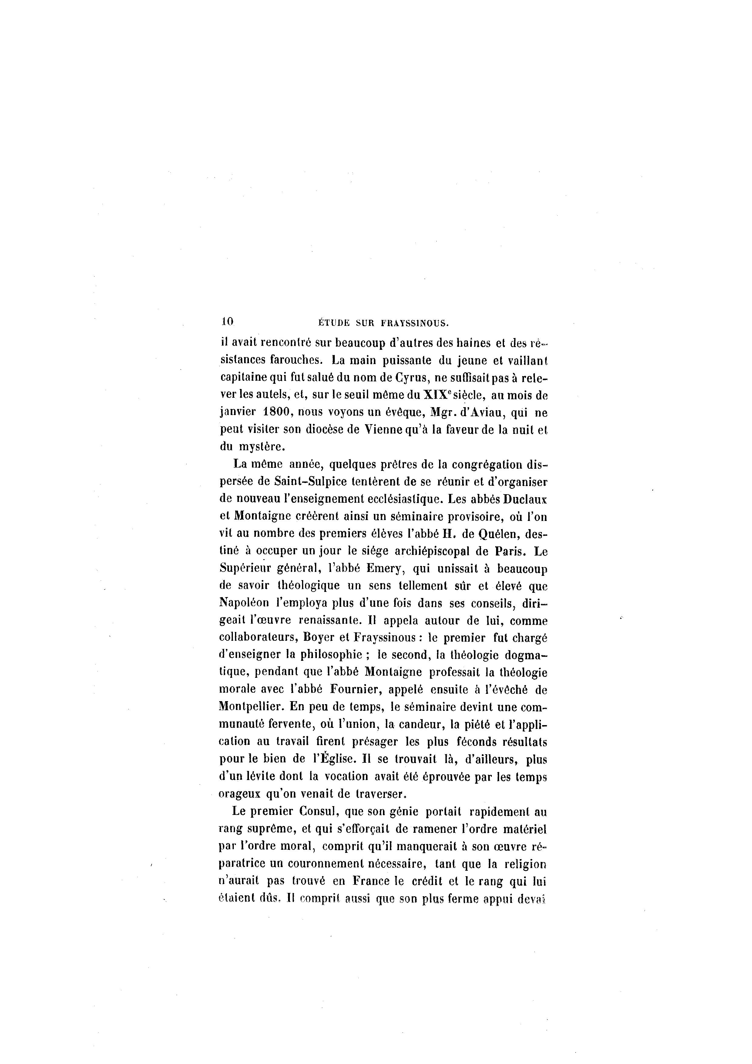 10 ÉTUDE SUR FKAYSS1NOUS. il avait rencontré sur beaucoup d'autres des haines et des ré- sistances farouches. La main puissante du jeune et vaillant capitaine qui fut salué du nom de Cyrus, ne suffisait pas à rele- ver les autels, et, sur le seuil même du XIXe siècle, au mois de janvier 1800, nous voyons un évêque, Mgr. d'Aviau, qui ne peut visiter son diocèse de Vienne qu'à la faveur de la nuit et du mystère. La même année, quelques prêtres de la congrégation dis- persée de Saint-Sulpice tentèrent de se réunir et d'organiser de nouveau l'enseignement ecclésiastique. Les abbés Duclaux et Montaigne créèrent ainsi un séminaire provisoire, où l'on vit au nombre des premiers élèves l'abbé H. de Quélen, des- tiné à occuper un jour le siège archiépiscopal de Paris. Le Supérieur général, l'abbé Emery, qui unissait à beaucoup de savoir théologique un sens tellement sûr et élevé que Napoléon l'employa plus d'une fois dans ses conseils, diri- geait l'œuvre renaissante. Il appela autour de lui, comme collaborateurs, Boyer et Frayssinous : le premier fut chargé d'enseigner la philosophie ; le second, la théologie dogma- tique, pendant que l'abbé Montaigne professait la théologie morale avec l'abbé Fournier, appelé ensuite à l'évêché de Montpellier. En peu de temps, le séminaire devint une com- munauté fervente, où l'union, la candeur, la piété et l'appli- cation au travail firent présager les plus féconds résultats pour le bien de l'Église. Il se trouvait là , d'ailleurs, plus d'un lévite dont la vocation avait été éprouvée par les temps orageux qu'on venait de traverser. Le premier Consul, que son génie portait rapidement au rang suprême, et qui s'efforçait de ramener l'ordre matériel par l'ordre moral, comprit qu'il manquerait à son œuvre ré- paratrice un couronnement nécessaire, tant que la religion n'aurait pas trouvé en France le crédit et le rang qui lui étaient dûs. Il comprit aussi que son plus ferme appui devai