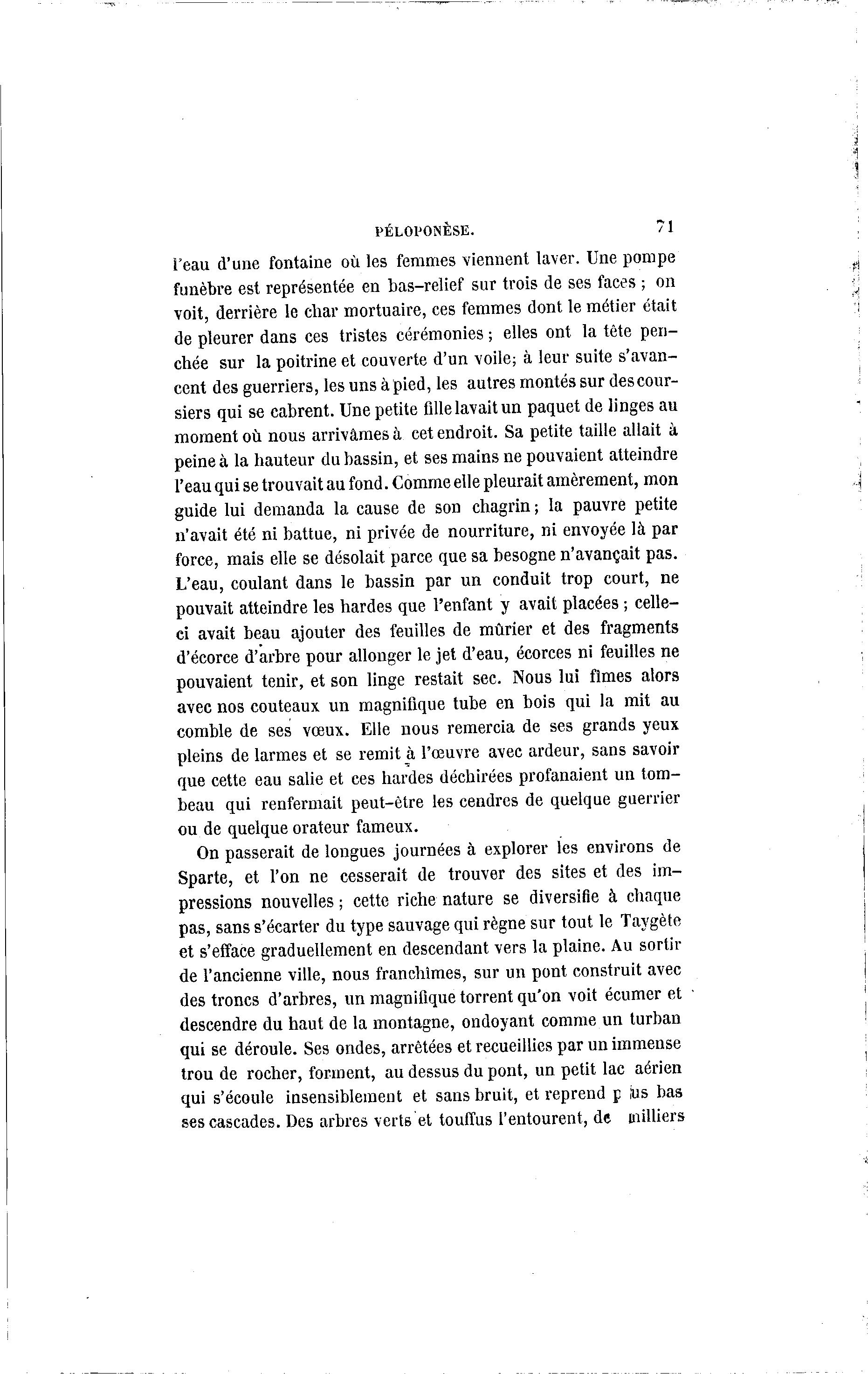 PÉLOVONÈSE. 71 l'eau d'une fontaine où les femmes viennent laver. Une pompe funèbre est représentée en bas-relief sur trois de ses faces ; on voit, derrière le char mortuaire, ces femmes dont le métier était de pleurer dans ces tristes cérémonies ; elles ont la tête pen- chée sur la poitrine et couverte d'un voile; à leur suite s'avan- cent des guerriers, les uns à pied, les autres montés sur des cour- siers qui se cabrent. Une petite fille lavait un paquet de linges au moment où nous arrivâmes à cet endroit. Sa petite taille allait à peine à la hauteur du bassin, et ses mains ne pouvaient atteindre l'eau qui se trouvait au fond. Comme elle pleurait amèrement, mon guide lui demanda la cause de son chagrin; la pauvre petite n'avait été ni battue, ni privée de nourriture, ni envoyée là par force, mais elle se désolait parce que sa besogne n'avançait pas. L'eau, coulant dans le bassin par un conduit trop court, ne pouvait atteindre les hardes que l'enfant y avait placées ; celle- ci avait beau ajouter des feuilles de mûrier et des fragments d'écorce d'arbre pour allonger le jet d'eau, écorces ni feuilles ne pouvaient tenir, et son linge restait sec. Nous lui fîmes alors avec nos couteaux un magnifique tube en bois qui la mit au comble de ses vœux. Elle nous remercia de ses grands yeux pleins de larmes et se remit à l'œuvre avec ardeur, sans savoir que cette eau salie et ces hardes déchirées profanaient un tom- beau qui renfermait peut-être les cendres de quelque guerrier ou de quelque orateur fameux. On passerait de longues journées à explorer les environs de Sparte, et l'on ne cesserait de trouver des sites et des im- pressions nouvelles ; cette riche nature se diversifie à chaque pas, sans s'écarter du type sauvage qui règne sur tout le Taygète et s'efface graduellement en descendant vers la plaine. Au sortir de l'ancienne ville, nous franchîmes, sur un pont construit avec des troncs d'arbres, un magnifique torrent qu'on voit écumer et descendre du haut de la montagne, ondoyant comme un turban qui se déroule. Ses ondes, arrêtées et recueillies par un immense trou de rocher, forment, au dessus du pont, un petit lac aérien qui s'écoule insensiblement et sans bruit, et reprend p jus bas ses cascades. Des arbres verts et touffus l'entourent, de milliers