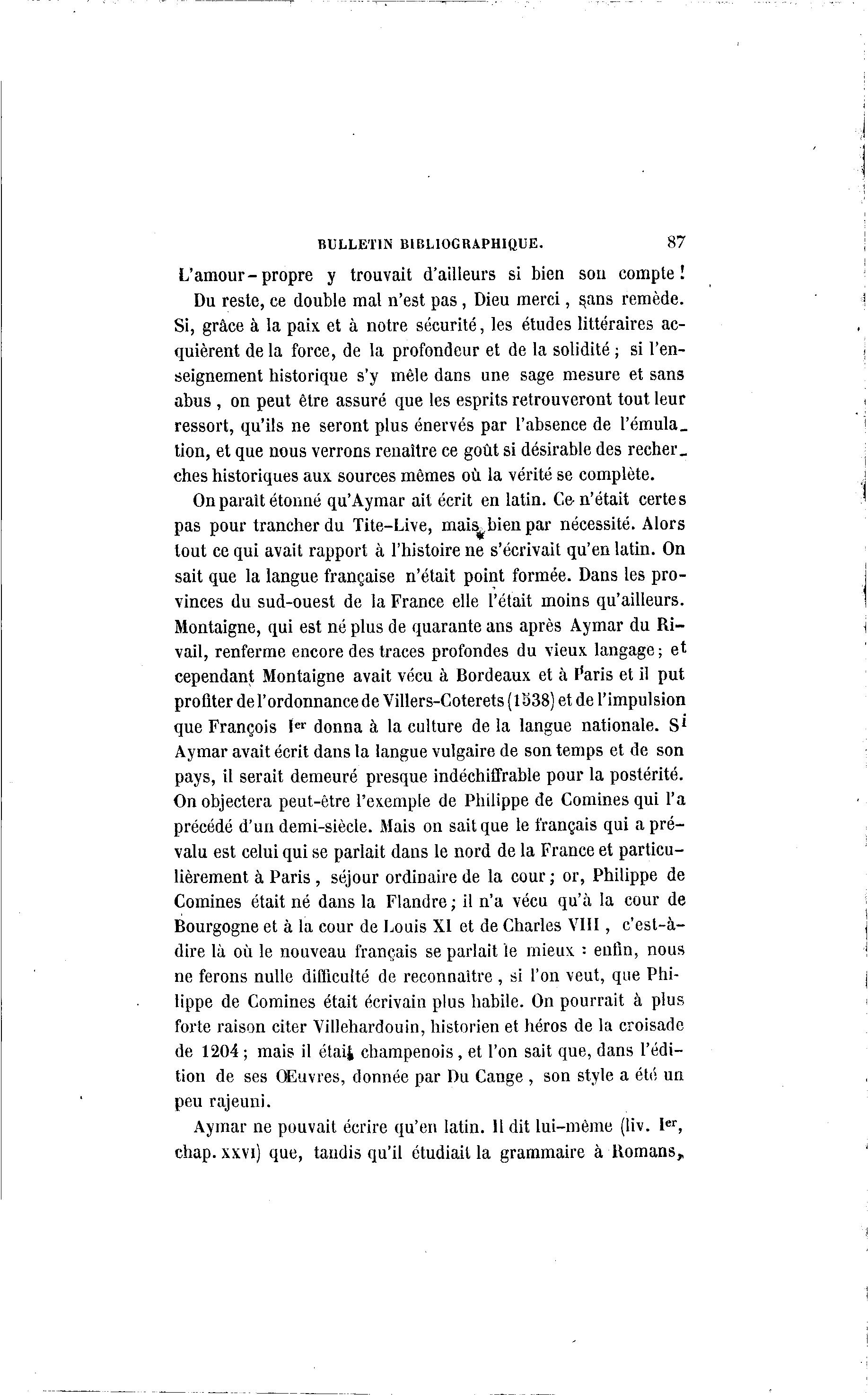 BULLETIN BIBLIOGRAPHIQUE. 87 L'amour-propre y trouvait d'ailleurs si bien sou compte! Du reste, ce double mal n'est pas, Dieu merci, sans remède. Si, grâce à la paix et à notre sécurité, les études littéraires ac- quièrent de la force, de la profondeur et de la solidité ; si l'en- seignement historique s'y mêle dans une sage mesure et sans abus , on peut être assuré que les esprits retrouveront tout leur ressort, qu'ils ne seront plus énervés par l'absence de l'émula_ tion, et que nous verrons renaître ce goût si désirable des recher. ches historiques aux sources mêmes où la vérité se complète. On parait étonné qu'Aymar ait écrit en latin. Ce n'était certes pas pour trancher du Tite-Live, mais bien par nécessité. Alors tout ce qui avait rapport à l'histoire ne s'écrivait qu'en latin. On sait que la langue française n'était point formée. Dans les pro- vinces du sud-ouest de la France elle l'était moins qu'ailleurs. Montaigne, qui est né plus de quarante ans après Aymar du Ri- vait, renferme encore des traces profondes du vieux langage ; et cependant Montaigne avait vécu à Bordeaux et à ï'aris et il put profiter del'ordonnance de Villers-Coterets (1538) et de l'impulsion que François Ier donna à la culture de la langue nationale. S* Aymar avait écrit dans la langue vulgaire de son temps et de son pays, il serait demeuré presque indéchiffrable pour la postérité. On objectera peut-être l'exemple de Philippe de Comines qui l'a précédé d'un demi-siècle. Mais on sait que le français qui a pré- valu est celui qui se parlait dans le nord de la France et particu- lièrement à Paris , séjour ordinaire de la cour ; or, Philippe de Comines était né dans la Flandre ; il n'a vécu qu'à la cour de Bourgogne et à la cour de Louis XI et de Charles VIII, c'est-à - dire là où le nouveau français se parlait le mieux : enfin, nous ne ferons nulle difficulté de reconnaître , si l'on veut, que Phi- lippe de Comines était écrivain plus habile. On pourrait à plus forte raison citer Villehardouin, historien et héros de la croisade de 1204 ; mais il était champenois, et l'on sait que, dans l'édi- tion de ses Œuvres, donnée par Du Cange , son style a été un peu rajeuni. Aymar ne pouvait écrire qu'en latin. 11 dit lui-même (liv. Ier, chap. xxvi) que, taudis qu'il étudiait la grammaire à Romans,