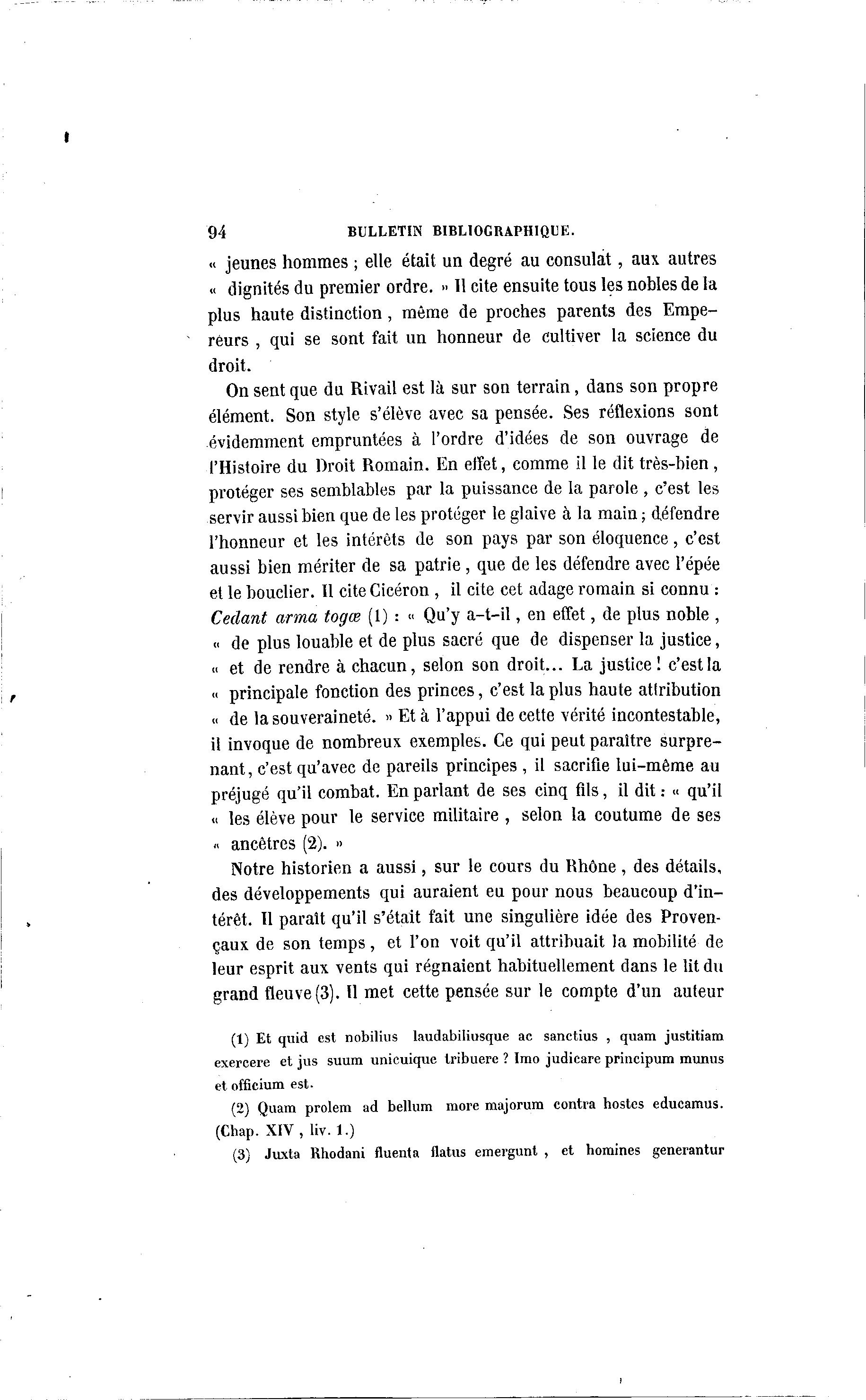 94 BULLETIN BIBLIOGRAPHIQUE. « jeunes hommes ; elle était un degré au consulat, aux autres « dignités du premier ordre. » Il cite ensuite tous les nobles de la plus haute distinction, même de proches parents des Empe- reurs , qui se sont fait un honneur de cultiver la science du droit. On sent que du Rivail est là sur son terrain, dans son propre élément. Son style s'élève avec sa pensée. Ses réflexions sont évidemment empruntées à l'ordre d'idées de son ouvrage de l'Histoire du Droit Romain. En effet, comme il le dit très-bien , protéger ses semblables par la puissance de la parole , c'est les servir aussi bien que de les protéger le glaive à la main ; défendre l'honneur et les intérêts de son pays par son éloquence, c'est aussi bien mériter de sa patrie , que de les défendre avec l'épée et le bouclier. Il cite Cicéron , il cite cet adage romain si connu : Cédant arma togœ (1) : « Qu'y a-t-il, en effet, de plus noble , « de plus louable et de plus sacré que de dispenser la justice, « et de rendre à chacun, selon son droit... La justice ! c'est la « principale fonction des princes, c'est la plus haute atfribution « de la souveraineté. » Et à l'appui de cette vérité incontestable, il invoque de nombreux exemples. Ce qui peut paraître surpre- nant, c'est qu'avec de pareils principes , il sacrifie lui-même au préjugé qu'il combat. En parlant de ses cinq fils, il dit.- « qu'il « les élève pour le service militaire , selon la coutume de ses « ancêtres (2). » Notre historien a aussi, sur le cours du Rhône, des détails, des développements qui auraient eu pour nous beaucoup d'in- térêt. Il paraît qu'il s'était fait une singulière idée des Proven- çaux de son temps, et l'on voit qu'il attribuait la mobilité de leur esprit aux vents qui régnaient habituellement dans le lit du grand fleuve (3). Il met cette pensée sur le compte d'un auteur (1) Et quid est nobilius laudabiliusque ac sanctius , quam justitiam exercere et jus suum unicuique tribuere ? Irao judicare principum munus et officium est. (2) Quam prolem ad bellum more majorum contra hostes educamus. (Chap. XIV, liv. 1.) (3) Juxta Rhodani fluenta flatus emergunt , et hommes generantur