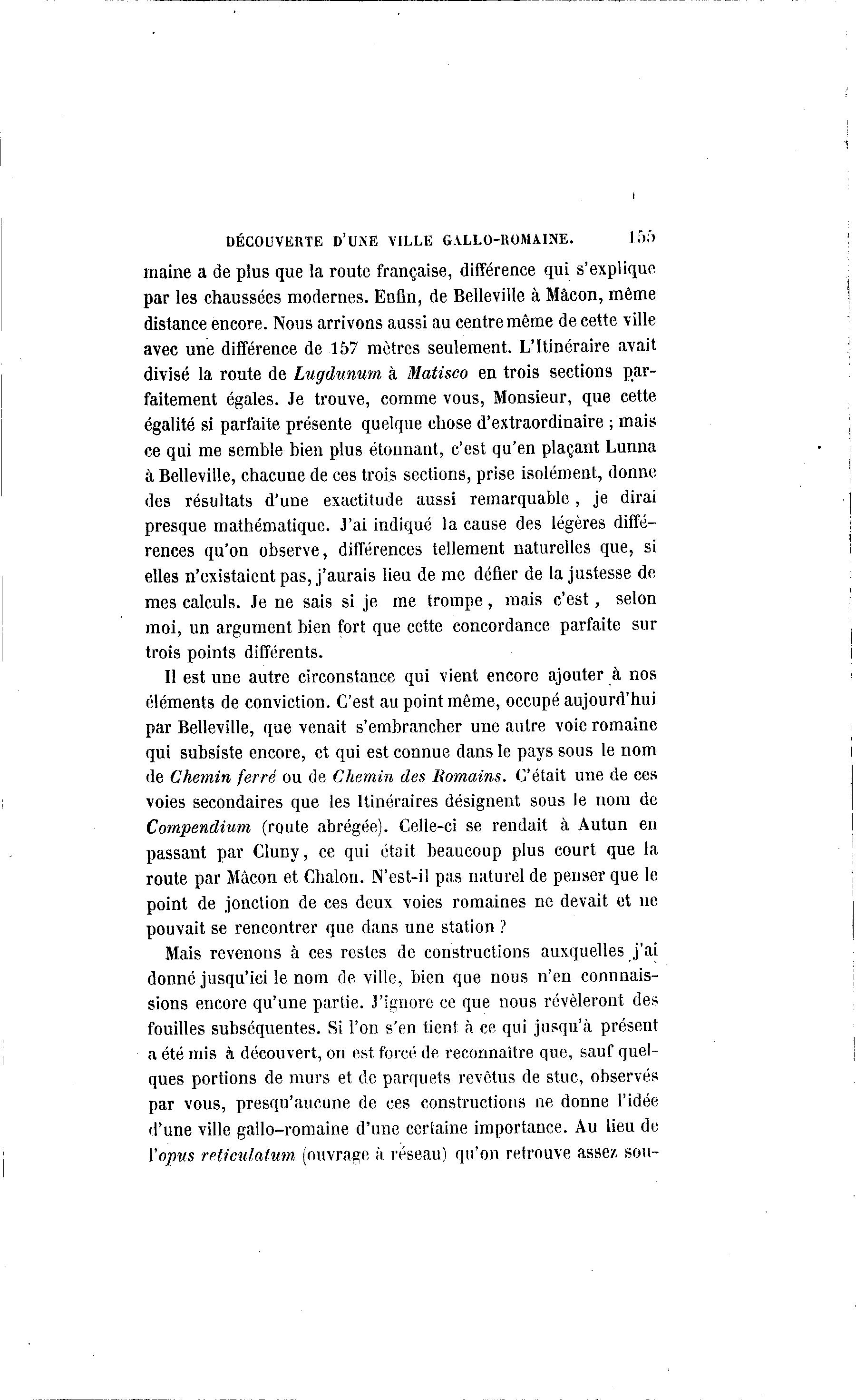 DÉCOUVERTE D'UNE VILLE GALLO-ROMAINE. 15;') maine a de plus que la route française, différence qui s'explique par les chaussées modernes. Enfin, de Belleville à Mâcon, même distance encore. Nous arrivons aussi au centre même de cette ville avec une différence de 157 mètres seulement. L'Itinéraire avait divisé la route de Lugdunum à Matisco en trois sections par- faitement égales. Je trouve, comme vous, Monsieur, que cette égalité si parfaite présente quelque chose d'extraordinaire ; mais ce qui me semble bien plus étonnant, c'est qu'en plaçant Lunna à Belleville, chacune de ces trois sections, prise isolément, donne des résultats d'une exactitude aussi remarquable, je dirai presque mathématique. J'ai indiqué la cause des légères diffé- rences qu'on observe, différences tellement naturelles que, si elles n'existaient pas, j'aurais lieu de me défier de la justesse de mes calculs. Je ne sais si je me trompe, mais c'est, selon moi, un argument bien fort que cette concordance parfaite sur trois points différents. Il est une autre circonstance qui vient encore ajouter à nos éléments de conviction. C'est au point même, occupé aujourd'hui par Belleville, que venait s'embrancher une autre voie romaine qui subsiste encore, et qui est connue dans le pays sous le nom de Chemin ferré ou de Chemin des Romains. C'était une de ces voies secondaires que les Itinéraires désignent sous le nom de Compendium (route abrégée). Celle-ci se rendait à Autun en passant par Cluny, ce qui était beaucoup plus court que la route par Mâcon et Chalon. N'est-il pas naturel de penser que le point de jonction de ces deux voies romaines ne devait et ne pouvait se rencontrer que dans une station ? Mais revenons à ces restes de constructions auxquelles j'ai donné jusqu'ici le nom de ville, bien que nous n'en connnais- sions encore qu'une partie. 3'ignore ce que nous révéleront des fouilles subséquentes. Si l'on s'en tient à ce qui jusqu'à présent a été mis à découvert, on est forcé de reconnaître que, sauf quel- ques portions de murs et de parquets revêtus de stuc, observés par vous, presqu'aucune de ces constructions ne donne l'idée d'une ville gallo-romaine d'une certaine importance. Au lieu de \'opus reticulatum (ouvrage à réseau) qu'on retrouve assez sou-
