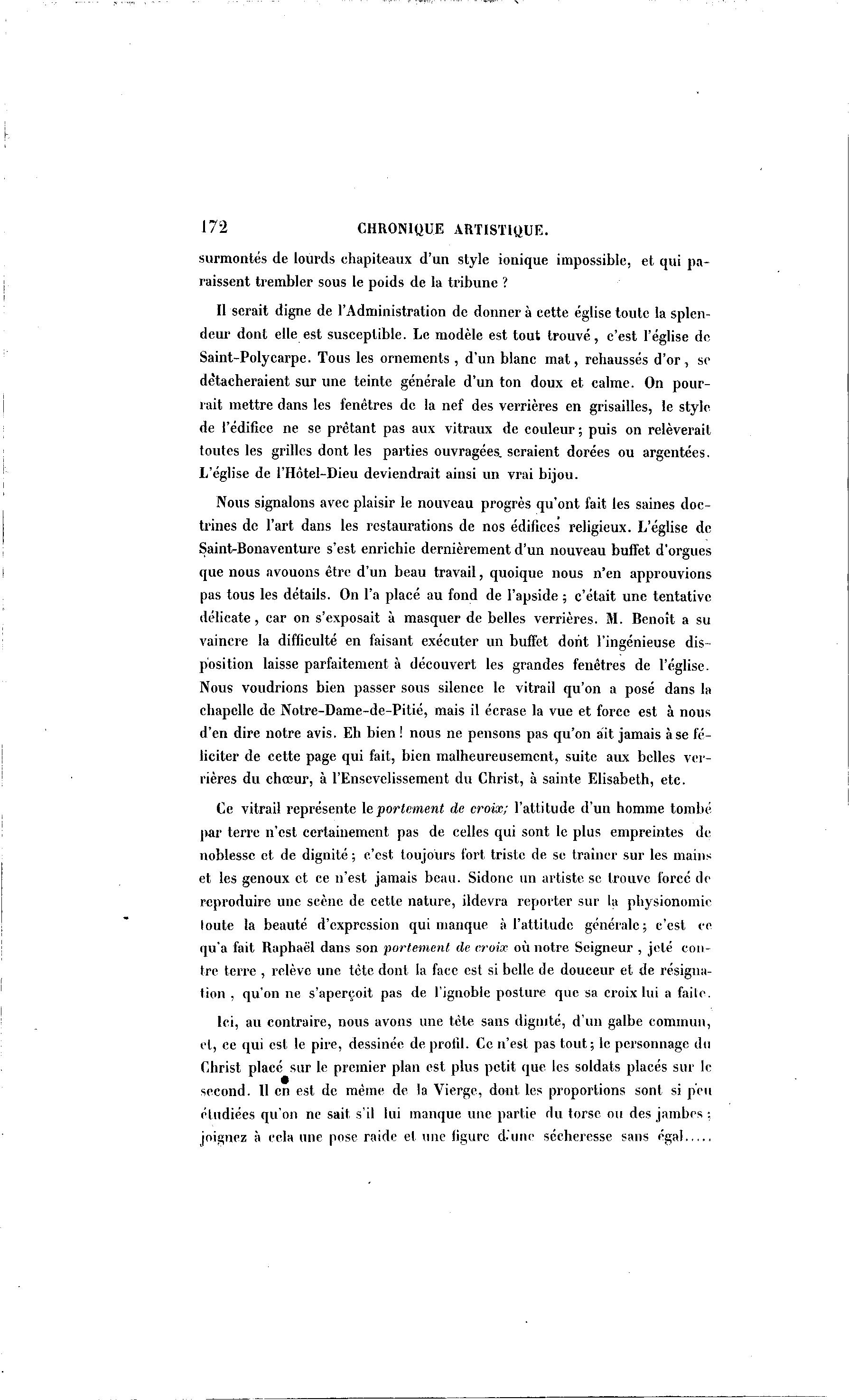 172 CHRONIQUE ARTISTIQUE. surmontés de lourds chapiteaux d'un style ionique impossible, et qui pa- raissent trembler sous le poids de la tribune ? Il serait digne de l'Administration de donner à cette église toute la splen- deur dont elle est susceptible. Le modèle est tout trouvé, c'est l'église de Saint-Polycarpe. Tous les ornements , d'un blanc mat, rehaussés d'or , se détacheraient sur une teinte générale d'un ton doux et calme. On pour- rait mettre dans les fenêtres de la nef des verrières en grisailles, le style de l'édifice ne se prêtant pas aux vitraux de couleur ; puis on relèverait toutes les grilles dont les parties ouvragées, seraient dorées ou argentées. L'église de l'Hôtel-Dicu deviendrait ainsi un vrai bijou. Nous signalons avec plaisir le nouveau progrès qu'ont fait les saines doc- trines de l'art dans les restaurations de nos édifices religieux. L'église de Saint-Bonaventure s'est enrichie dernièrement d'un nouveau buffet d'orgues que nous avouons être d'un beau travail, quoique nous n'en approuvions pas tous les détails. On l'a placé au fond de l'apside ; c'était une tentative délicate, car on s'exposait à masquer de belles verrières. M. Benoit a su vaincre la difficulté en faisant exécuter un buffet dont l'ingénieuse dis- position laisse parfaitement à découvert les grandes fenêtres de l'église. Nous voudrions bien passer sous silence le vitrail qu'on a posé dans la chapelle de Notre-Dame-de-Pitié, mais il écrase la vue et force est à nous d'en dire notre avis. Eh bien ! nous ne pensons pas qu'on ait jamais à se fé- liciter de cette page qui fait, bien malheureusement, suite aux belles ver- rières du chœur, à l'Ensevelissement du Christ, à sainte Elisabeth, etc. Ce vitrail représente le portement de croix; l'attitude d'un homme tombé par terre n'est certainement pas de celles qui sont le plus empreintes de noblesse et de dignité ; c'est toujours fort triste de se traîner sur les mains et les genoux et ce n'est jamais beau. Sidonc un artiste se trouve force do reproduire une scène de cette nature, ildevra reporter sur la physionomie loute la beauté d'expression qui manque à l'attitude générale; c'est ce qu'a fait Raphaël dans son portement de croix où notre Seigneur , jeté con- tre terre , relève une tête dont la face est si belle de douceur et de résigna- tion , qu'on ne s'aperçoit pas de l'ignoble posture que sa croix lui a faile. Ici, au contraire, nous avons une tète sans dignité, d'un galbe commun, et, ce qui est le pire, dessinée de profil. Ce n'est pas tout; le personnage du Christ placé sur le premier plan est plus petit que les soldats placés sur le second. Il en est de même de la Vierge, dont les proportions sont si peu étudiées qu'on ne sait s'il lui manque une partie du torse ou des jambes : joignez à cela une pose raide et une ligure d.'une sécheresse sans égal