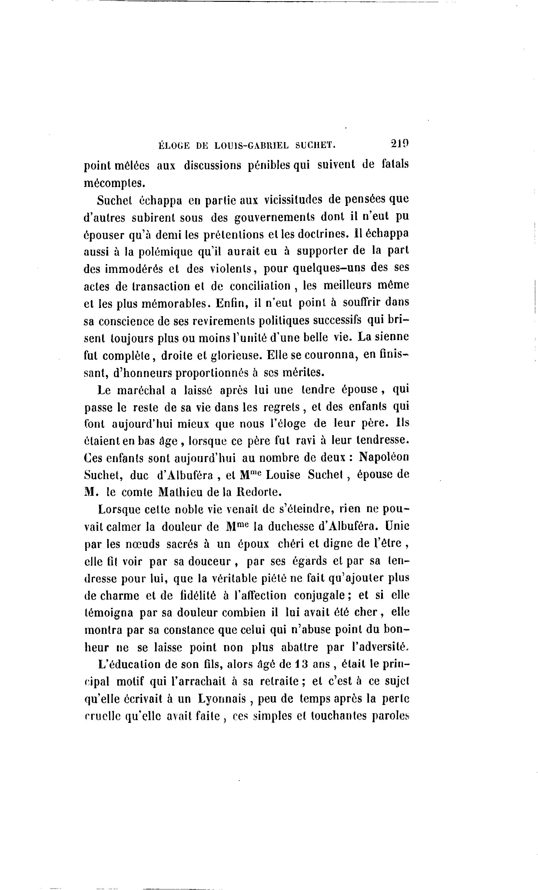 ÉLOGE DE LOUIS-GABRIEL SUCHET. 219 point mêlées aux discussions pénibles qui suivent de fatals mécomptes. Suchet échappa en partie aux vicissitudes de pensées que d'autres subirent sous des gouvernements dont il n'eut pu épouser qu'à demi les prétentions elles doctrines. 11 échappa aussi à la polémique qu'il aurait eu à supporter de la part des immodérés et des violents, pour quelques-uns des ses actes de transaction el de conciliation , les meilleurs même et les plus mémorables. Enfin, il n'eut point à souffrir dans sa conscience de ses revirements politiques successifs qui bri- sent toujours plus ou moins l'unité d'une belle vie. La sienne fut complète, droite et glorieuse. Elle se couronna, en finis- sant, d'honneurs proportionnés à ses mérites. Le maréchal a laissé après lui une tendre épouse , qui passe le reste de sa vie dans les regrets , et des enfants qui font aujourd'hui mieux que nous l'éloge de leur père. Ils étaient en bas âge, lorsque ce père fut ravi à leur tendresse. Ces enfants sont aujourd'hui au nombre de deux : Napoléon Suchet, duc d'Albuféra , el Mme Louise Suchel , épouse de M. le comte Mathieu de la Redorte. Lorsque celte noble vie venait de s'éteindre, rien ne pou- vait calmer la douleur de Mme la duchesse d'Albuféra. Unie par les nœuds sacrés à un époux chéri et digne de l'être , elle fil voir par sa douceur , par ses égards et par sa ten- dresse pour lui, que la véritable piété ne fait qu'ajouter plus de charme et de fidélité à l'affection conjugale ; et si elle témoigna par sa douleur combien il lui avait été cher, elle montra par sa constance que celui qui n'abuse point du bon- heur ne se laisse point non plus abattre par l'adversité. L'éducation de son fils, alors âgé de 13 ans , était le prin- cipal motif qui l'arrachait à sa retraite ; et c'est à ce sujet qu'elle écrivait à un Lyonnais, peu de temps après la perte cruelle qu'elle avait faite, ces simples et touchantes paroles