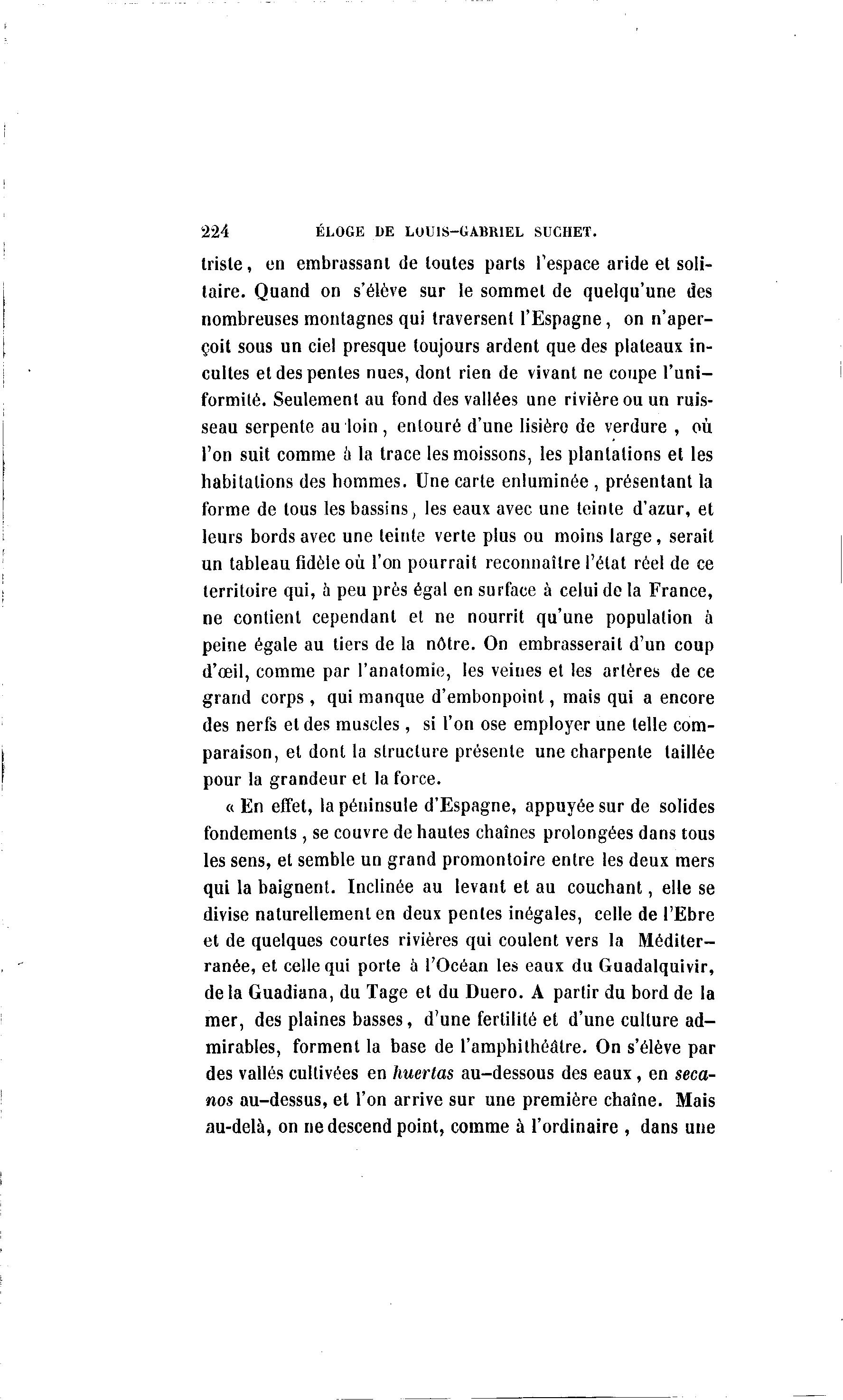 224 ÉLOGE DE LOUIS-GABRIEL SUCHET. triste, en embrassant de toutes parts l'espace aride et soli- taire. Quand on s'élève sur le sommet de quelqu'une des nombreuses montagnes qui traversent l'Espagne, on n'aper- çoit sous un ciel presque toujours ardent que des plateaux in- cultes et des pentes nues, dont rien de vivant ne coupe l'uni- formité. Seulement au fond des vallées une rivière ou un ruis- seau serpente au loin , entouré d'une lisière de verdure , où l'on suit comme à la trace les moissons, les plantations et les habitations des hommes. Une carte enluminée , présentant la forme de tous les bassins, les eaux avec une teinte d'azur, et leurs bords avec une teinte verte plus ou moins large, serait un tableau fidèle où l'on pourrait reconnaître l'état réel de ce territoire qui, a peu près égal en surface à celui de la France, ne contient cependant et ne nourrit qu'une population à peine égale au tiers de la nôtre. On embrasserait d'un coup d'œil, comme par l'anatomie, les veines et les artères de ce grand corps , qui manque d'embonpoint, mais qui a encore des nerfs et des muscles, si l'on ose employer une telle com- paraison, et dont la structure présente une charpente taillée pour la grandeur et la force. « En effet, la péninsule d'Espagne, appuyée sur de solides fondements , se couvre de hautes chaînes prolongées dans tous les sens, et semble un grand promontoire entre les deux mers qui la baignent. Inclinée au levant et au couchant, elle se divise naturellement en deux pentes inégales, celle de l'Ebre et de quelques courtes rivières qui coulent vers la Méditer- ranée, et celle qui porte à l'Océan les eaux du Guadalquivir, delà Guadiana, du Tage et du Duero. A partir du bord de la mer, des plaines basses, d'une fertilité et d'une culture ad- mirables, forment la base de l'amphithéâtre. On s'élève par des vallés cultivées en huertas au-dessous des eaux, en seca- nos au-dessus, et l'on arrive sur une première chaîne. Mais au-delà , on ne descend point, comme à l'ordinaire , dans une