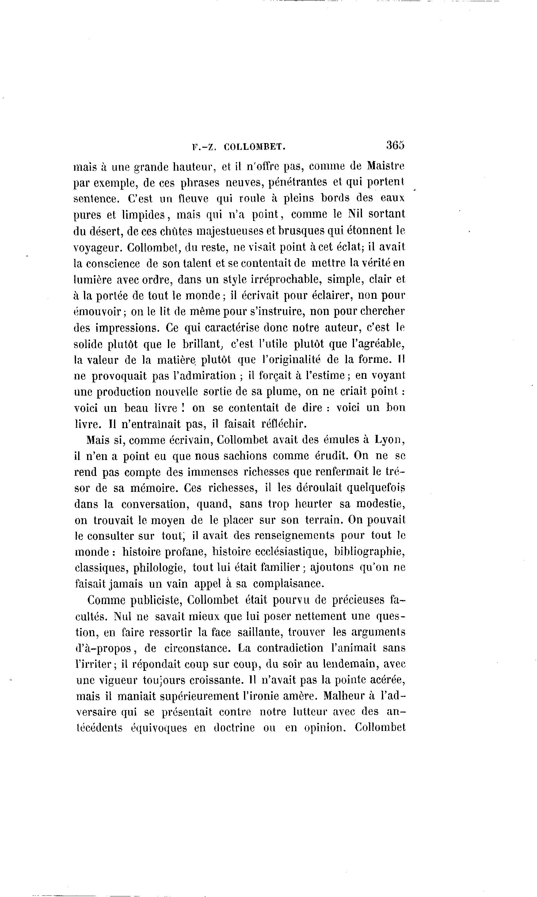 F.-Z. COLLOMBET. 365 mais à une grande hauteur, et il n'offre pas, comme de Maistre par exemple, de ces phrases neuves, pénétrantes et qui portent sentence. C'est un fleuve qui roule à pleins bords des eaux pures et limpides, mais qui n'a point, comme le Nil sortant du désert, de ces chûtes majestueuses et brusques qui étonnent le voyageur. Collombeî, du reste, ne visait point à cet éclat; il avait la conscience de son talent et se contentait de mettre la vérité en lumière avec ordre, dans un style irréprochable, simple, clair et à la portée de tout le monde ; il écrivait pour éclairer, non pour émouvoir; on le lit de même pour s'instruire, non pour chercher des impressions. Ce qui caractérise donc notre auteur, c'est le solide plutôt que le brillant, c'est l'utile plutôt que l'agréable, la valeur de la matière plutôt que l'originalité de la forme. 1 1 ne provoquait pas l'admiration ; il forçait à l'estime ; en voyant une production nouvelle sortie de sa plume, on ne criait point : voici un beau livre ! on se contentait de dire : voici un bon livre. Il n'entraînait pas, il faisait réfléchir. Mais si, comme écrivain, Collombet avait des émules à Lyon, il n'en a point eu que nous sachions comme érudit. On ne se rend pas compte des immenses richesses que renfermait le tré- sor de sa mémoire. Ces richesses, il les déroulait quelquefois dans la conversation, quand, sans trop heurter sa modestie, on trouvait le moyen de le placer sur son terrain. On pouvait le consulter sur tout, il avait des renseignements pour tout le monde : histoire profane, histoire ecclésiastique, bibliographie, classiques, philologie, tout lui était familier ; ajoutons qu'on ne faisait jamais un vain appel à sa complaisance. Comme publiciste, Collombet était pourvu de précieuses fa- cultés. Nul ne savait mieux que lui poser nettement une ques- tion, en faire ressortir la face saillante, trouver les arguments d'à -propos, de circonstance. La contradiction l'animait sans l'irriter; il répondait coup sur coup, du soir au lendemain, avec une vigueur toujours croissante. 11 n'avait pas la pointe acérée, mais il maniait supérieurement l'ironie amère. Malheur à l'ad- versaire qui se présentait contre notre lutteur avec des an- técédents équivoques en doctrine ou en opinion. Collombet