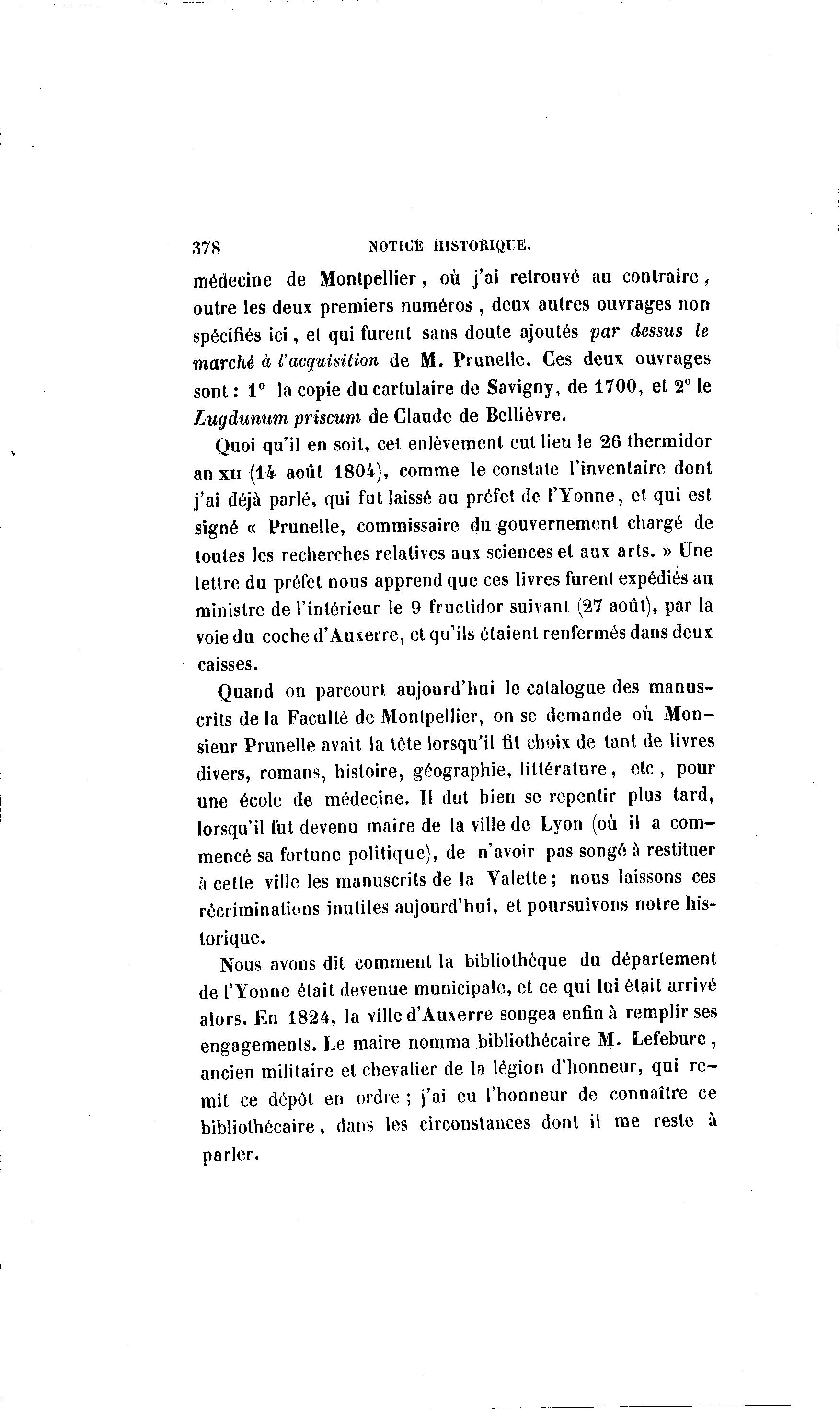 378 NOTICE HISTORIQUE. médecine de Montpellier, où j'ai retrouvé au contraire, outre les deux premiers numéros , deux autres ouvrages non spécifiés ici, et qui furent sans doute ajoutés par dessus le marché à l'acquisition de M. Prunelle. Ces deux ouvrages sont : 1° la copie ducartulaire de Savigny, de 1700, et 2° le Lugdunum priscum de Claude de Bellièvre. Quoi qu'il en soit, cet enlèvement eut lieu le 26 thermidor an xn (14 août 1804), comme le constate l'inventaire dont j'ai déjà parlé, qui fut laissé au préfet de l'Yonne, et qui est signé « Prunelle, commissaire du gouvernement chargé de toutes les recherches relatives aux sciences et aux arts. » Une lettre du préfet nous apprend que ces livres furenl expédiés au ministre de l'intérieur le 9 fructidor suivant (27 août), par la voie du coche d'Auxerre, et qu'ils étaient renfermés dans deux caisses. Quand on parcourt aujourd'hui le catalogue des manus- crits de la Faculté de Montpellier, on se demande où Mon- sieur Prunelle avait la tête lorsqu'il fit choix de tant de livres divers, romans, histoire, géographie, littérature, elc, pour une école de médecine. Il dut bien se repentir plus tard, lorsqu'il fut devenu maire de la ville de Lyon (où il a com- mencé sa fortune politique), de n'avoir pas songé à restituer à celte ville les manuscrits de la Valette ; nous laissons ces récriminations inutiles aujourd'hui, et poursuivons notre his- torique. Nous avons dit comment la bibliothèque du département de l'Yonne était devenue municipale, et ce qui lui était arrivé alors. En 1824, la ville d'Auxerre songea enfin à remplir ses engagements. Le maire nomma bibliothécaire M. Lefebure, ancien militaire et chevalier de la légion d'honneur, qui re- mit ce dépôt en ordre ; j'ai eu l'honneur de connaître ce bibliothécaire, dans les circonstances dont il me reste à parler.