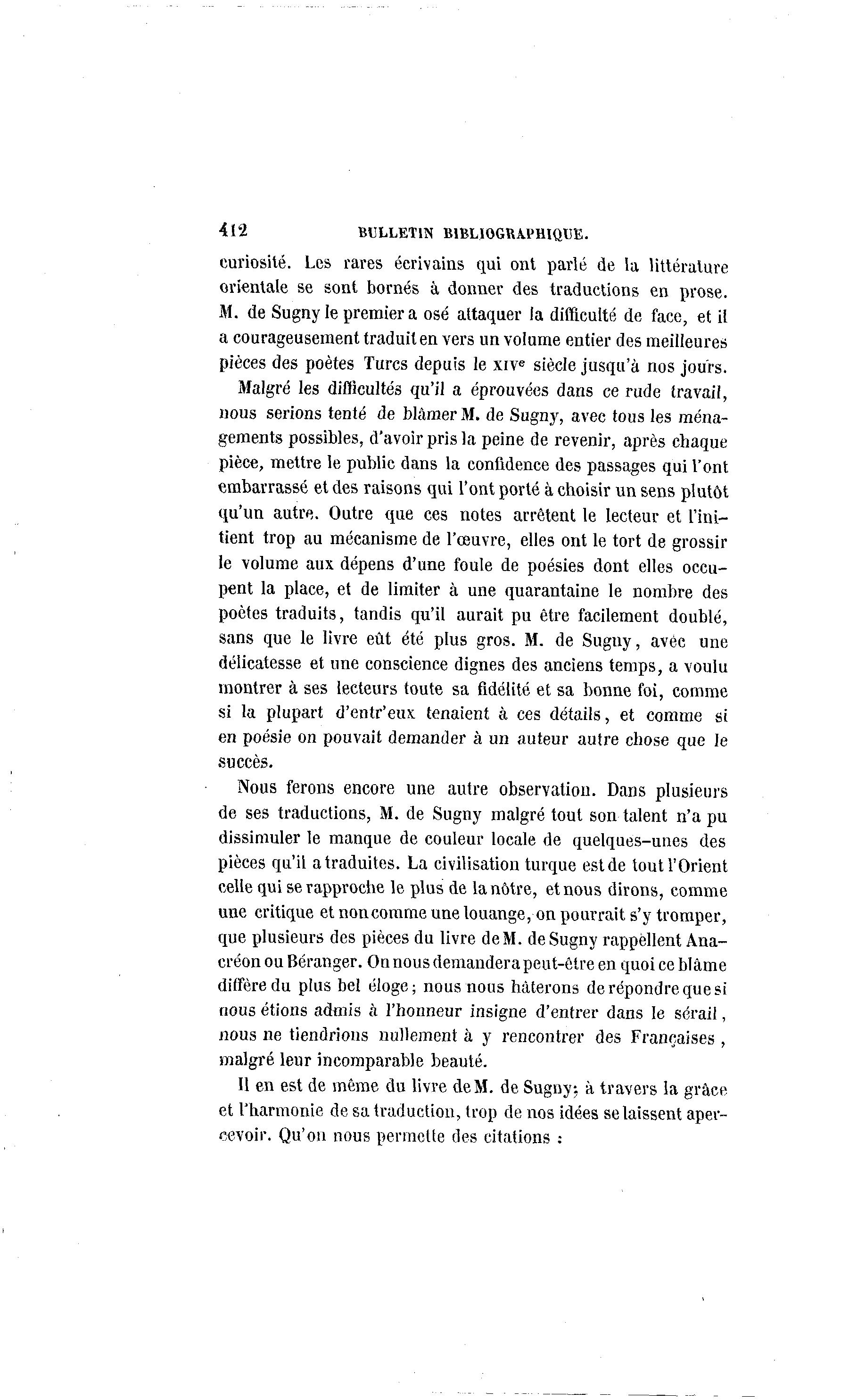 412 BULLETIN BIBLIOGRAPHIQUE. curiosité. Les rares écrivains qui ont parlé de la littérature orientale se sont bornés à donner des traductions en prose. M. de Sugny le premier a osé attaquer la difficulté de face, et il a courageusement traduit en vers un volume entier des meilleures pièces des poètes Turcs depuis le xive siècle jusqu'à nos jours. Malgré les difficultés qu'il a éprouvées dans ce rude travail, nous serions tenté de blâmer M. de Sugny, avec tous les ména- gements possibles, d'avoir pris la peine de revenir, après chaque pièce, mettre le public dans la confidence des passages qui l'ont embarrassé et des raisons qui l'ont porté à choisir un sens plutôt qu'un autre. Outre que ces notes arrêtent le lecteur et l'ini- tient trop au mécanisme de l'œuvre, elles ont le tort de grossir le volume aux dépens d'une foule de poésies dont elles occu- pent la place, et de limiter à une quarantaine le nombre des poètes traduits, tandis qu'il aurait pu être facilement doublé, sans que le livre eût été plus gros. M. de Sugny, avec une délicatesse et une conscience dignes des anciens temps, a voulu montrer à ses lecteurs toute sa fidélité et sa bonne foi, comme si la plupart d'entr'eux tenaient à ces détails, et comme si en poésie on pouvait demander à un auteur autre chose que le succès. Nous ferons encore une autre observation. Dans plusieurs de ses traductions, M. de Sugny malgré tout son talent n'a pu dissimuler le manque de couleur locale de quelques-unes des pièces qu'il a traduites. La civilisation turque est de tout l'Orient celle qui se rapproche le plus de la nôtre, et nous dirons, comme une critique et non comme une louange, on pourrait s'y tromper, que plusieurs des pièces du livre de M. de Sugny rappellent Ana- créon ou Béranger. On nous demandera peut-être en quoi ce blâme diffère du plus bel éloge; nous nous hâterons de répondre que si nous étions admis à l'honneur insigne d'entrer dans le sérail, nous ne tiendrions nullement à y rencontrer des Françaises , malgré leur incomparable beauté. Il en est de même du livre de M. de Sugny; à travers la grâce et l'harmonie de sa traduction, trop de nos idées se laissent aper- cevoir. Qu'on nous permette des citations :