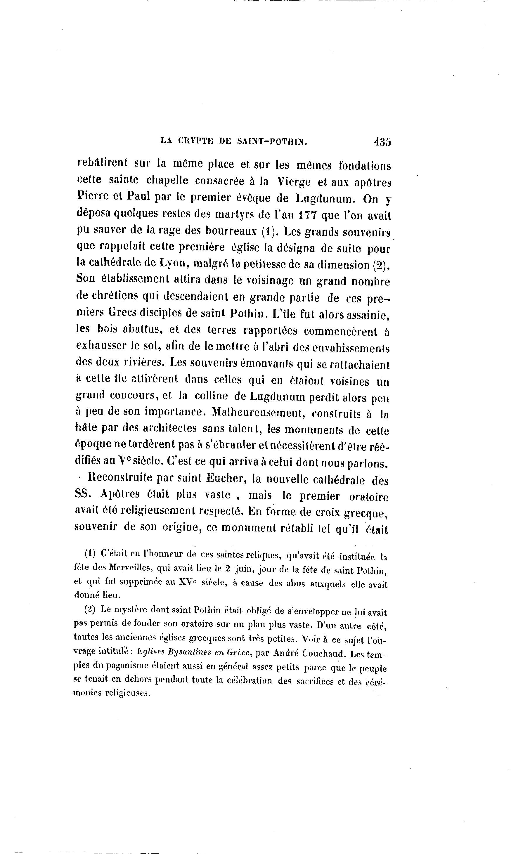 LA CRYPTE DE SAINT-P0TH1N. 435 rebâtirent sur la même place et sur les mômes fondations celte sainte chapelle consacrée à la Vierge et aux apôtres Pierre et Paul par le premier évoque de Lugdunum. On y déposa quelques restes des martyrs de l'an 177 que l'on avait pu sauver de la rage des bourreaux (1). Les grands souvenirs que rappelait celte première église la désigna de suite pour la cathédrale de Lyon, malgré la petitesse de sa dimension (2). Son établissement attira dans le voisinage un grand nombre de chrétiens qui descendaient en grande partie de ces pre- miers Grecs disciples de saint. Polhin. L'île fut alors assainie, les bois abattus, el des terres rapportées commencèrent à exhausser le sol, afin de le mettre à l'abri des envahissements des deux rivières. Les souvenirs émouvants qui se rattachaient à celte île attirèrent dans celles qui en étaient voisines un grand concours, el la colline de Lugdunum perdit alors peu à peu de son importance. Malheureusement, construits à la hâte par des archilecles sans talent, les monuments de celle époque ne lardèrent pas à s'ébranler el nécessitèrent d'être réè- difiés au Ve siècle. C'est ce qui arriva à celui dont nous parlons. Reconstruite par saint Eucher, la nouvelle cathédrale des SS. Apôtres élait plus vaste , mais le premier oratoire avait été religieusement respecté. En forme de croix grecque, souvenir de son origine, ce monument rétabli lel qu'il était (1) C'était en l'honneur de ces saintes reliques, qu'avait été instituée la fête des Merveilles, qui avait lieu le 2 juin, jour de la fête de saint Polhin, et qui fut supprimée au XVe siècle, à cause des abus auxquels elle avait donné lieu. (2) Le mystère dont saint Pothin était obligé de s'envelopper ne lui avait pas permis de fonder son oratoire sur un plan plus vaste. D'un autre côté, toutes les anciennes églises grecques sont très petites. Voir à ce sujet l'ou- vrage intitulé : Eglises Bysantines en Grèce, par André Couchaud. Les tem- ples du paganisme étaient aussi en général assez petits parce que le peuple se tenait en dehors pendant toute la célébration des sacrifices et des céré- monies religieuses.