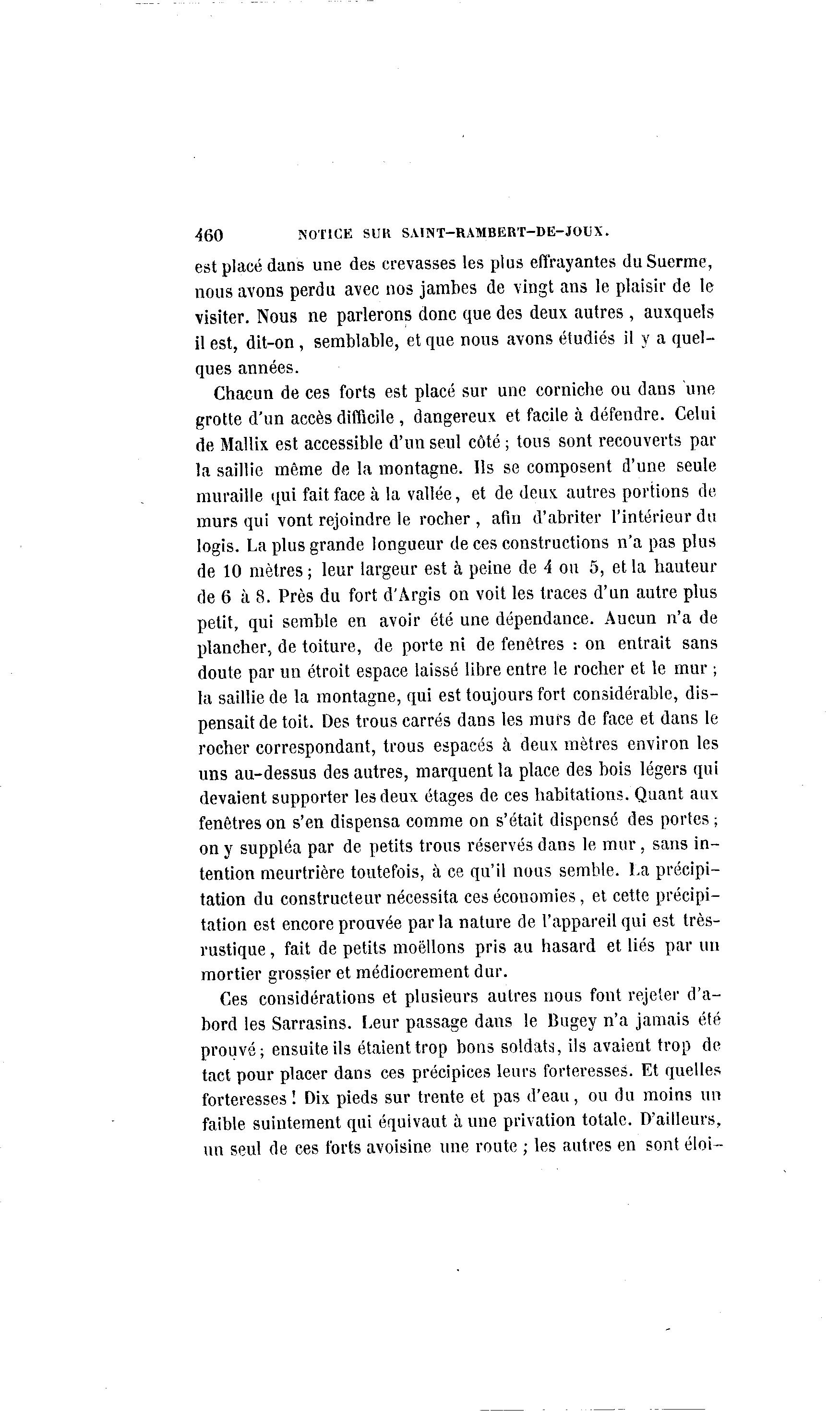 460 NOTICE SUK SAINT-RAMBERT-DE-JOUX. est placé dans une des crevasses les plus effrayantes duSuerme, nous avons perdu avec nos jambes de vingt ans le plaisir de le visiter. Nous ne parlerons donc que des deux autres , auxquels il est, dit-on, semblable, et que nous avons étudiés il y a quel- ques années. Chacun de ces forts est placé sur une corniche ou dans une grotte d'un accès difficile , dangereux et facile à défendre. Celui de Mallix est accessible d'un seul côté ; tous sont recouverts par la saillie même de la montagne. Ils se composent d'une seule muraille qui fait face à la vallée, et de deux autres portions de murs qui vont rejoindre le rocher, afin d'abriter l'intérieur du logis. La plus grande longueur de ces constructions n'a pas plus de 10 mètres ; leur largeur est à peine de 4 ou 5, et la hauteur de 6 à 8. Près du fort d'Argis on voit les traces d'un autre plus petit, qui semble en avoir été une dépendance. Aucun n'a de plancher, de toiture, de porte ni de fenêtres : on entrait sans doute par un étroit espace laissé libre entre le rocher et le mur ; la saillie de la montagne, qui est toujours fort considérable, dis- pensait de toit. Des trous carrés dans les murs de face et dans le rocher correspondant, trous espacés à deux mètres environ les uns au-dessus des autres, marquent la place des bois légers qui devaient supporter les deux étages de ces habitations. Quant au\ fenêtres on s'en dispensa comme on s'était dispensé des portes; on y suppléa par de petits trous réservés dans le mur, sans in- tention meurtrière toutefois, à ce qu'il nous semble. La précipi- tation du constructeur nécessita ces économies, et cette précipi- tation est encore prouvée par la nature de l'appareil qui est très- rustique , fait de petits moellons pris au hasard et liés par un mortier grossier et médiocrement dur. Ces considérations et plusieurs autres nous font rejeter d'a- bord les Sarrasins. Leur passage dans le Bugey n'a jamais été prouvé; ensuite ils étaient trop bons soldats, ils avaient trop de tact pour placer dans ces précipices leurs forteresses. Et quelles forteresses! Dix pieds sur trente et pas d'eau, ou du moins un faible suintement qui équivaut à une privation totale. D'ailleurs, un seul de ces forts avoisine une route ; les autres en sont éloi-