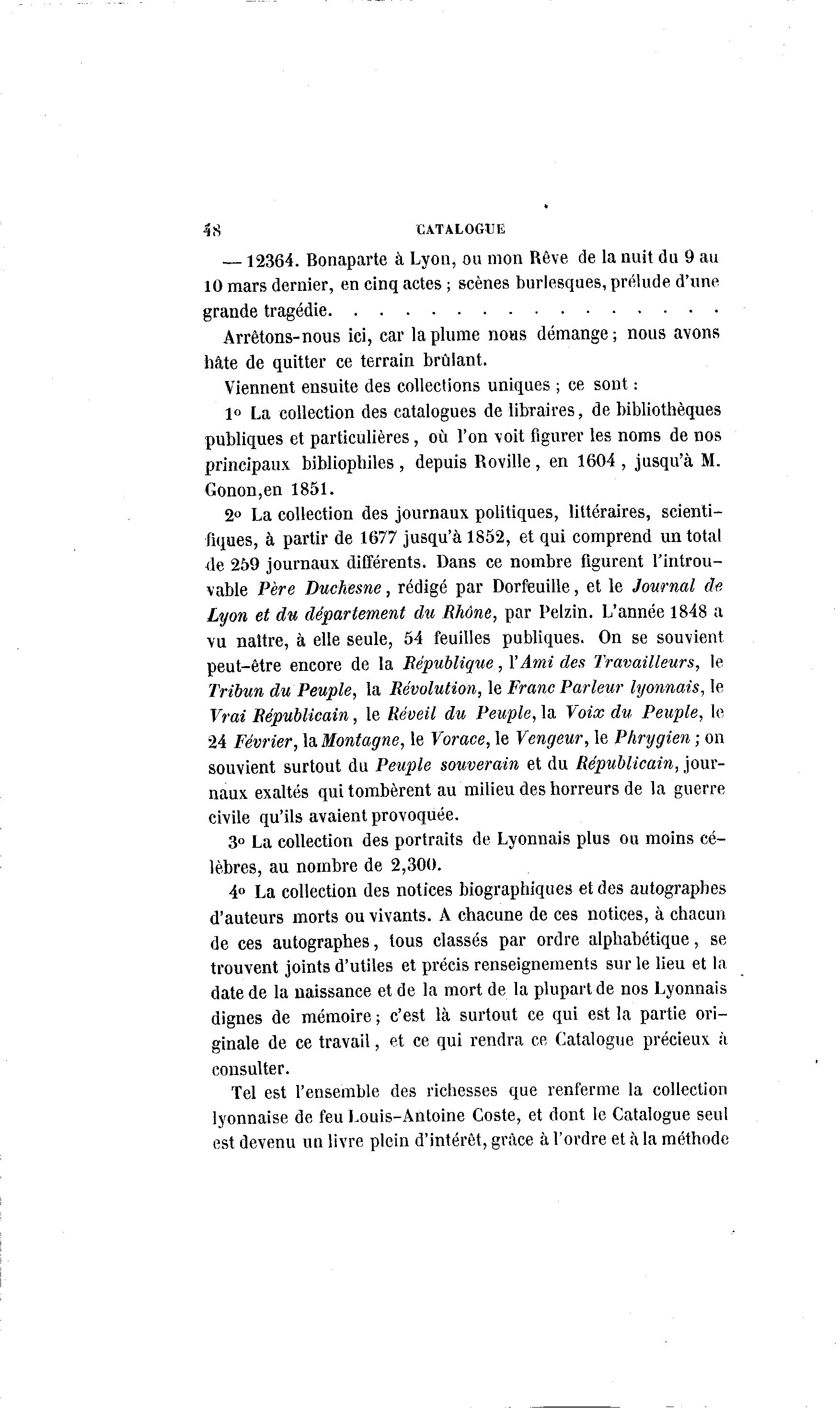 4S CATALOGUE —12364. Bonaparte à Lyon, ou mon Rêve de la nuit du 9 au 10 mars dernier, en cinq actes ; scènes burlesques, prélude d'une grande tragédie Arrêtons-nous ici, car la plume nous démange; nous avons hâte de quitter ce terrain brûlant. Viennent ensuite des collections uniques ; ce sont : 1° La collection des catalogues de libraires, de bibliothèques publiques et particulières, où l'on voit figurer les noms de nos principaux bibliophiles , depuis Roville, en 1604 , jusqu'à M. Gonon,en 1851. 2° La collection des journaux politiques, littéraires, scienti- fiques, à partir de 1677 jusqu'à 1852, et qui comprend un total de 259 journaux différents. Dans ce nombre figurent l'introu- vable Père Duchesne, rédigé par Dorfeuille, et le Journal de Lyon et du département du Rhône, par Pelzin. L'année 1848 a vu naître, à elle seule, 54 feuilles publiques. On se souvient peut-être encore de la République, l'Ami des Travailleurs, le Tribun du Peuple, la Révolution, le Franc Parleur lyonnais, le Vrai Républicain, le Réveil du Peuple, la Voix du Peuple, le 24 Février, la Montagne, le Vorace, le Vengeur, le Phrygien ; on souvient surtout du Peuple souverain et du Républicain, jour- naux exaltés qui tombèrent au milieu des horreurs de la guerre civile qu'ils avaient provoquée. 3° La collection des portraits de Lyonnais plus ou moins cé- lèbres, au nombre de 2,300. 4° La collection des notices biographiques et des autographes d'auteurs morts ou vivants. A chacune de ces notices, à chacun de ces autographes, tous classés par ordre alphabétique, se trouvent joints d'utiles et précis renseignements sur le lieu et la date de la naissance et de la mort de la plupart de nos Lyonnais dignes de mémoire ; c'est là surtout ce qui est la partie ori- ginale de ce travail, et ce qui rendra ce Catalogue précieux à consulter. Tel est l'ensemble des richesses que renferme la collection lyonnaise de feu Louis-Antoine Coste, et dont le Catalogue seul est devenu uo livre plein d'intérêt, grâce à l'ordre et à la méthode