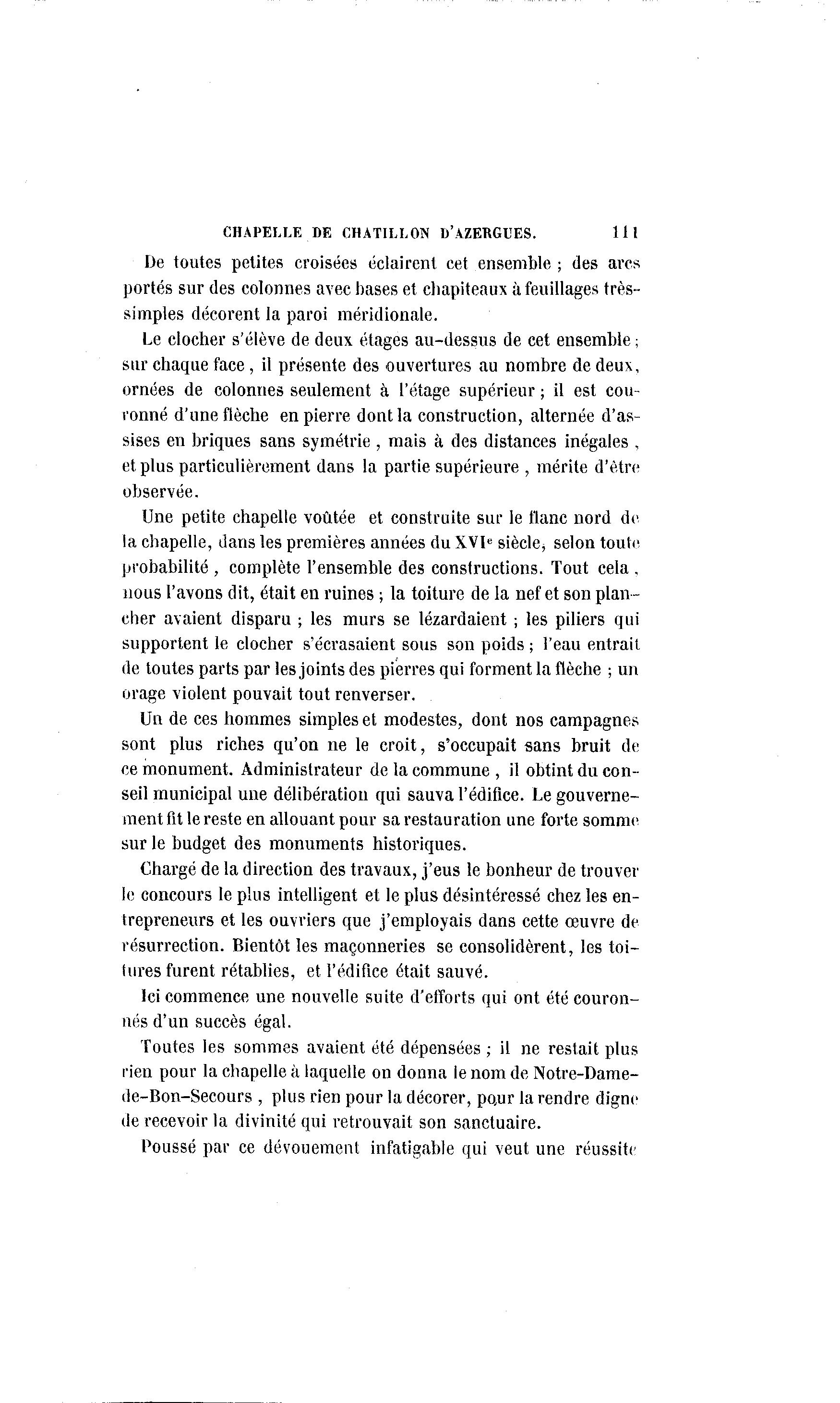 CHAPELLE DE CHATILLON D'AZERGl'ES. Ht De toutes petites croisées éclairent cet ensemble ; des arcs portés sur des colonnes avec hases et chapiteaux à feuillages très- simples décorent la paroi méridionale. Le clocher s'élève de deux étages au-dessus de cet ensemble ; sur chaque face, il présente des ouvertures au nombre de deux, ornées de colonnes seulement à l'étage supérieur ; il est cou- ronné d'une flèche en pierre dont la construction, alternée d'as- sises en briques sans symétrie , mais à des distances inégales , et plus particulièrement dans la partie supérieure , mérite d'être observée. Une petite chapelle voûtée et construite sur le flanc nord de la chapelle, dans les premières années du XVIe siècle^ selon toute probabilité , complète l'ensemble des constructions. Tout cela , nous l'avons dit, était en ruines ; la toiture de la nef et son plan- cher avaient disparu ; les murs se lézardaient ; les piliers qui supportent le clocher s'écrasaient sous son poids ; l'eau entrait de toutes parts par les joints des pierres qui forment la flèche ; un orage violent pouvait tout renverser. Un de ces hommes simples et modestes, dont nos campagnes sont plus riches qu'on ne le croit, s'occupait sans bruit de ce monument. Administrateur de la commune , il obtint du con- seil municipal une délibération qui sauva l'édifice. Le gouverne- ment fit le reste en allouant pour sa restauration une forte somme sur le budget des monuments historiques. Chargé de la direction des travaux, j'eus le bonheur de trouver le concours le plus intelligent et le plus désintéressé chez les en- trepreneurs et les ouvriers que j'employais dans cette œuvre de résurrection. Bientôt les maçonneries se consolidèrent, les toi- tures furent rétablies, et l'édifice était sauvé. Ici commence une nouvelle suite d'efforts qui ont été couron- nés d'un succès égal. Toutes les sommes avaient été dépensées ; il ne restait plus rien pour la chapelle à laquelle on donna le nom de Notre-Dame- de-Bon-Secours , plus rien pour la décorer, pour la rendre digne de recevoir la divinité qui retrouvait son sanctuaire. Poussé par ce dévouement infatigable qui veut une réussite