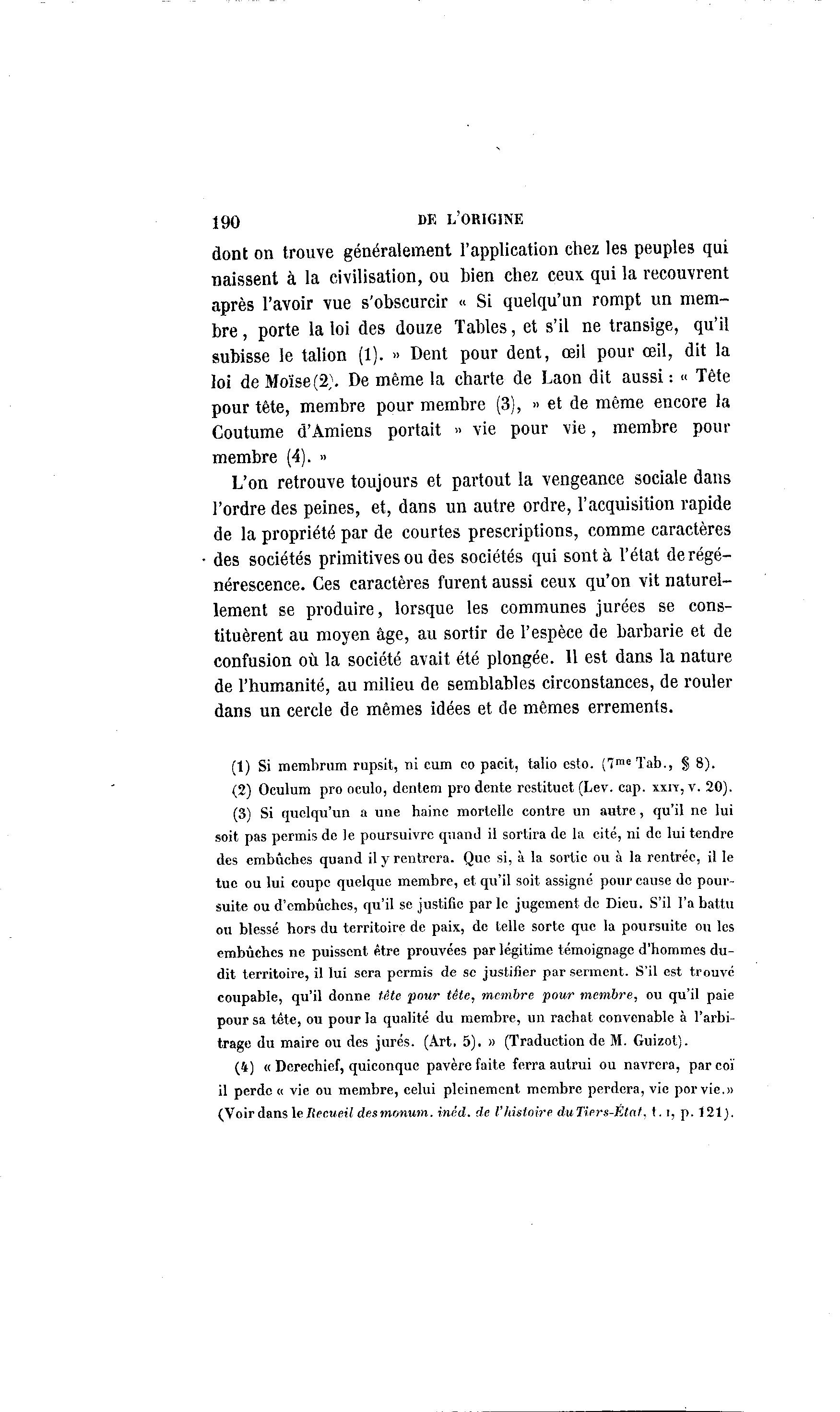 190 DE L'ORIGINE dont on trouve généralement l'application chez les peuples qui naissent à la civilisation, ou bien chez ceux qui la recouvrent après l'avoir vue s'obscurcir « Si quelqu'un rompt un mem- bre , porte la loi des douze Tables, et s'il ne transige, qu'il subisse le talion (1). » Dent pour dent, œil pour œil, dit la loi de Moïse (2\ De même la charte de Laon dit aussi : « Tète pour tête, membre pour membre (3), » et de même encore la Coutume d'Amiens portait » vie pour vie, membre pour membre (4). » L'on retrouve toujours et partout la vengeance sociale dans l'ordre des peines, et, dans un autre ordre, l'acquisition rapide de la propriété par de courtes prescriptions, comme caractères des sociétés primitives ou des sociétés qui sont à l'état derégé- nérescence. Ces caractères furent aussi ceux qu'on vit naturel- lement se produire, lorsque les communes jurées se cons- tituèrent au moyen âge, au sortir de l'espèce de barbarie et de confusion où la société avait été plongée. 11 est dans la nature de l'humanité, au milieu de semblables circonstances, de rouler dans un cercle de mêmes idées et de mêmes errements. (1) Si membrum rupsit, ni cum eo pacit, talio csto. (7 m c Tab., § 8). (2) Oculum pro oculo, dentcm pro dente restituet (Lev. cap. XXIY, v. 20). (3) Si quelqu'un a une haine mortelle contre un autre, qu'il ne lui soit pas permis de le poursuivre quand il sortira de la cité, ni de lui tendre des embûches quand il y rentrera. Que si, à la sortie ou à la rentrée, il le tue ou lui coupe quelque membre, et qu'il soit assigné pour cause de pour- suite ou d'embûches, qu'il se justifie par le jugement de Dieu. S'il l'a battu ou blessé hors du territoire de paix, de telle sorte que la poursuite ou les embûches ne puissent être prouvées par légitime témoignage d'hommes du- dit territoire, il lui sera permis de se justifier par serment. S'il est trouvé coupable, qu'il donne tète pour tête, membre pour membre, ou qu'il paie pour sa tête, ou pour la qualité du membre, un rachat convenable à l'arbi- trage du maire ou des jurés. (Art, 5). » (Traduction de M. Guizot). (4) « Derechief, quiconque pavère faite ferra autrui ou navrera, parcoï il perde « vie ou membre, celui pleinement membre perdera, vie por vie.» (Voir dans le Recueil des monmn. inéd. de l'histoire duTiers-État. t. i, p. 121).