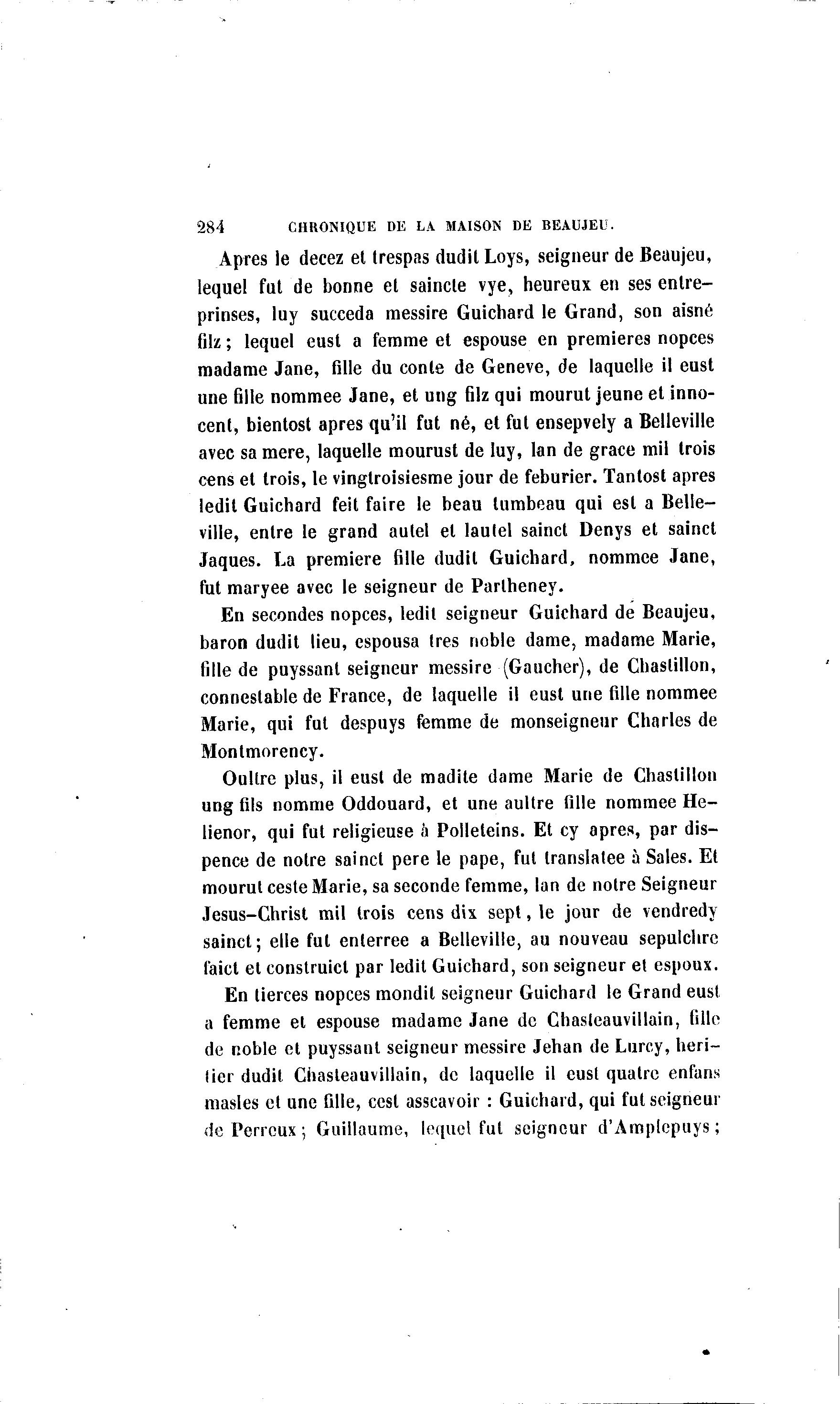 284 CHRONIQUE DE LA MAISON DE BEAUJEU. Apres le decez et trespas dudit Loys, seigneur de Beaujeu, lequel fut de bonne et saincte vye, heureux en ses enlre- prinses, luy succéda messire Guichard le Grand, son aisné filz ; lequel eust a femme et espouse en premières nopces madame Jane, fille du conte de Genève, de laquelle il eust une fille nommée Jane, et ung filz qui mourut jeune et inno- cent, bientost après qu'il fut né, et fut ensepvely a Belleville avec sa mère, laquelle mourust de luy, lan de grâce mil trois cens et trois, le vingtroisiesme jour de feburier. Tantost après ledit Guichard feit faire le beau lumbeau qui est a Belle- ville, entre le grand autel et laulel sainct Denys et sainct Jaques. La première fille dudit Guichard, nommée Jane, fut maryee avec le seigneur de Parlheney. En secondes nopces, ledit seigneur Guichard de Beaujeu, baron dudit lieu, espousa très noble dame, madame Marie, fille de puyssant seigneur messire (Gaucher), de Chaslillon, connestable de France, de laquelle il eust une fille nommée Marie, qui fut despuys femme de monseigneur Charles de Montmorency. Oullre plus, il eust de madile dame Marie de Chaslillon ung fils nomme Oddouard, et une aultre fille nommée He- lienor, qui fut religieuse a Polleteins. Et cy après, par dis- pence de notre sainct père le pape, fut translatée à Sales. Et mourut ceste Marie, sa seconde femme, lan de notre Seigneur Jesus-Christ mil trois cens dix sept, le jour de vendredy sainct; elle fut enterrée a Belleville, au nouveau sepulclire faict et construict par ledit Guichard, son seigneur et espoux. En tierces nopces mondit seigneur Guichard le Grand eus! a femme et espouse madame Jane de Chasleauvillain, fille de noble et puyssant seigneur messire Jehan de Lurcy, heri- lier dudit Chasleauvillain, de laquelle il eusl quatre enfans masles et une fille, cest asscavoir : Guichard, qui fut seigneur de Perrcux ; Guillaume, lequel fut seigneur d'Amplcpuys ;