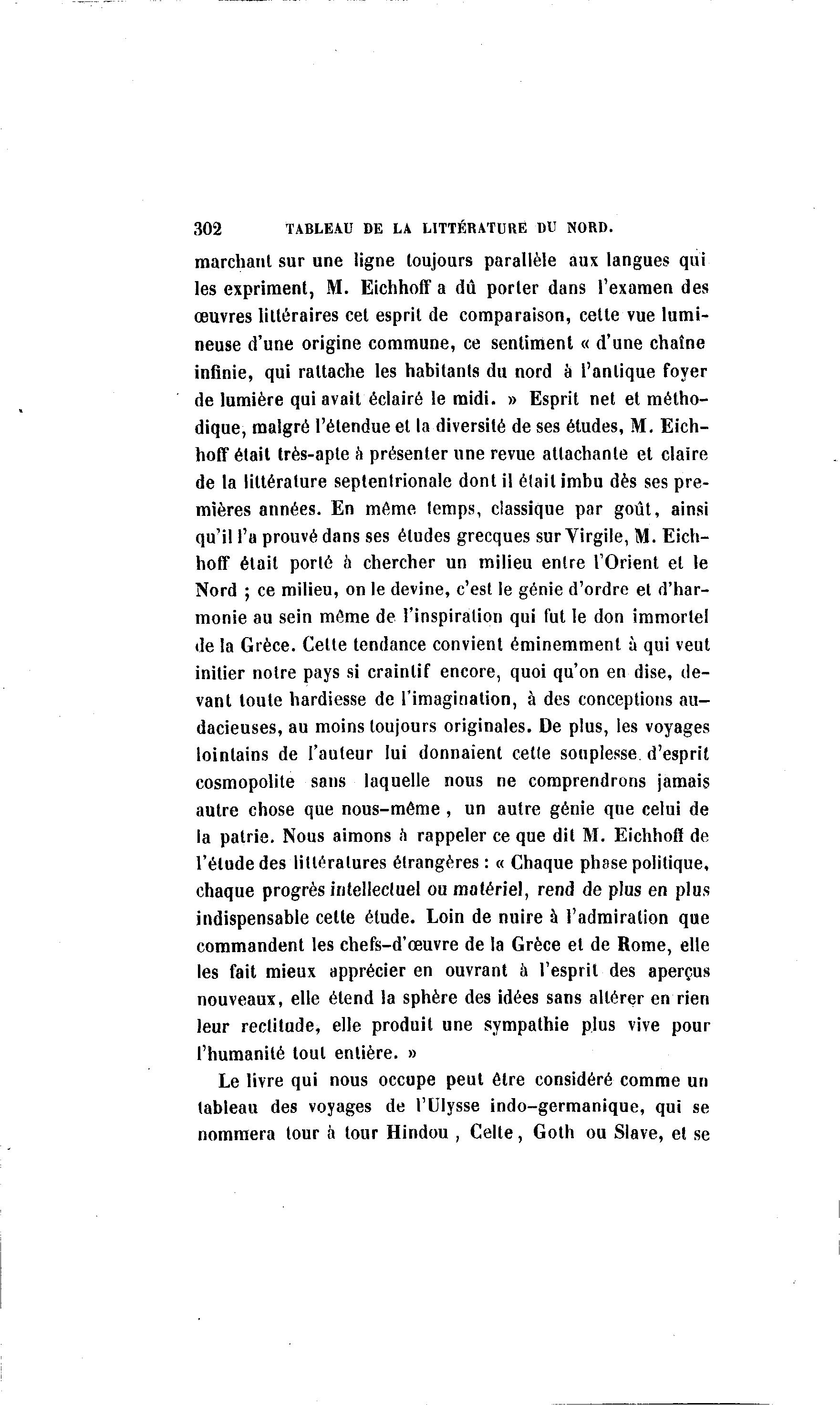 302 TABLEAU DE LA LITTÉRATURE DU NORD. marchant sur une ligne toujours parallèle aux langues qui les expriment, M. Eichhoff a dû porter dans l'examen des œuvres littéraires cet esprit de comparaison, cette vue lumi- neuse d'une origine commune, ce sentiment « d'une chaîne infinie, qui rattache les habitants du nord à l'antique foyer de lumière qui avait éclairé le midi. » Esprit net et métho- dique, malgré l'étendue et la diversité de ses études, M. Eich- hoff était très-apte à présenter une revue attachante et claire de la littérature septentrionale dont il élailimbu dès ses pre- mières années. En même lemps, classique par goût, ainsi qu'il l'a prouvé dans ses études grecques sur Virgile, M. Eich- hoff était porté à chercher un milieu enlre l'Orient et le Nord ; ce milieu, on le devine, c'est le génie d'ordre et d'har- monie au sein môme de l'inspiration qui fut le don immortel de la Grèce. Cette tendance convient éminemment à qui veut initier notre pays si craintif encore, quoi qu'on en dise, de- vant toute hardiesse de l'imagination, à des conceptions au- dacieuses, au moins toujours originales. De plus, les voyages lointains de l'auteur lui donnaient cette souplesse d'esprit cosmopolite sans laquelle nous ne comprendrons jamais autre chose que nous-même , un autre génie que celui de la patrie. Nous aimons a rappeler ce que dit M. Eichhoff de l'élude des littératures étrangères : « Chaque phase politique, chaque progrès intellectuel ou matériel, rend de plus en plus indispensable cette élude. Loin de nuire à l'admiration que commandent les chefs-d'œuvre de la Grèce el de Rome, elle les fait mieux apprécier en ouvrant à l'esprit des aperçus nouveaux, elle étend la sphère des idées sans altérer en rien leur rectitude, elle produit une sympathie plus vive pour l'humanité tout entière. » Le livre qui nous occupe peut être considéré comme un tableau des voyages de l'Ulysse indo-germanique, qui se nommera tour à tour Hindou , Celte, Goth ou Slave, el se