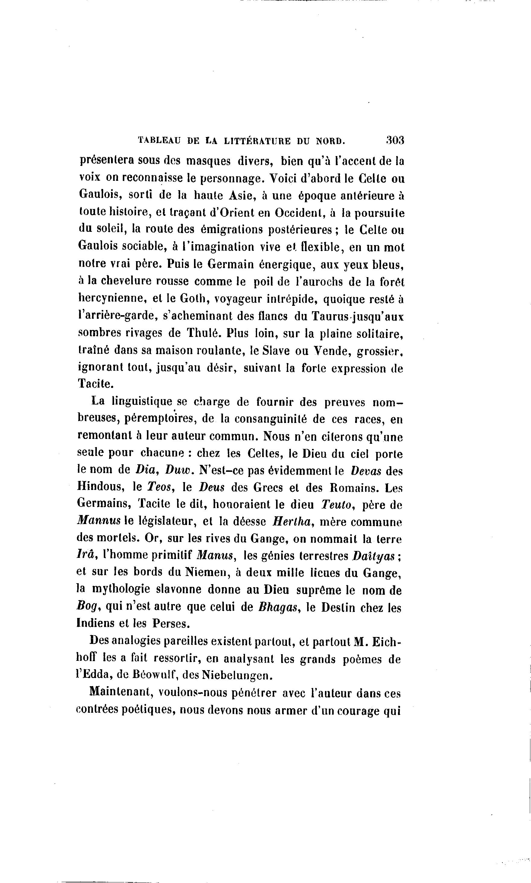 TABLEAU DE t \ LITTÉRATURE DU NORD. 303 présentera sous des masques divers, bien qu'ù l'accent de la voix on reconnaisse le personnage. Voici d'abord le Celle ou Gaulois, sorti de la haute Asie, à une époque antérieure à toute histoire, et traçant d'Orient en Occident, à la poursuite du soleil, la route des émigrations postérieures ; le Celte ou Gaulois sociable, à l'imagination vive et flexible, en un mot notre vrai père. Puis le Germain énergique, aux yeux bleus, à la chevelure rousse comme le poil de l'aurochs de la forêt hercynienne, et le Goth, voyageur intrépide, quoique resté à l'arrière-garde, s'acheminant des flancs du Taurus jusqu'aux sombres rivages de Thulé. Plus loin, sur la plaine solitaire, traîné dans sa maison roulante, le Slave ou Vende, grossier, ignorant tout, jusqu'au désir, suivant la forte expression de Tacite. La linguistique se charge de fournir des preuves nom- breuses, péremptoires, de la consanguinité de ces races, en remontant à leur auteur commun. Nous n'en citerons qu'une seule pour chacune : chez les Celtes, le Dieu du ciel porte le nom de Dia, Duw. N'est-ce pas évidemment le Devas des Hindous, le Teos, le Deus des Grecs et des Romains. Les Germains, Tacite le dit, honoraient le dieu Teuto, père de Mannus le législateur, et la déesse Hertha, mère commune des mortels. Or, sur les rives du Gange, on nommait la terre Ira, l'homme primitif Manus, les génies terrestres Daîtyas ; et sur les bords du Niémen, à deux mille lieues du Gange, la mythologie slavonne donne au Dieu suprême le nom de Bog, qui n'est autre que celui de Bhagas, le Destin chez les Indiens et les Perses. Des analogies pareilles existent partout, et partout M. Eich- hoff les a fait ressortir, en analysant les grands poèmes de l'Edda, de Béownlf, desNiebelungen. Maintenant, voulons-nous pénétrer avec l'auteur dans ces contrées poétiques, nous devons nous armer d'un courage qui