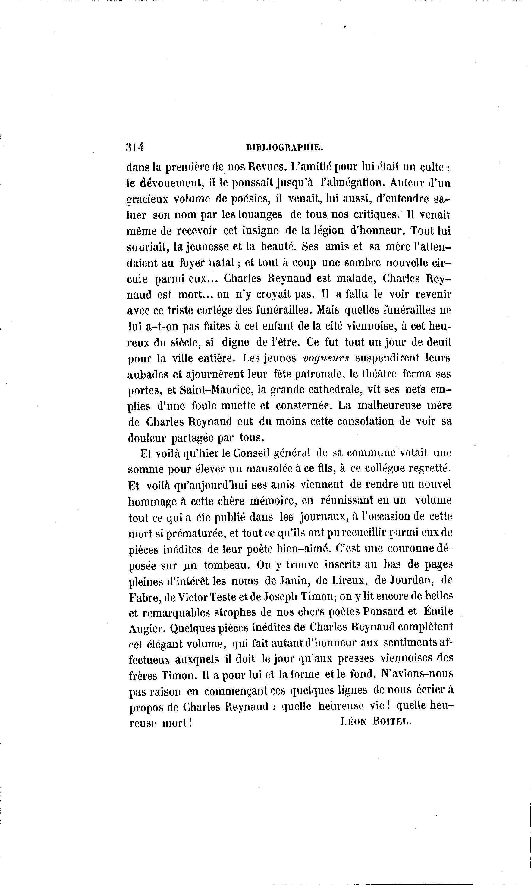 314 BIBLIOGRAPHIE. dans la première de nos Revues. L'amitié pour lui était un culte ; le dévouement, il le poussait jusqu'à l'abnégation. Auteur d'un gracieux volume de poésies, il venait, lui aussi, d'entendre sa- luer son nom par les louanges de tous nos critiques. 11 venait même de recevoir cet insigne de la légion d'honneur. Tout lui souriait, la jeunesse et la beauté. Ses amis et sa mère l'atten- daient au foyer natal ; et tout à coup une sombre nouvelle cir- cule parmi eux... Charles Reynaud est malade, Charles Rey- naud est mort... on n'y croyait pas. Il a fallu le voir revenir avec ce triste cortège des funérailles. Mais quelles funérailles ne lui a-t-on pas faites à cet enfant de la cité viennoise, à cet heu- reux du siècle, si digne de l'être. Ce fut tout un jour de deuil pour la ville entière. Les jeunes vogueurs suspendirent leurs aubades et ajournèrent leur fête patronale, le théâtre ferma ses portes, et Saint-Maurice, la grande cathédrale, vit ses nefs em- plies d'une foule muette et consternée. La malheureuse mère de Charles Reynaud eut du moins cette consolation de voir sa douleur partagée par tous. Et voilà qu'hier le Conseil général de sa commune votait une somme pour élever un mausolée à ce fils, à ce collègue regretté. Et voilà qu'aujourd'hui ses amis viennent de rendre un nouvel hommage à cette chère mémoire, en réunissant en un volume tout ce qui a été publié dans les journaux, à l'occasion de cette mort si prématurée, et tout ce qu'ils ont pu recueillir parmi eux de pièces inédites de leur poète bien-aimé. C'est une couronne dé- posée sur jin tombeau. On y trouve inscrits au bas de pages pleines d'intérêt les noms de Janin, de Lireux, de Jourdan, de Fabre, de Victor Teste et de Joseph Timon; on y lit encore de belles et remarquables strophes de nos chers poètes Ponsard et Emile Augier. Quelques pièces inédites de Charles Reynaud complètent cet élégant volume, qui fait autant d'honneur aux sentiments af- fectueux auxquels il doit le jour qu'aux presses viennoises des frères Timon. Il a pour lui et la forme et le fond. N'avions-nous pas raison en commençant ces quelques lignes de nous écrier à propos de Charles Reynaud : quelle heureuse vie ! quelle heu- reuse mort! LÉON BOITEL.