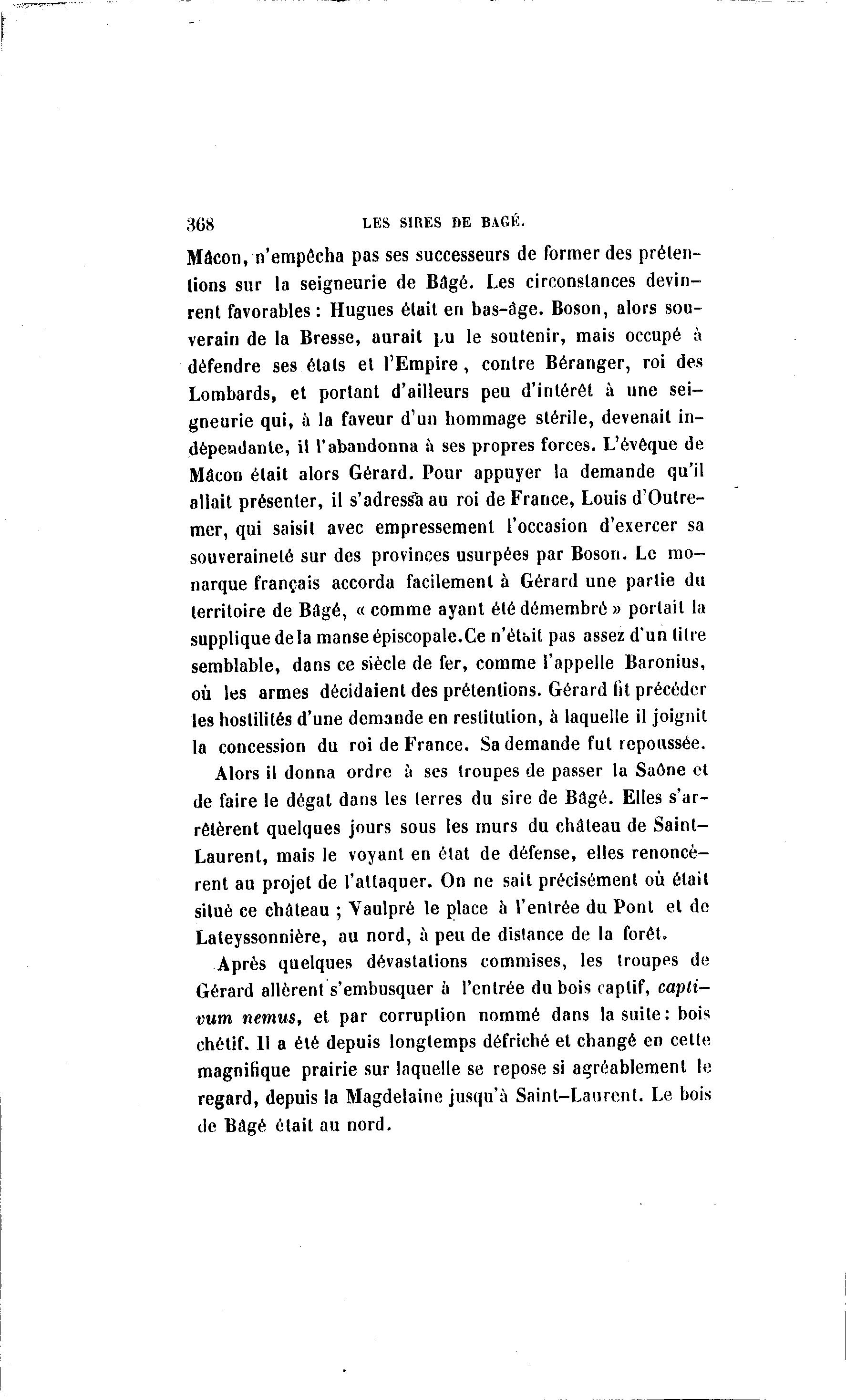 368 LES SIRES DE BAGÉ. Mâcon, n'empêcha pas ses successeurs de former des préten- tions sur la seigneurie de Bâgé. Les circonstances devin- rent favorables : Hugues était en bas-âge. Boson, alors sou- verain de la Bresse, aurait i,u le soutenir, mais occupé à défendre ses états et l'Empire , contre Béranger, roi des Lombards, et portant d'ailleurs peu d'intérêt à une sei- gneurie qui, à la faveur d'un hommage stérile, devenait in- dépendante, il l'abandonna à ses propres forces. L'évêque de Mâcon était alors Gérard. Pour appuyer la demande qu'il allait présenter, il s'adressa au roi de France, Louis d'Outre- mer, qui saisit avec empressement l'occasion d'exercer sa souveraineté sur des provinces usurpées par Boson. Le mo- narque français accorda facilement à Gérard une partie du territoire de Bâgé, « comme ayant été démembré » portait la supplique delà manseépiscopale.Ce n'était pas assez d'un litre semblable, dans ce siècle de fer, comme l'appelle Baronius, où les armes décidaient des prétentions. Gérard fit précéder les hostilités d'une demande en restitution, à laquelle il joignit la concession du roi de France. Sa demande fut repoussée. Alors il donna ordre ù ses troupes de passer la Saône et de faire le dégât dans les terres du sire de Bâgé. Elles s'ar- rêtèrent quelques jours sous les murs du château de Saint- Laurent, mais le voyant en état de défense, elles renoncè- rent au projet de l'attaquer. On ne sait précisément où était situé ce château ; Yaulprê le place à l'entrée du Pont et de Laleyssonnière, au nord, à peu de distance de la forêt. Après quelques dévastations commises, les troupes de Gérard allèrent s'embusquer à l'entrée du bois captif, capti- vum netnus, et par corruption nommé dans la suite: bois chétif. Il a été depuis longtemps défriché et changé en cette magnifique prairie sur laquelle se repose si agréablement le regard, depuis la Magdelaine jusqu'à Saint-Laurent. Le bois de Bâgé était au nord.