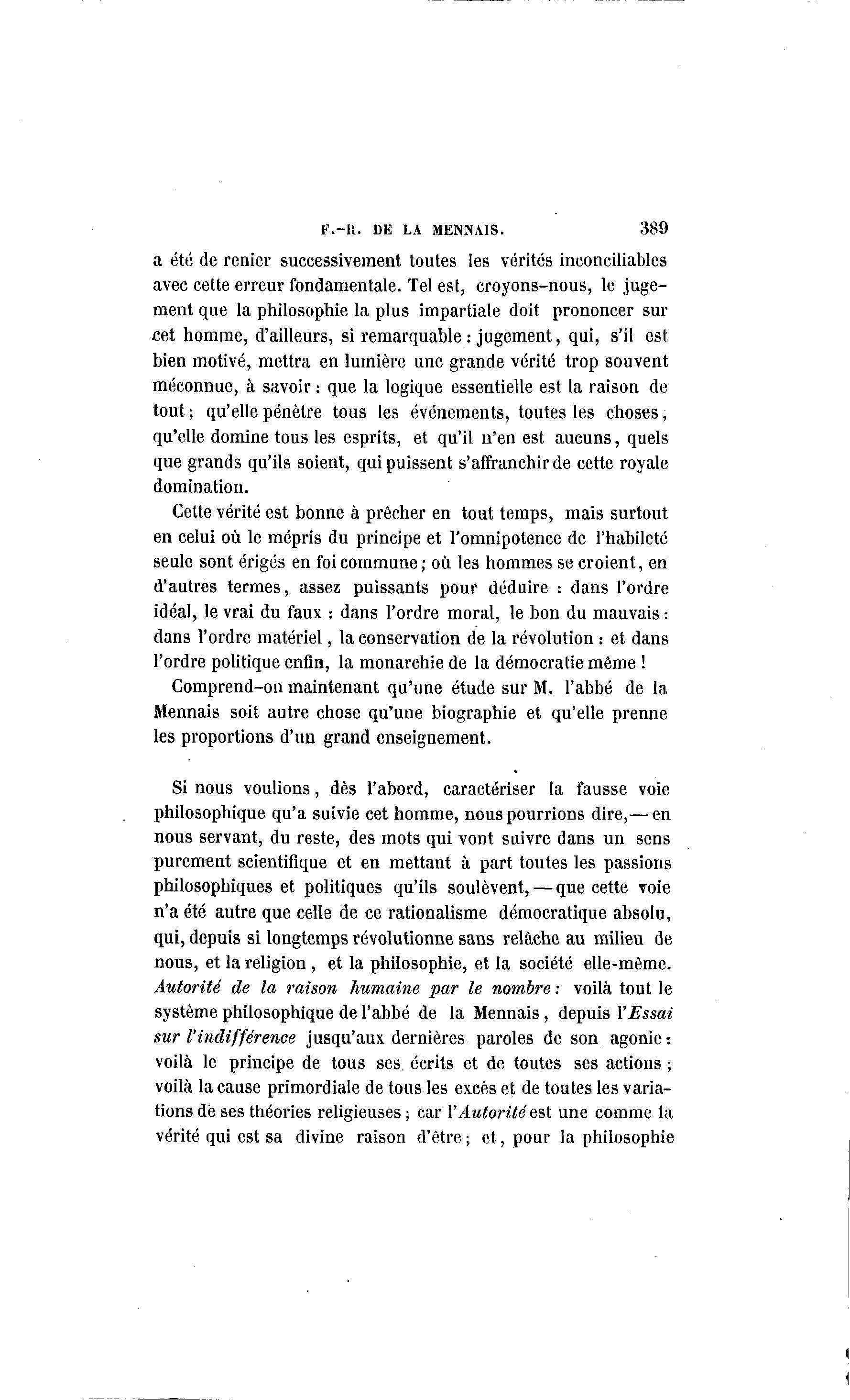F.-il. DE LA MENNAIS. 389 a été de renier successivement toutes les vérités inconciliables avec cette erreur fondamentale. Tel est, croyons-nous, le juge- ment que la philosophie la plus impartiale doit prononcer sur cet homme, d'ailleurs, si remarquable : jugement, qui, s'il est bien motivé, mettra en lumière une grande vérité trop souvent méconnue, à savoir : que la logique essentielle est la raison de tout ; qu'elle pénètre tous les événements, toutes les choses, qu'elle domine tous les esprits, et qu'il n'en est aucuns, quels que grands qu'ils soient, qui puissent s'affranchir de cette royale domination. Cette vérité est bonne à prêcher en tout temps, mais surtout en celui où le mépris du principe et l'omnipotence de l'habileté seule sont érigés en foi commune; où les hommes se croient, en d'autres termes, assez puissants pour déduire : dans l'ordre idéal, le vrai du faux : dans l'ordre moral, le bon du mauvais : dans l'ordre matériel, la conservation de la révolution : et dans l'ordre politique enfin, la monarchie de la démocratie même ! Comprend-on maintenant qu'une étude sur M. l'abbé de la Mennais soit autre chose qu'une biographie et qu'elle prenne les proportions d'un grand enseignement. Si nous voulions, dès l'abord, caractériser la fausse voie philosophique qu'a suivie cet homme, nous pourrions dire,— en nous servant, du reste, des mots qui vont suivre dans un sens purement scientifique et en mettant à part toutes les passions philosophiques et politiques qu'ils soulèvent, — que cette voie n'a été autre que celle de ce rationalisme démocratique absolu, qui, depuis si longtemps révolutionne sans relâche au milieu de nous, et la religion , et la philosophie, et la société elle-même. Autorité de la raison humaine par le nombre : voilà tout le système philosophique de l'abbé de la Mennais, depuis l'Essai sur l'indifférence jusqu'aux, dernières paroles de son agonie : voilà le principe de tous ses écrits et de toutes ses actions ; voilà la cause primordiale de tous les excès et de toutes les varia- tions dé ses théories religieuses ; car l'Autorité est une comme la vérité qui est sa divine raison d'être ; et, pour ia philosophie