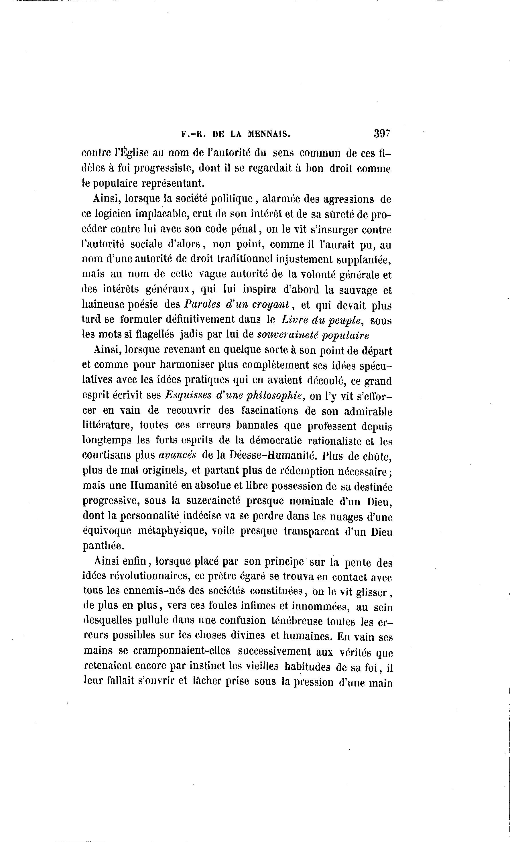 F.-R. DE LA MENNAIS. 397 contre l'Église au nom de l'autorité du sens commun de ces fi- dèles à foi progressiste, dont il se regardait à bon droit comme le populaire représentant. Ainsi, lorsque la société politique, alarmée des agressions de ce logicien implacable, crut de son intérêt et de sa sûreté de pro- céder contre lui avec son code pénal, on le vit s'insurger contre l'autorité sociale d'alors, non point, comme il l'aurait pu, au nom d'une autorité de droit traditionnel injustement supplantée, mais au nom de cette vague autorité de la volonté générale et des intérêts généraux, qui lui inspira d'abord la sauvage et haineuse poésie des Paroles d'un croyant, et qui devait plus tard se formuler définitivement dans le Livre du peuple, sous les mots si flagellés jadis par lui de souveraineté populaire Ainsi, lorsque revenant en quelque sorte à son point de départ et comme pour harmoniser plus complètement ses idées spécu- latives avec les idées pratiques qui en avaient découlé, ce grand esprit écrivit ses Esquisses d'une philosophie, on l'y vit s'effor- cer en vain de recouvrir des fascinations de son admirable littérature, toutes ces erreurs bannales que professent depuis longtemps les forts esprits de la démocratie rationaliste et les courtisans plus avancés de la Déesse-Humanité. Plus de chute, plus de mal originels, et partant plus de rédemption nécessaire ; mais une Humanité en absolue et libre possession de sa destinée progressive, sous la suzeraineté presque nominale d'un Dieu, dont la personnalité indécise va se perdre dans les nuages d'une équivoque métaphysique, voile presque transparent d'un Dieu panthée. Ainsi enfin, lorsque placé par son principe sur la pente des idées révolutionnaires, ce prêtre égaré se trouva en contact avec tous les ennemis-nés des sociétés constituées, on le vit glisser, de plus en plus, vers ces foules infimes et innommées, au sein desquelles pullule dans une confusion ténébreuse toutes les er- reurs possibles sur les choses divines et humaines. En vain ses mains se cramponnaient-elles successivement aux vérités que retenaient encore par instinct les vieilles habitudes de sa foi, il leur fallait s'ouvrir et lâcher prise sous la pression d'une main