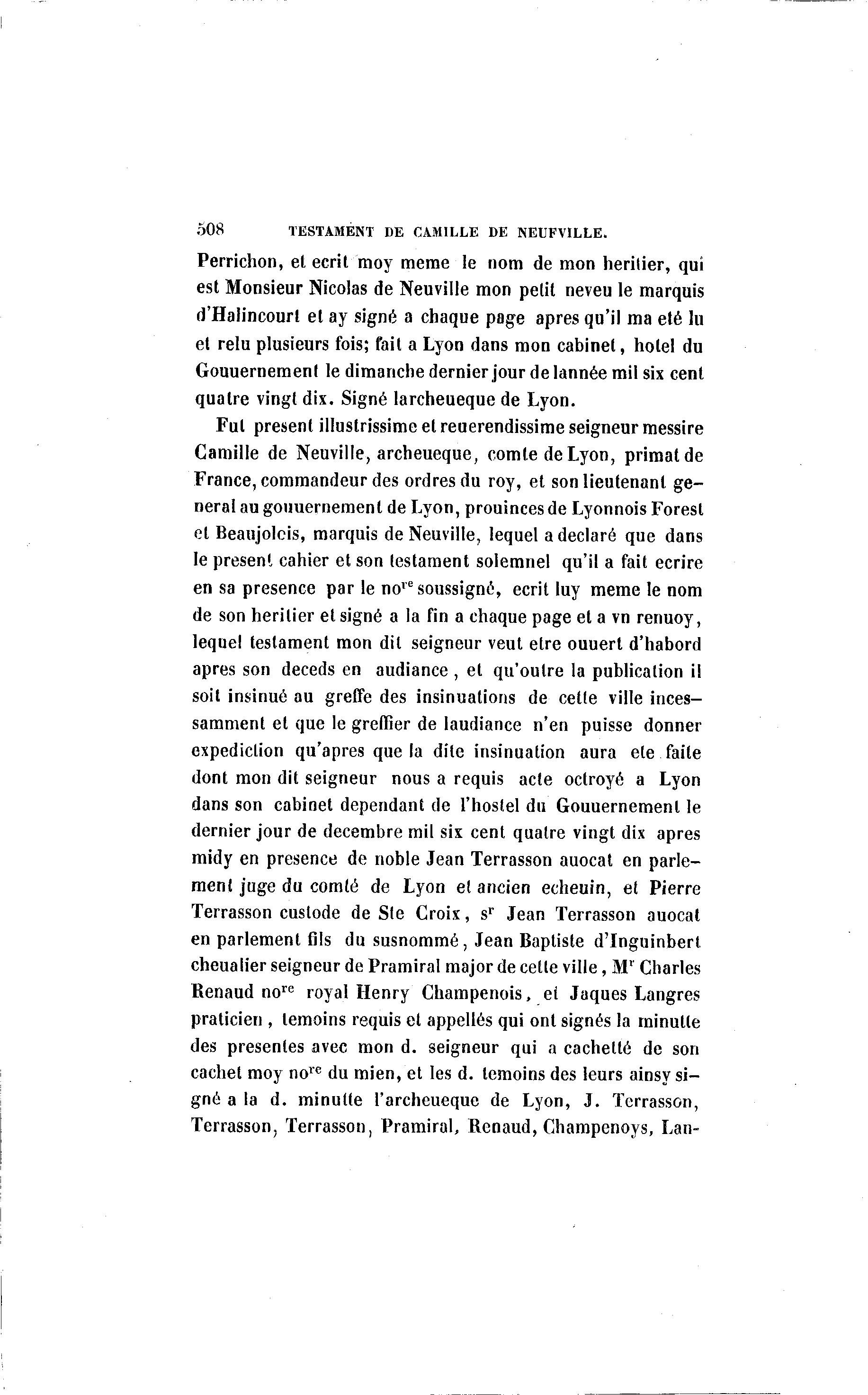 508 TESTAMENT DE CAMILLE DE NEUFVILLE. Perrichon, et écrit moy même le nom de mon héritier, qui est Monsieur Nicolas de Neuville mon petit neveu le marquis d'Halincourl et ay signé a chaque page après qu'il ma été lu et relu plusieurs fois; fait a Lyon dans mon cabinet, hôtel du Gouuernement le dimanche dernier jour de lannée mil six cent quatre vingt dix. Signé larcheueque de Lyon. Fut présent illustrissime et reuerendissime seigneur messire Camille de Neuville, archeueque, comte de Lyon, primat de France, commandeur des ordres du roy, et son lieutenant gê- nerai au gouuernement de Lyon, prouincesde Lyonnois Forest et Beaujolcis, marquis de Neuville, lequel a déclaré que dans le présent cahier et son testament solemnel qu'il a fait écrire en sa présence par le no,e soussigné, écrit luy même le nom de son héritier et signé a la fin a chaque page et a vn renuoy, lequel testament mon dit seigneur veut être ouuert d'habord après son deceds en audiance , et qu'outre la publication il soit insinué au greffe des insinuations de cette ville inces- samment et que le greffier de laudiance n'en puisse donner expediction qu'après que la dite insinuation aura ete faite dont mon dit seigneur nous a requis acte octroyé a Lyon dans son cabinet dépendant de l'hoslel du Gouuernement le dernier jour de décembre mil six cent quatre vingt dix après midy en présence de noble Jean Terrasson auocat en parle- ment juge du comté de Lyon et ancien echeuin, et Pierre Terrasson custode de Ste Croix, sr Jean Terrasson auocat en parlement fils du susnommé, Jean Baptiste d'Inguinbert cheualier seigneur de Pramiral major de cette ville, M1 Charles Renaud nore royal Henry Champenois, et Jaques Langres praticien , témoins requis et appelles qui ont signés la minutie des présentes avec mon d. seigneur qui a cachette de son cachet moy nore du mien, et les d. témoins des leurs ainsy si- gné a la d. minulte l'archeueque de Lyon, J. Terrasson, Terrasson, Terrasson, Pramiral, Renaud, Champenoys, Lan-