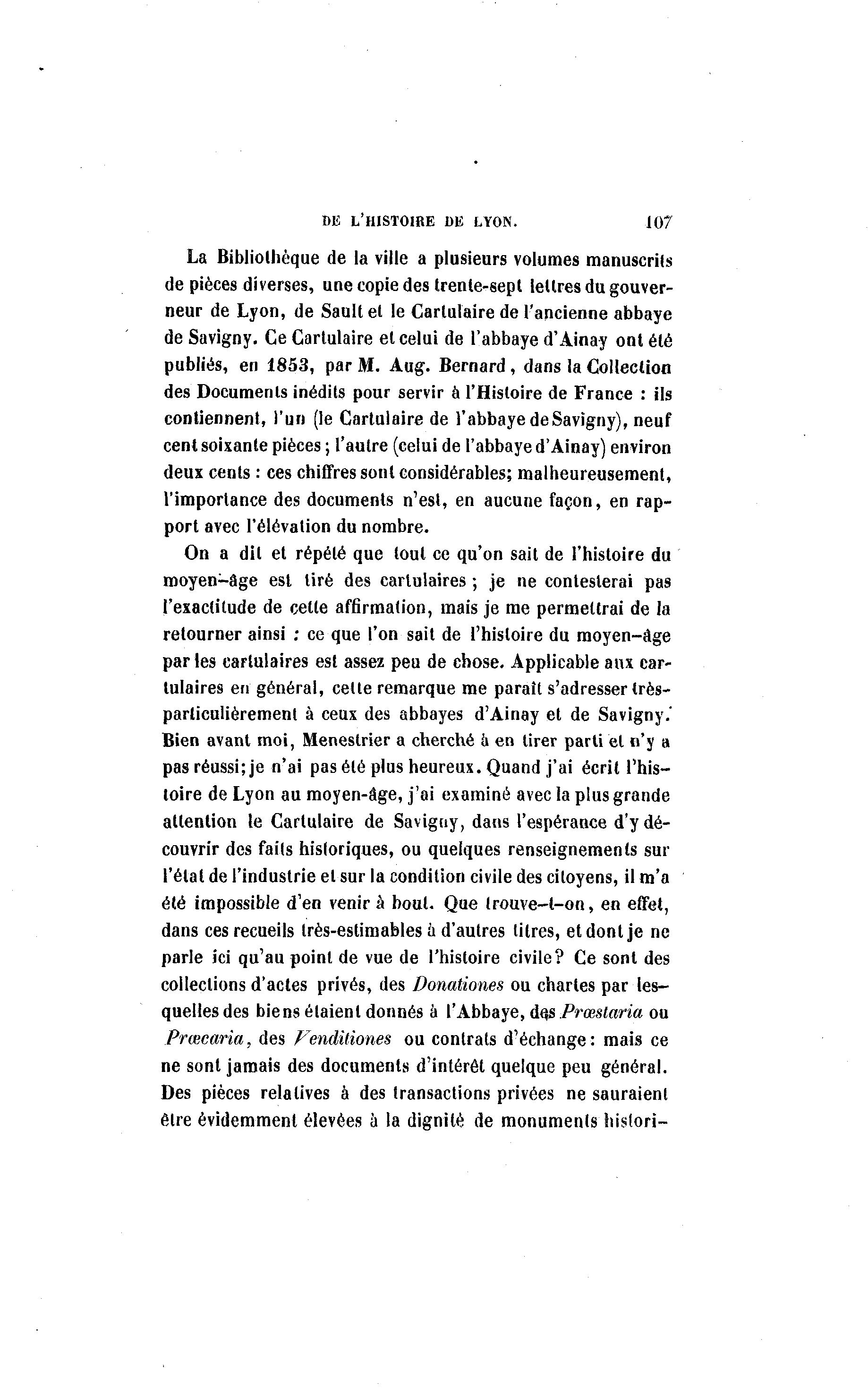 DE L'HISTOIRE DE LYON. 107 La Bibliothèque de la ville a plusieurs volumes manuscrits de pièces diverses, une copie des trente-sept lettres du gouver- neur de Lyon, de Sault et le Cartulaire de l'ancienne abbaye de Savigny. Ce Cartulaire et celui de l'abbaye d'Ainay ont été publiés, en 1853, par M. Aug. Bernard , dans la Collection des Documents inédits pour servir à l'Histoire de France : ils contiennent, l'un (le Cartulaire de l'abbaye de Savigny), neuf cent soixante pièces ; l'autre (celui de l'abbaye d'Ainay) environ deux cents : ces chiffres sont considérables; malheureusement, l'importance des documents n'est, en aucune façon, en rap- port avec l'élévation du nombre. On a dit et répété que tout ce qu'on sait de l'histoire du moyen-âge est tiré des carlulaires ; je ne contesterai pas l'exactitude de cette affirmation, mais je me permettrai de la retourner ainsi : ce que l'on sait de l'histoire du moyen-âge parles eartulaires est assez peu de chose. Applicable aux car- lulaires en général, celte remarque me paraît s'adresser très- particulièrement à ceux des abbayes d'Ainay et de Savigny.' Bien avant moi, Menestrier a cherché à en tirer parti et n'y a pas réussi; je n'ai pas été plus heureux. Quand j'ai écrit l'his- toire de Lyon au moyen-âge, j'ai examiné avec la plus grande attention le Cartulaire de Savigny, dans l'espérance d'y dé- couvrir des faits historiques, ou quelques renseignements sur l'étal de l'industrie et sur la condition civile des citoyens, il m'a été impossible d'en venir à bout. Que Irouve-t-on, en effet, dans ces recueils très-estimables à d'autres litres, et dont je ne parle ici qu'au point de vue de l'histoire civile? Ce sont des collections d'actes privés, des Donationes ou chartes par les- quelles des biens étaient donnés â l'Abbaye, dqs Prœstaria ou Prœcaria, des Fenditiones ou contrats d'échange: mais ce ne sont jamais des documents d'intérêt quelque peu général. Des pièces relatives à des transactions privées ne sauraient être évidemment élevées a la dignité de monuments histori-