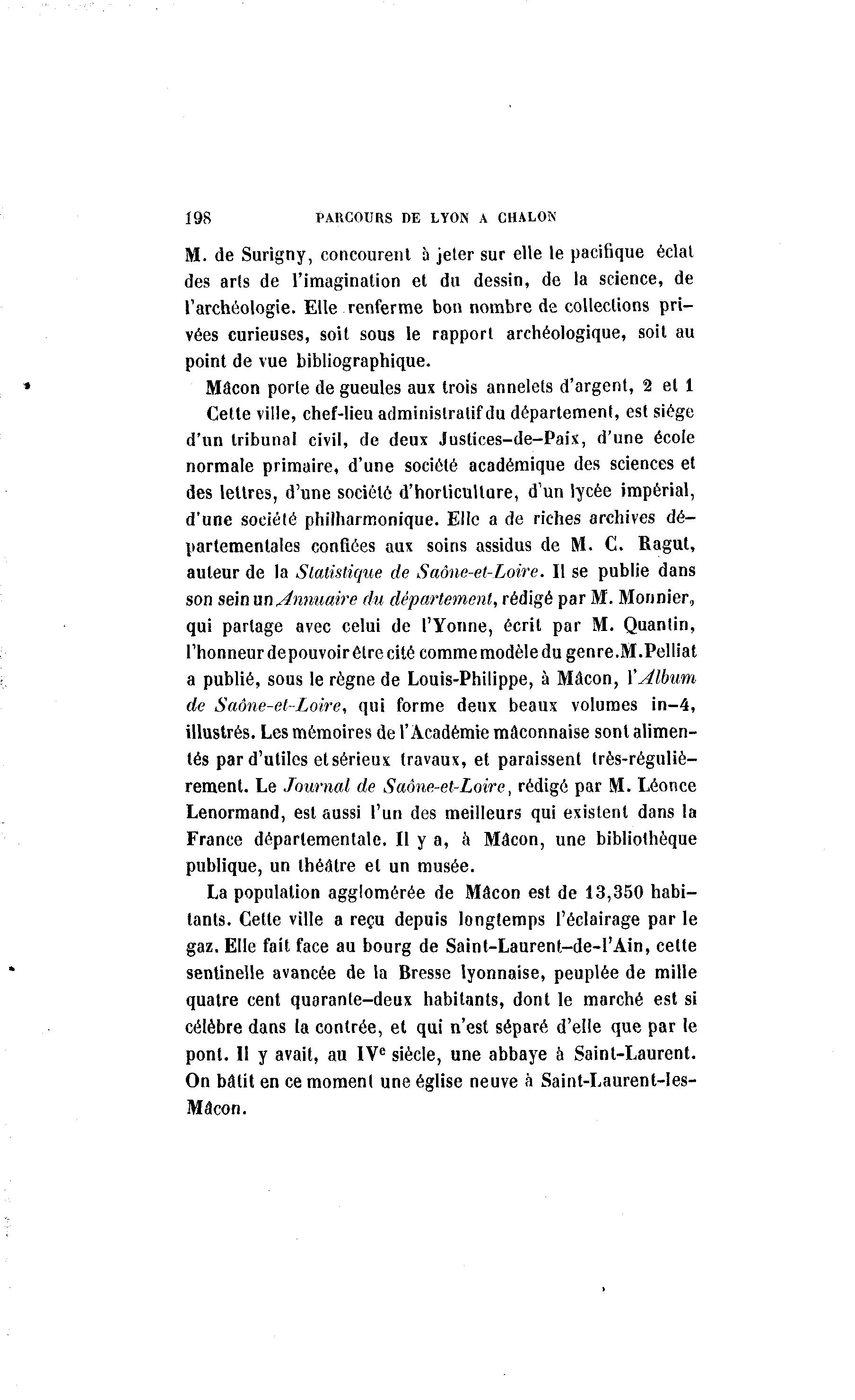 198 PARCOURS DE LYON A CHALON M. de Surigny, concourent à jeter sur elle le pacifique éclat des arts de l'imagination et du dessin, de la science, de l'archéologie. Elle renferme bon nombre de collections pri- vées curieuses, soit sous le rapport archéologique, soit au point de vue bibliographique. Mâcon porte de gueules aux trois annelets d'argent, 2 et 1 Cette ville, chef-lieu administratif du département, est siège d'un tribunal civil, de deux Justices-de-Paix, d'une école normale primaire, d'une société académique des sciences et des lettres, d'une société d'horticulture, d'un lycée impérial, d'une société philharmonique. Elle a de riches archives dé- partementales confiées aux soins assidus de M. C. Ragut, auteur de la Statistique de Saône-et-Loire. Il se publie dans son sein un Annuaire du département, rédigé par M. Monnier, qui partage avec celui de l'Yonne, écrit par M. Quantin, l'honneur depouvoir être cité comme modèle du genre.M.Pelliat a publié, sous le règne de Louis-Philippe, à Mâcon, XAlbum de Saône-et-Loire, qui forme deux beaux volumes in-4, illustrés. Les mémoires de l'Académie mâconnaise sont alimen- tés par d'utiles et sérieux travaux, et paraissent très-réguliè- rement. Le Journal de Saône-et-Loire, rédigé par M. Léonce Lenormand, est aussi l'un des meilleurs qui existent dans la France départementale. Il y a, à Mâcon, une bibliothèque publique, un théâtre et un musée. La population agglomérée de Mâcon est de 13,350 habi- tants. Cette ville a reçu depuis longtemps l'éclairage par le gaz. Elle fait face au bourg de Saint-Laurent-de-l'Ain, celte sentinelle avancée de la Bresse lyonnaise, peuplée de mille quatre cent quarante-deux habitants, dont le marché est si célèbre dans la contrée, et qui n'est séparé d'elle que par le pont. Il y avait, au IV e siècle, une abbaye à Saint-Laurent. On bâtit en ce moment une église neuve à Saint-Laurent-les- Mâcon.