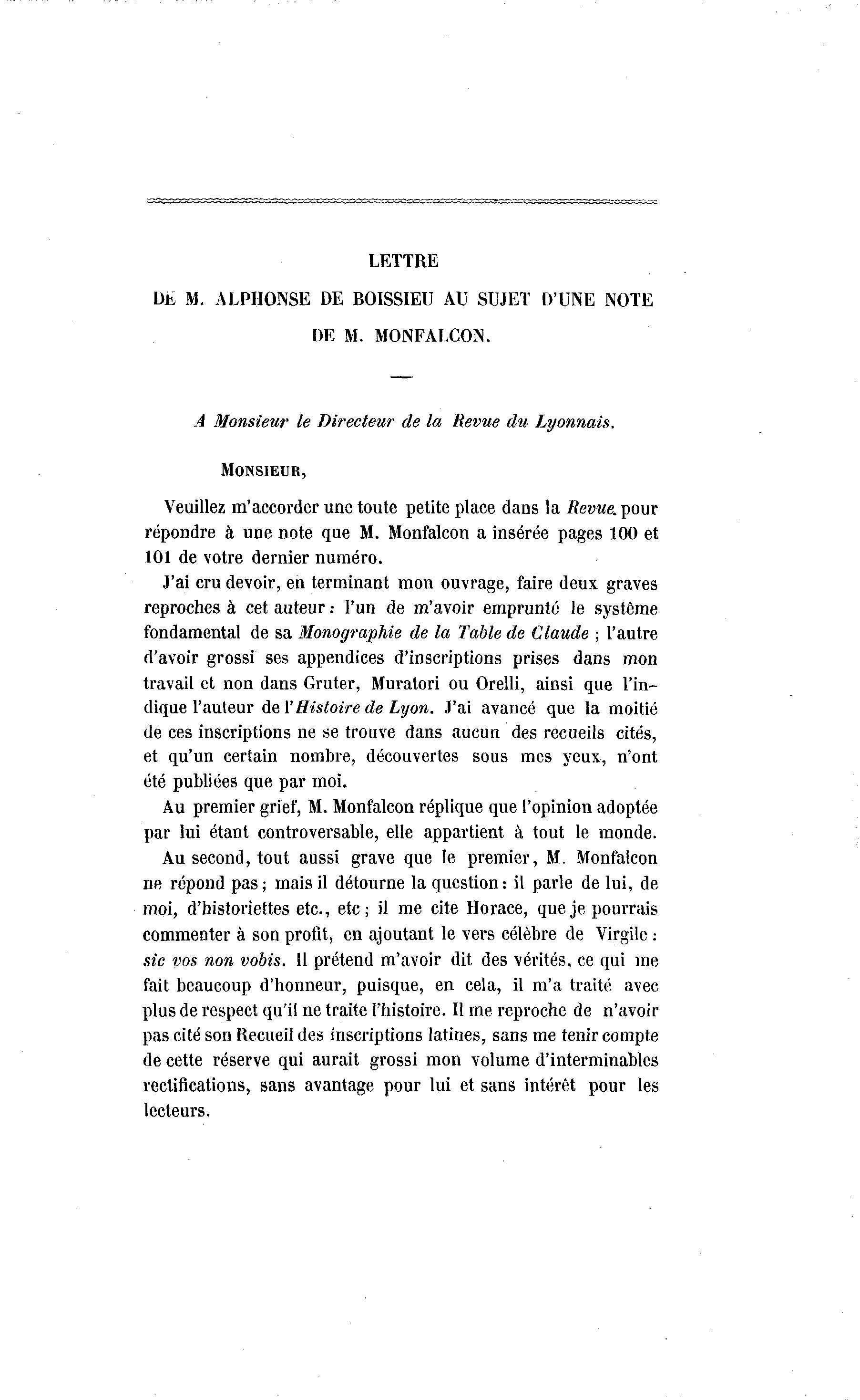 A Monsieur le Directeur de la Revue du Lyonnais.