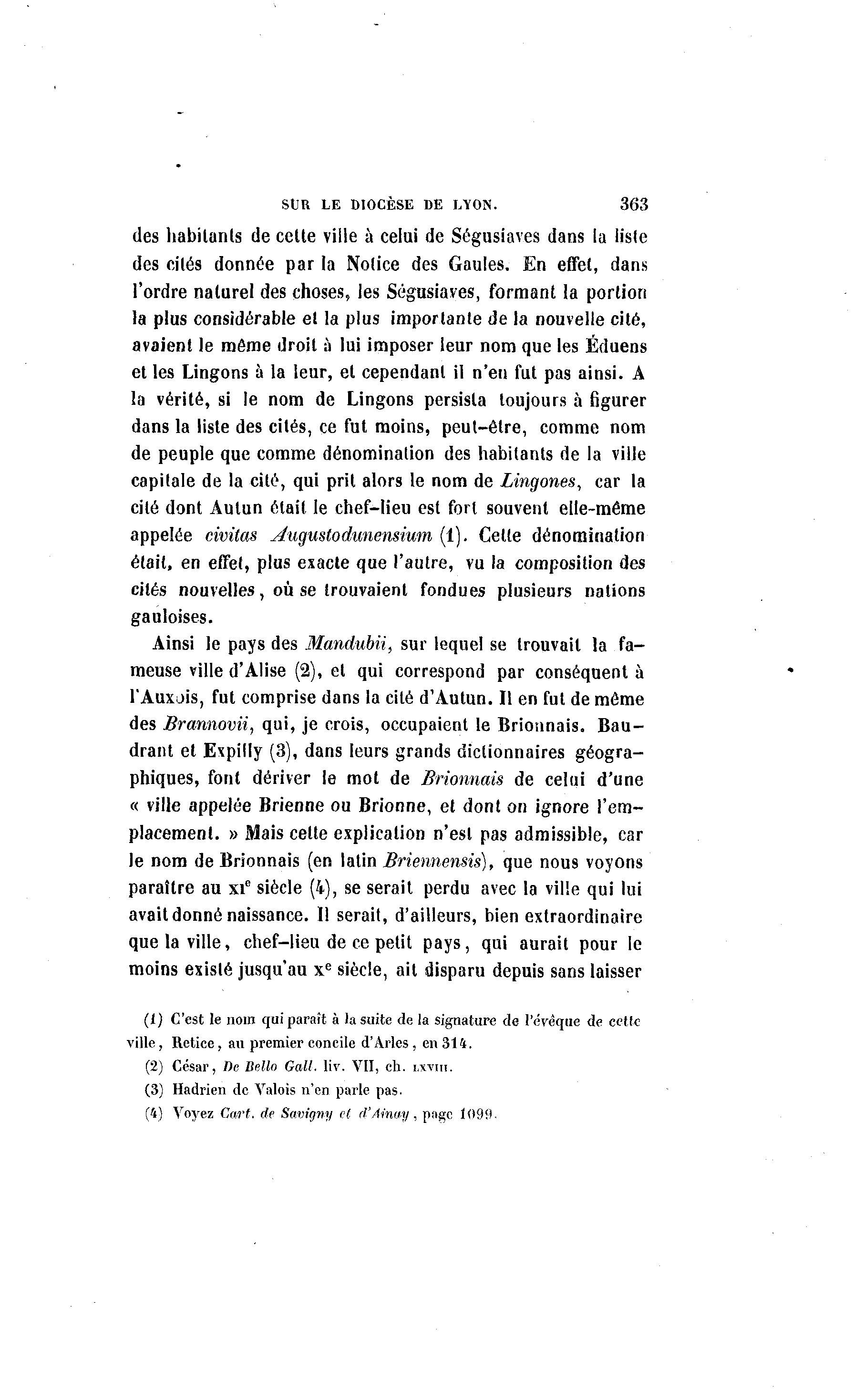 SUR LE DIOCÈSE DE LYON. 363 des habitants de cette ville à celui de Ségusiaves dans la liste des cités donnée par la Notice des Gaules. En effet, dans l'ordre naturel des choses, les Ségusiaves, formant la portion la plus considérable et la plus importante de la nouvelle cité, avaient le môme droit à lui imposer leur nom que les Éduens et les Lingons à la leur, et cependant il n'en fut pas ainsi. A la vérité, si le nom de Lingons persista toujours à figurer dans la liste des cités, ce fut moins, peut-être, comme nom de peuple que comme dénomination des habitants de la ville capitale de la cité, qui prit alors le nom de Lingones, car la cité dont Àutun était le chef-lieu est fort souvent elle-même appelée civitas jà ugustodunensium (1). Celte dénomination était, en effet, plus exacte que l'autre, vu la composition des cités nouvelles, où se trouvaient fondues plusieurs nations gauloises. Ainsi le pays des Mandubii, sur lequel se trouvait la fa- meuse ville d'Alise (2), et qui correspond par conséquent à l'Auxais, fut comprise dans la cité d'Autun. Il en fut de même des JBrannovii, qui, je crois, occupaient le Brionnais. Bau- drant et Expilly (3), dans leurs grands dictionnaires géogra- phiques, font dériver le mot de Brionnais de celui d'une « ville appelée Brienne ou Brionne, et dont on ignore l'em- placement. » Mais cette explication n'est pas admissible, car le nom de Brionnais (en latin Briennensis), que nous voyons paraître au xie siècle (4), se serait perdu avec la ville qui lui avait donné naissance. Il serait, d'ailleurs, bien extraordinaire que la ville, chef-lieu de ce petit pays, qui aurait pour le moins existé jusqu'au xe siècle, ail disparu depuis sans laisser (1) C'est le nom qui paraît à la suite de la signature de l'éVêque de cette ville, Retice, au premier concile d'Arles , en 314. (2) César, De Bello Galt. liv. VII, ch. i.xvm. (3) Hadrien de Valois n'en parle pas. (4) Voyez Cavt. de Savigny cl d'Ainuy , page 1099.