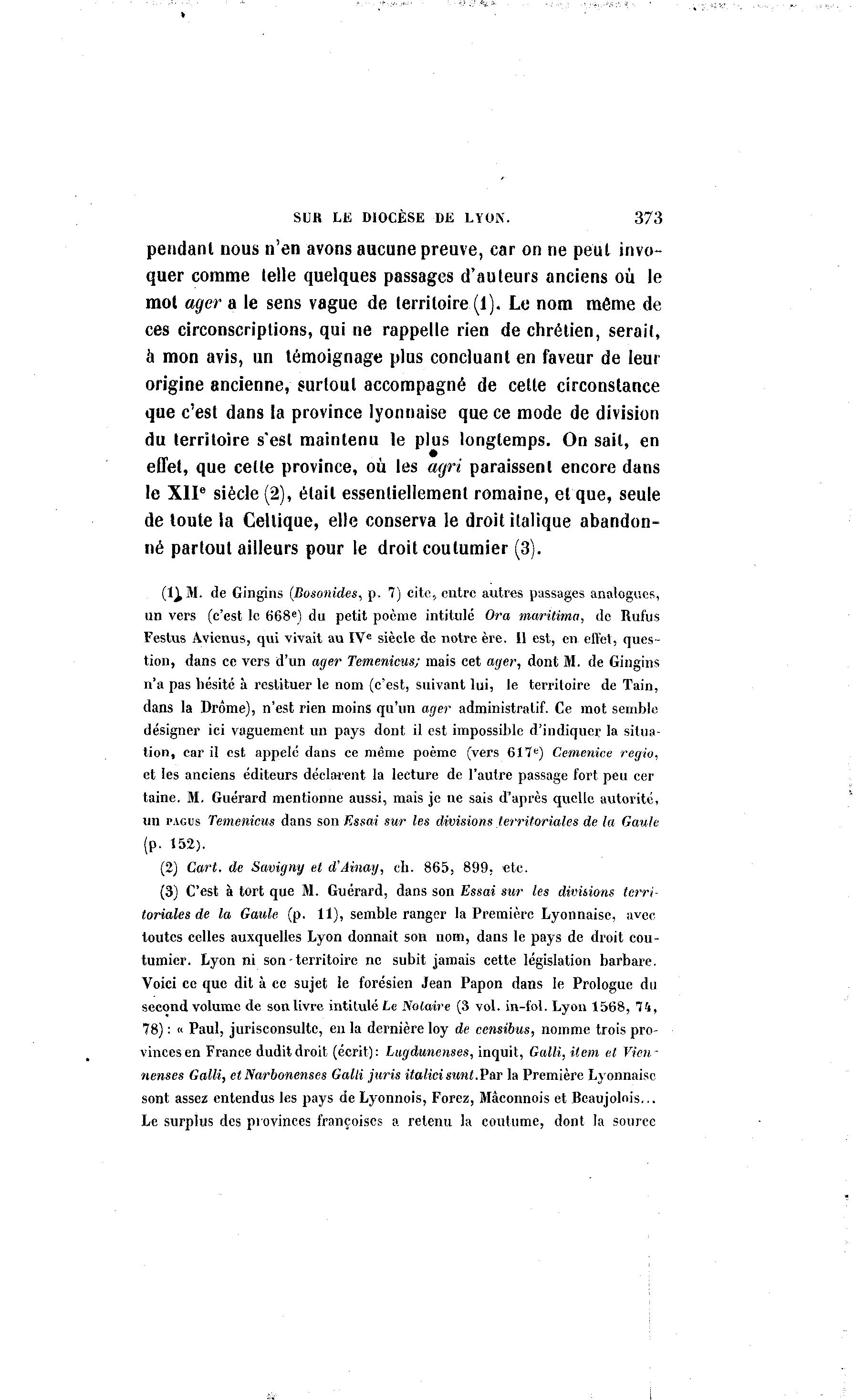 SUR LE DIOCÈSE DE LYON. 373 pendant nous n'en avons aucune preuve, car on ne peut invo- quer comme telle quelques passages d'auteurs anciens où le mot ager a le sens vague de territoire (1). Le nom môme de ces circonscriptions, qui ne rappelle rien de chrétien, serait, à mon avis, un témoignage plus concluant en faveur de leur origine ancienne, surtout accompagné de cette circonstance que c'est dans la province lyonnaise que ce mode de division du territoire s'est maintenu le plus longtemps. On sait, en effet, que celle province, où les agri paraissent encore dans le XIIe siècle (2), était essentiellement romaine, et que, seule de toute la Celtique, elle conserva le droit italique abandon- né partout ailleurs pour le droit coulumier (3). (1^ M. de Gingins (Dosonides, p. 7) cite, entre autres passages analogues, un vers (c'est le 668e) du petit poème intitulé Ora maritima, de Rufus Festus Avienus, qui vivait au IV e siècle de notre ère. 11 est, en effet, ques- tion, dans ce vers d'un ager Temenicus; mais cet ager-, dont M. de Gingins n'a pas hésité à restituer le nom (c'est, suivant lui, le territoire de Tain, dans la Drôme), n'est rien moins qu'un ager administratif. Ce mot semble désigner ici vaguement un pays dont il est impossible d'indiquer la situa- tion, car il est appelé dans ce même poème (vers 617e) Cemenice regio, et les anciens éditeurs déclarent la lecture de l'autre passage fort peu cer taine. M. Guérard mentionne aussi, mais je ne sais d'après quelle autorité, un PAGUS Temenicus dans son Essai sur les divisions territoriales de la Gaule (p. 152). (2) Cart. de Savigny et d'Ainay, ch. 865, 899, «te. (3) C'est à tort que M. Guérard, dans son Essai sur les divisions terri- toriales de la Gaule (p. 11), semble ranger la Première Lyonnaise, avec toutes celles auxquelles Lyon donnait son nom, dans le pays de droit cou- tumier. Lyon ni son - territoire ne subit jamais cette législation barbare. Voici ce que dit à ce sujet le forésien Jean Papon dans le Prologue du second volume de son livre intitulé Le Notaire (3 vol. in-fol. Lyon 1568, 74, 78) : « Paul, jurisconsulte, en la dernière loy de censibus, nomme trois pro- vinces en France duditdroit (écrit): Lugdunenses, inquit, Galli, item et Vien- nenses Galli, et Narbonenses Galli juris italicisunl.V&r la Première Lyonnaise sont assez entendus les pays de Lyonnois, Forez, Mâconnois et Beaujolois... Le surplus des provinces françoiscs a retenu la coutume, dont la source