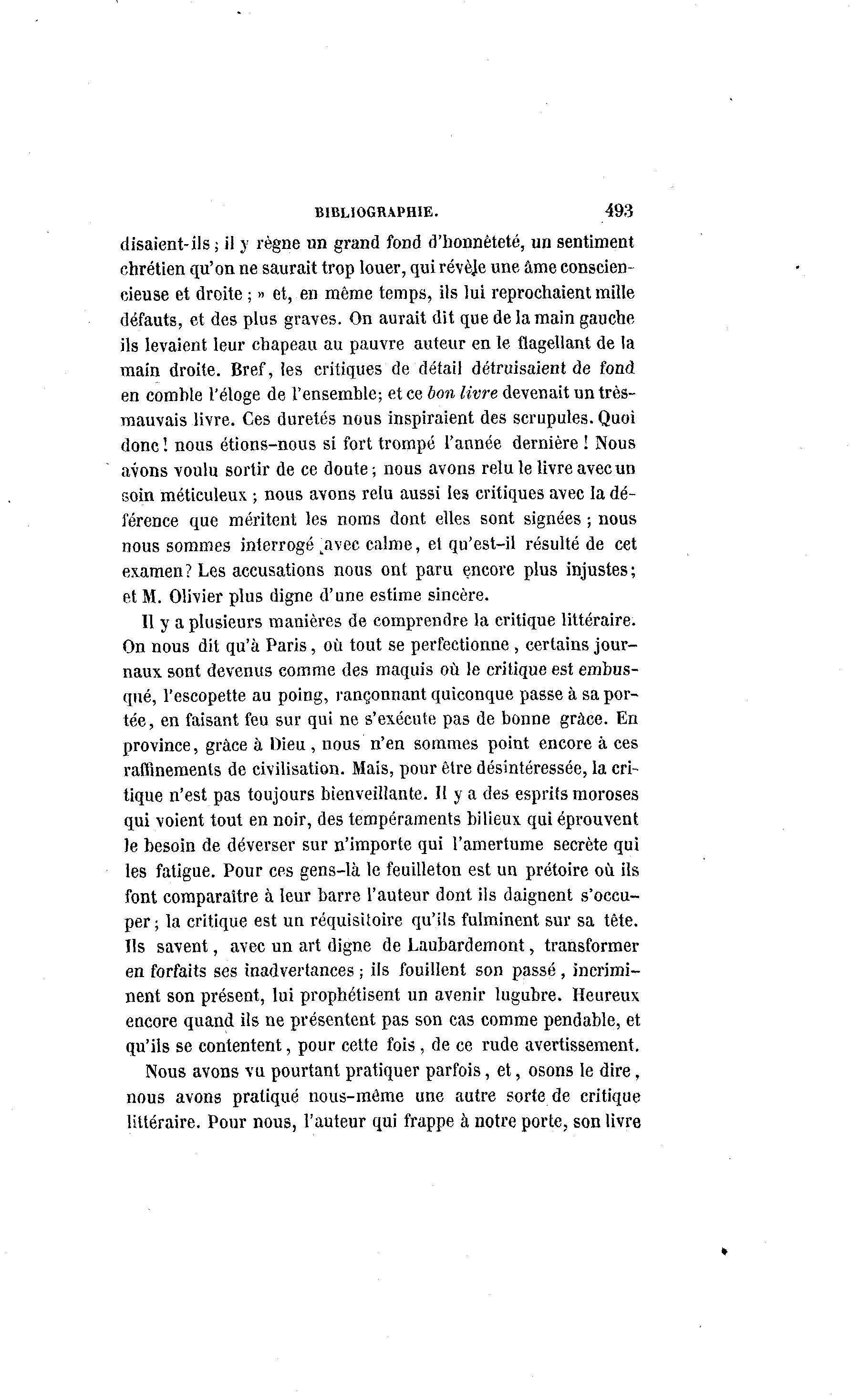 BIBLIOGRAPHIE. 493 disaient-ils ; il y règne un grand fond d'honnêteté, un sentiment chrétien qu'on ne saurait trop louer, quirévèje une âme conscien- cieuse et droite ; » et, en même temps, ils lui reprochaient mille défauts, et des plus graves. On aurait dit que de la main gauche ils levaient leur chapeau au pauvre auteur en le flagellant de la main droite. Bref, les critiques de détail détruisaient de fond en comhle l'éloge de l'ensemble; et ce bon livre devenait un très- mauvais livre. Ces duretés nous inspiraient des scrupules. Quoi donc ! nous étions-nous si fort trompé l'année dernière ! Nous avons voulu sortir de ce doute; nous avons relu le livre avec un soin méticuleux ; nous avons relu aussi les critiques avec la dé- férence que méritent les noms dont elles sont signées ; nous nous sommes interrogé jivec calme, et qu'est-il résulté de cet examen? Les accusations nous ont paru encore plus injustes; et M. Olivier plus digne d'une estime sincère. Il y a plusieurs manières de comprendre la critique littéraire. On nous dit qu'à Paris, où tout se perfectionne , certains jour- naux sont devenus comme des maquis où le critique est embus- qué, l'escopette au poing, rançonnant quiconque passe à sa por- tée, en faisant feu sur qui ne s'exécute pas de bonne grâce. En province, grâce à Dieu , nous n'en sommes point encore à ces raffinements de civilisation. Mais, pour être désintéressée, la cri- tique n'est pas toujours bienveillante. Il y a des esprits moroses qui voient tout en noir, des tempéraments bilieux qui éprouvent le besoin de déverser sur n'importe qui l'amertume secrète qui les fatigue. Pour ces gens-là le feuilleton est un prétoire où ils font comparaître à leur barre l'auteur dont ils daignent s'occu- per; la critique est un réquisitoire qu'ils fulminent sur sa tête. Ils savent, avec un art digne de Laubardemont, transformer en forfaits ses inadvertances ; ils fouillent son passé , incrimi- nent son présent, lui prophétisent un avenir lugubre. Heureux encore quand ils ne présentent pas son cas comme pendable, et qu'ils se contentent, pour cette fois , de ce rude avertissement. Nous avons vu pourtant pratiquer parfois, et, osons le dire, nous avons pratiqué nous-môme une autre sorte de critique littéraire. Pour nous, l'auteur qui frappe à notre porte, son livre