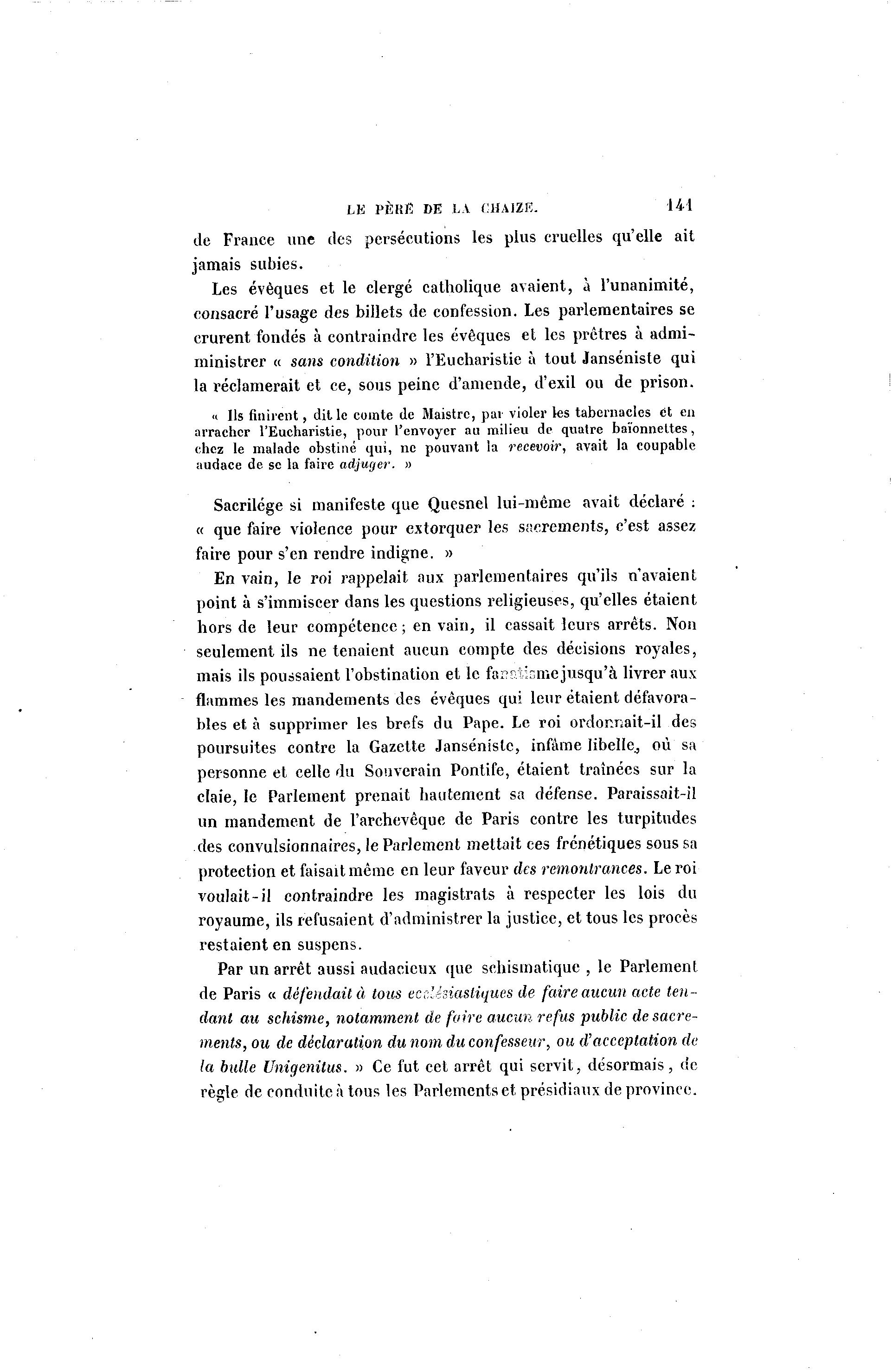 LK PÈRE DE LA CHAiZK. 141 de France une des persécutions les plus cruelles qu'elle ait jamais subies. Les évèques et le clergé catholique avaient, à l'unanimité, consacré l'usage des billets de confession. Les parlementaires se crurent fondés à contraindre les évoques et les prêtres à admi- ministrer « sans condition » l'Eucharistie à tout Janséniste qui la réclamerait et ce, sous peine d'amende, d'exil ou de prison. « Ils finirent, dit le comte de Maistre, par violer les tabernacles et en arracher l'Eucharistie, pour l'envoyer au milieu de quatre baïonnettes, chez le malade obstiné qui, ne pouvant la recevoir, avait la coupable audace de se la faire adjuger. » Sacrilège si manifeste que Quesnel lui-même avait déclaré : « que faire violence pour extorquer les sacrements, c'est assez faire pour s'en rendre indigne. » En vain, le roi rappelait aux parlementaires qu'ils n'avaient point à s'immiscer dans les questions religieuses, qu'elles étaient hors de leur compétence ; en vain, il cassait leurs arrêts. Non seulement ils ne tenaient aucun compte des décisions royales, mais ils poussaient l'obstination et le faiîsl'nme jusqu'à livrer aux flammes les mandements des évoques qui leur étaient défavora- bles et à supprimer les brefs du Pape. Le roi ordonnait-il des poursuites contre la Gazette Janséniste, infâme libelle., où su personne et celle du Souverain Pontife, étaient traînées sur la claie, le Parlement prenait hautement sa défense. Paraissait-il un mandement de l'archevêque de Paris contre les turpitudes des convulsionnaires, le Parlement mettait ces frénétiques sous sa protection et faisait même en leur faveur des remontrances. Le roi voulait-il contraindre les magistrats à respecter les lois du royaume, ils refusaient d'administrer la justice, et tous les procès restaient en suspens. Par un arrêt aussi audacieux que schisinatique , le Parlement de Paris « défendait à tous ecclésiastiques de faire aucun acte ten- dant au schisme, notamment de foire aucun refus public de sacre- ments, ou de déclaration du nom du confesseur, ou d'acceptation de la balle Unigenitus. » Ce fut cet arrêt qui servit, désormais, de règle de conduite à tous les Parlements et présidiaux de province.