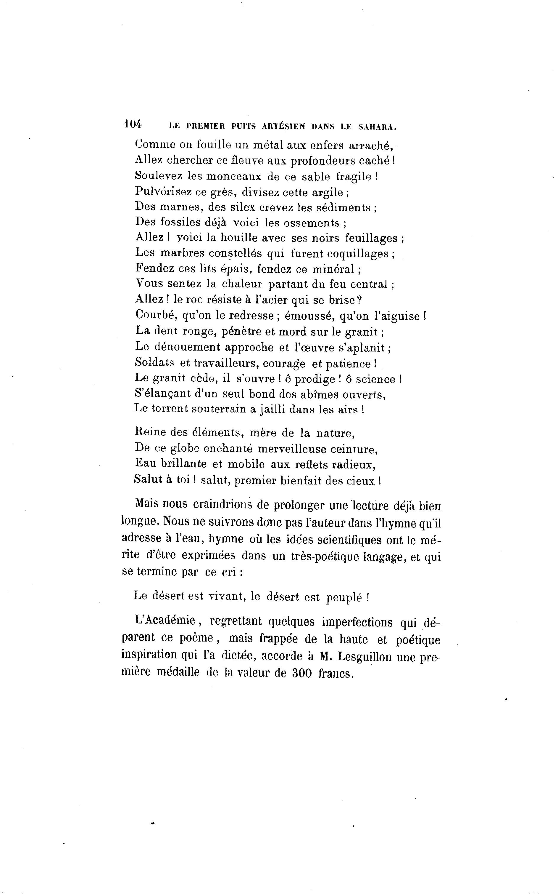 104 LE PREMIER PUITS ARTÉSIEN BANS LE SAHARA. Comme on fouille un métal aux enfers arraché, Allez chercher ce fleuve aux profondeurs caché ! Soulevez les monceaux de ce sable fragile ! Pulvérisez ce grès, divisez cette argile ; Des marnes, des silex crevez les sédiments ; Des fossiles déjà voici les ossements ; Allez ! yoici la houille avec ses noirs feuillages ; Les marbres constellés qui furent coquillages ; Fendez ces lits épais, fendez ce minéral ; Vous sentez la chaleur partant du feu central ; Allez ! le roc résiste à l'acier qui se brise ? Courbé, qu'on le redresse ; émoussé, qu'on l'aiguise ! La dent ronge, pénètre et mord sur le granit ; Le dénouement approche et l'œuvre s'aplanit ; Soldats et travailleurs, courage et patience ! Le granit cède, il s'ouvre ! ô prodige ! ô science ! S'élançant d'un seul bond des abîmes ouverts, Le torrent souterrain a jailli dans les airs ! Reine des éléments, mère de la nature, De ce globe enchanté merveilleuse ceinture, Eau brillante et mobile aux reflets radieux, Salut à toi ! salut, premier bienfait des cieux ! Mais nous craindrions de prolonger une lecture déjà bien longue. Nous ne suivrons donc pas l'auteur dans l'hymne qu'il adresse a l'eau, hymne où les ide'es scientifiques ont le mé- rite d'être exprimées dans un très-poétique langage, et qui se termine par ce cri : Le désert est vivant, le désert est peuplé ! L'Académie, regrettant quelques imperfections qui dé- parent ce poème, mais frappée de la haute et poétique inspiration qui l'a dictée, accorde a M. Lesguillon une pre- mière médaille de la valeur de 300 francs.