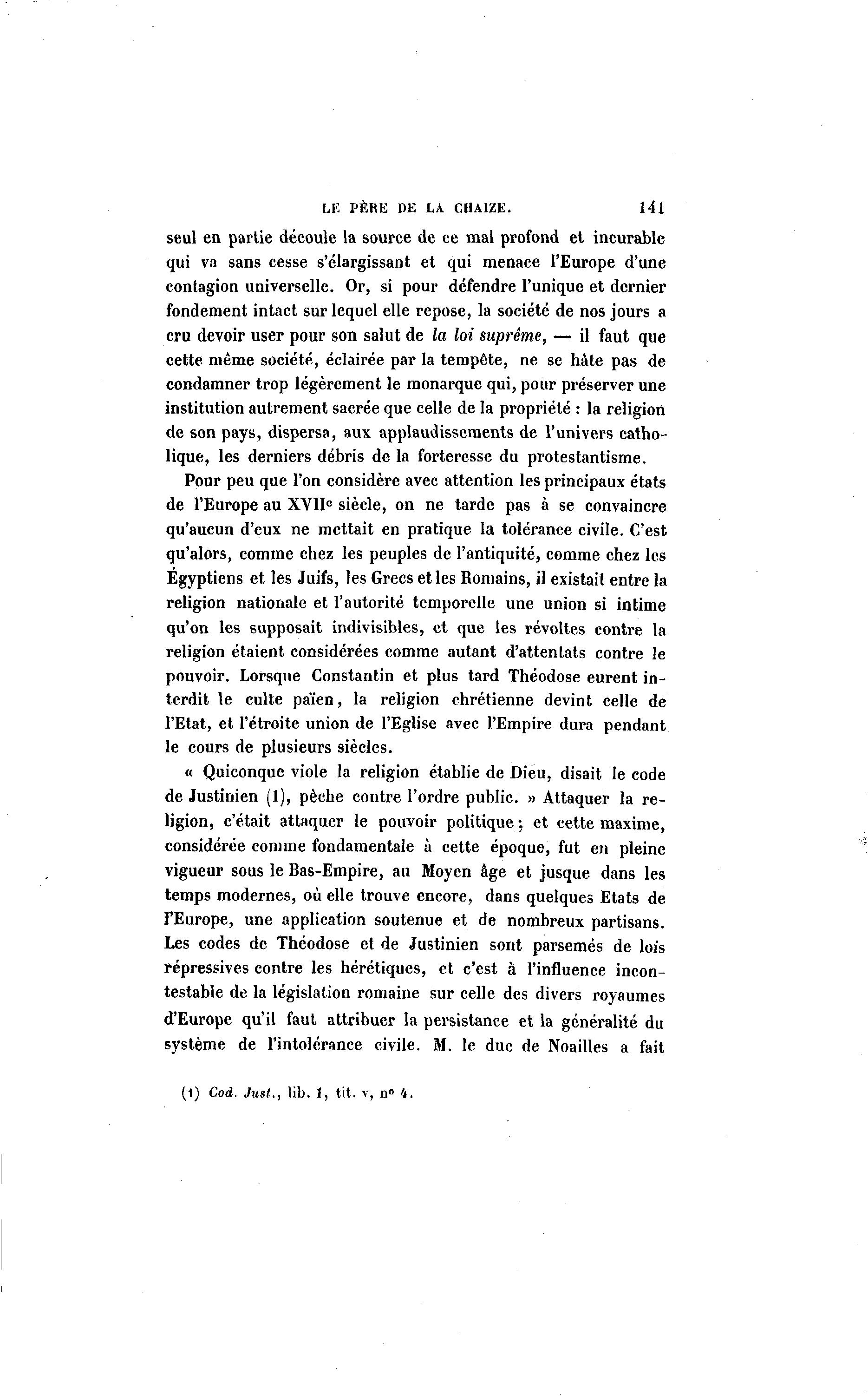LE PÈRE DE LA CHA1ZE. 141 seul en partie découle la source de ce mal profond et incurable qui va sans cesse s'élargissant et qui menace l'Europe d'une contagion universelle. Or, si pour défendre l'unique et dernier fondement intact sur lequel elle repose, la société de nos jours a cru devoir user pour son salut de la loi suprême, — il faut que cette même société, éclairée par la tempête, ne se hâte pas de condamner trop légèrement le monarque qui, pour préserver une institution autrement sacrée que celle de la propriété : la religion de son pays, dispersa, aux applaudissements de l'univers catho- lique, les derniers débris de la forteresse du protestantisme. Pour peu que l'on considère avec attention les principaux états de l'Europe au XVII e siècle, on ne tarde pas à se convaincre qu'aucun d'eux ne mettait en pratique la tolérance civile. C'est qu'alors, comme chez les peuples de l'antiquité, comme chez les Égyptiens et les Juifs, les Grecs et les Romains, il existait entre la religion nationale et l'autorité temporelle une union si intime qu'on les supposait indivisibles, et que les révoltes contre la religion étaient considérées comme autant d'attentats contre le pouvoir. Lorsque Constantin et plus tard Théodose eurent in- terdit le culte païen, la religion chrétienne devint celle de l'Etat, et l'étroite union de l'Eglise avec l'Empire dura pendant le cours de plusieurs siècles. « Quiconque viole la religion établie de Dieu, disait le code de Justinien (1), pèche contre l'ordre public. » Attaquer la re- ligion, c'était attaquer le pouvoir politique ; et cette maxime, considérée comme fondamentale à cette époque, fut en pleine vigueur sous le Bas-Empire, au Moyen âge et jusque, dans les temps modernes, où elle trouve encore, dans quelques Etats de l'Europe, une application soutenue et de nombreux partisans. Les codes de Théodose et de Justinien sont parsemés de lois répressives contre les hérétiques, et c'est à l'influence incon- testable de la législation romaine sur celle des divers royaumes d'Europe qu'il faut attribuer la persistance et la généralité du système de l'intolérance civile. M. le duc de Noailles a fait (1) Cod. Just., lib. 1, fit. v, n° 4.