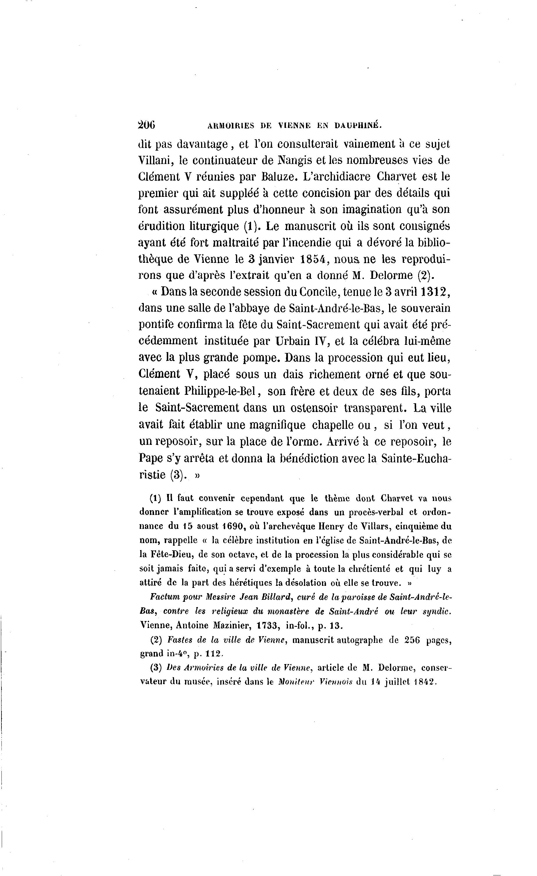 20G ARMOIRIES DE VIENNE EN DAIU>HINÉ. dit pas davantage, et l'on consulterait vainement a ce sujet Villani, le continuateur de Nangis et les nombreuses vies de Clément V réunies par Baluze. L'archidiacre Charvet est le premier qui ait suppléé à cette concision par des détails qui font assurément plus d'honneur à son imagination qu'à son érudition liturgique (1). Le manuscrit où ils sont consignés ayant été fort maltraité par l'incendie qui a dévoré la biblio- thèque de Vienne le 3 janvier 1854, noua ne les reprodui- rons que d'après l'extrait qu'en a donné M. Delorme (2). « Dans la seconde session du Concile, tenue le 3 avril 1312, dans une salle de l'abbaye de Saint-André-le-Bas, le souverain pontife confirma la fête du Saint-Sacrement qui avait été pré- cédemment instituée par Urbain IV, et la célébra lui-même avec la plus grande pompe. Dans la procession qui eut lieu, Clément V, placé sous un dais richement orné et que sou- tenaient Philippe-le-Bel, son frère et deux de ses fils, porta le Saint-Sacrement dans un ostensoir transparent. La ville avait fait établir une magnifique chapelle ou, si l'on veut, un reposoir, sur la place de l'orme. Arrivé a ce reposoir, le Pape s'y arrêta et donna la bénédiction avec la Sainte-Eucha- ristie (3). » (1) Il faut convenir cependant que le thème dont Charvet va nous donner l'amplification se trouve exposé dans un procès-verbal et ordon- nance du i 5 aoust 1690, où l'archevêque Henry de Villars, cinquième du nom, rappelle « la célèbre institution en l'église de Saint-André-le-Bas, de la Fête-Dieu, de son octave, et de la procession la plus considérable qui se soit jamais faite, qui a servi d'exemple à toute la chrétienté et qui luy a attiré de la part des hérétiques la désolation où elle se trouve. » Factum pour Messire Jean Billard, curé de la paroisse de Saint-André-le- Bas, contre les religieux du monastère de Saint-André ou leur syndic. Vienne, Antoine Mazinier, 1733, in-fol., p. 13. (2) Fastes de la ville de Vienne, manuscrit autographe de 256 pages, grand in-4°, p. 112. (3) Des Armoiries de la ville de Vienne, article de M. Delorme, conser- vateur du musée, inséré dans le Moniteur Viennois du 14 juillet 1842.