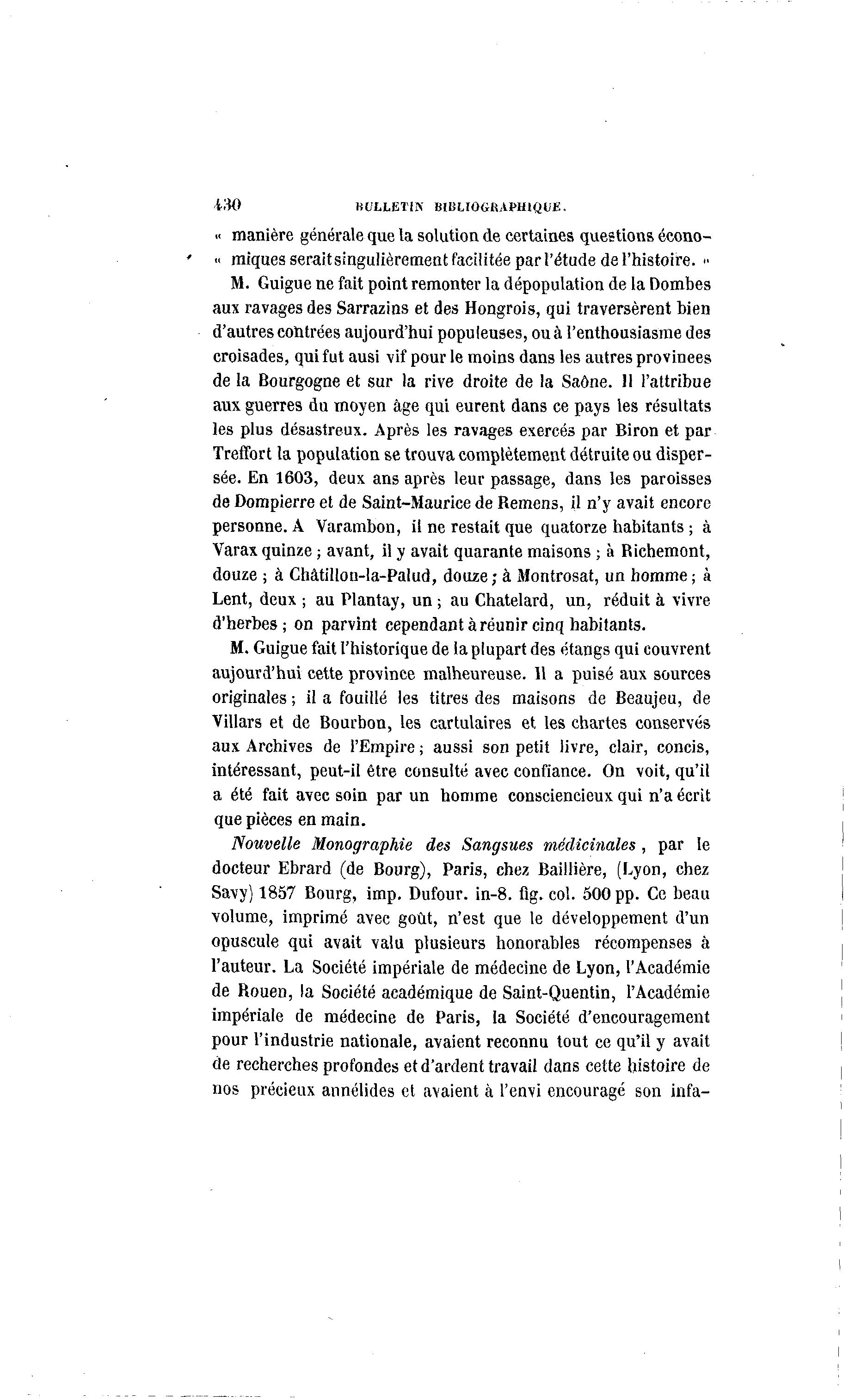 i'M BULLETIN BIBLIOGRAPHIQUE. « manière générale que la solution de certaines questions écono- « iniques serait singulièrement facilitée par l'étude de l'histoire. » M. Guigue ne fait point remonter la dépopulation de la Dombes aux ravages des Sarrazins et des Hongrois, qui traversèrent bien d'autres contrées aujourd'hui populeuses, ou à l'enthousiasme des croisades, qui fut ausi vif pour le moins dans les autres provinees de la Bourgogne et sur la rive droite de la Saône. Il l'attribue aux guerres du moyen âge qui eurent dans ce pays les résultats les plus désastreux. Après les ravages exercés par Biron et par Treffort la population se trouva complètement détruite ou disper- sée. En 1603, deux ans après leur passage, dans les paroisses de Dompierre et de Saint-Maurice de Remens, il n'y avait encore personne. À Varambon, il ne restait que quatorze habitants ; à Varax quinze ; avant, il y avait quarante maisons ; à Richement, douze ; à Châtillon-la-Palud, douze; à Montrosat, un homme; à Lent, deux ; au Plantay, un ; au Chatelard, un, réduit à vivre d'herbes ; on parvint cependant à réunir cinq habitants. M. Guigue fait l'historique de la plupart des étangs qui couvrent aujourd'hui cette province malheureuse. 11 a puisé aux sources originales ; il a fouillé les titres des maisons de Beaujeu, de Villars et de Bourbon, les cartulaires et les chartes conservés aux Archives de l'Empire ; aussi son petit livre, clair, concis, intéressant, peut-il être consulté avec confiance. On voit, qu'il a été fait avec soin par un homme consciencieux qui n'a écrit que pièces en main. Nouvelle Monographie des Sangsues médicinales , par le docteur Ebrard (de Bourg), Paris, chez Baillière, (Lyon, chez Savy) 1857 Bourg, imp. Dufour. in-8. flg. col. 500 pp. Ce beau volume, imprimé avec goût, n'est que le développement d'un opuscule qui avait valu plusieurs honorables récompenses à l'auteur. La Société impériale de médecine de Lyon, l'Académie de Rouen, la Société académique de Saint-Quentin, l'Académie impériale de médecine de Paris, la Société d'encouragement pour l'industrie nationale, avaient reconnu tout ce qu'il y avait de recherches profondes et d'ardent travail dans cette histoire de nos précieux annélides et avaient à l'envi encouragé son infa-