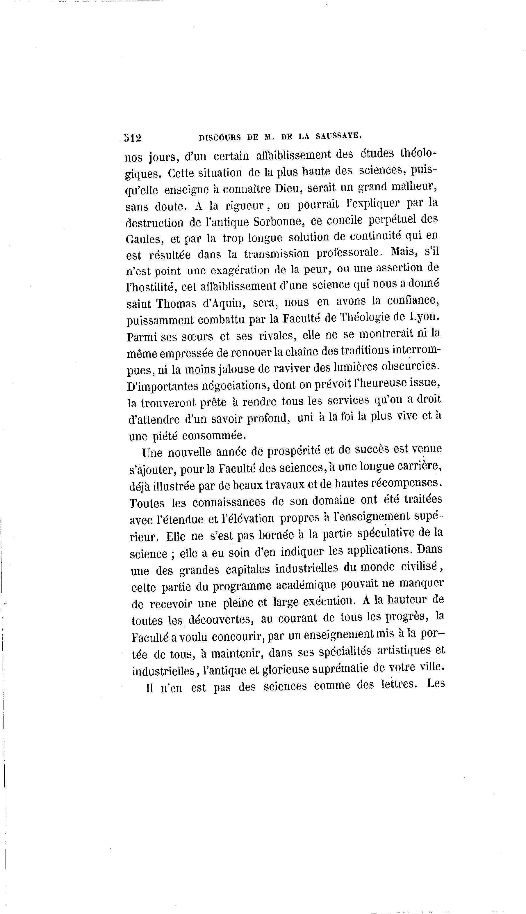 512 DISCOURS DE M. DE LA SA.USSAYE. nos jours, d'un certain affaiblissement des études théolo- giques. Cette situation de la plus haute des sciences, puis- qu'elle enseigne a connaître Dieu, serait un grand malheur, sans doute. A la rigueur, on pourrait l'expliquer par la destruction de l'antique Sorbonne, ce concile perpétuel des Gaules, et par la trop longue solution de continuité qui en est résultée dans la transmission professorale. Mais, s'il n'est point une exagération de la peur, ou une assertion de l'hostilité, cet affaiblissement d'une science qui nous adonné saint Thomas d'Aquin, sera, nous en avons la confiance, puissamment combattu par la Faculté de Théologie de Lyon. Parmi ses sœurs et ses rivales, elle ne se montrerait ni la même empressée de renouer la chaîne des traditions interrom- pues, ni la moins jalouse de raviver des lumières obscurcies. D'importantes négociations, dont on prévoit l'heureuse issue, la trouveront prête a rendre tous les services qu'on a droit d'attendre d'un savoir profond, uni à la foi la plus vive et a une piété consommée. Une nouvelle année de prospérité et de succès est venue s'ajouter, pour la Faculté des sciences, a une longue carrière, déjà illustrée par de beaux travaux et de hautes récompenses. Toutes les connaissances de son domaine ont été traitées avec l'étendue et l'élévation propres a l'enseignement supé- rieur. Elle ne s'est pas bornée a la partie spéculative de la science ; elle a eu soin d'en indiquer les applications. Dans une des grandes capitales industrielles du monde civilisé, cette partie du programme académique pouvait ne manquer de recevoir une pleine et large exécution. A la hauteur de toutes les découvertes, au courant de tous les progrès, la Faculté a voulu concourir, par un enseignement mis à la por- tée de tous, a maintenir, dans ses spécialités artistiques et industrielles, l'antique et glorieuse suprématie de votre ville. Il n'en est pas des sciences comme des lettres. Les