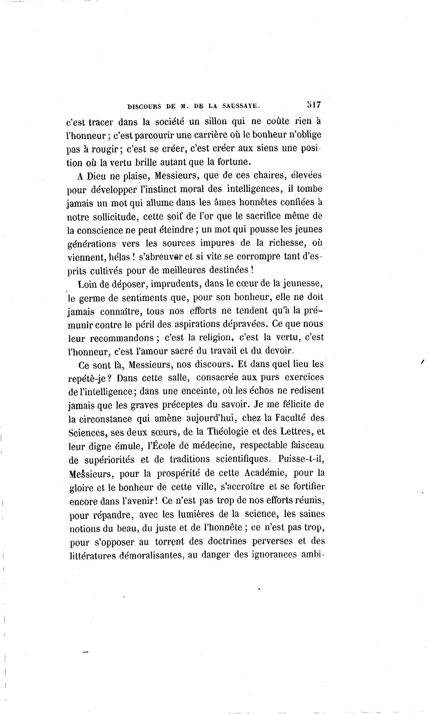 DISCOURS DE M. DB LA SAUSSAYE. S17 c'est tracer dans la société un sillon qui ne coûte rien à l'honneur ; c'est parcourir une carrière où le bonheur n'oblige pas à rougir ; c'est se créer, c'est créer aux siens une posi- tion où la vertu brille autant que la fortune. A Dieu ne plaise, Messieurs, que de ces chaires, élevées pour développer l'instinct moral des intelligences, il tombe jamais un mot qui allume dans les âmes honnêtes confiées à notre sollicitude, cette soif de l'or que le sacrifice même de la conscience ne peut éteindre ; un mot qui pousse les jeunes générations vers les sources impures de la richesse, où viennent, hélas ! s'abreuver et si vite se corrompre tant d'es- prits cultivés pour de meilleures destinées ! Loin de déposer, imprudents, dans le cœur de la jeunesse, le germe de sentiments que, pour son bonheur, elle ne doit jamais connaître, tous nos efforts ne tendent qu'à la pré- munir contre le péril des aspirations dépravées. Ce que nous leur recommandons ; c'est la religion, c'est la vertu, c'est l'honneur, c'est l'amour sacré du travail et du devoir. Ce sont là , Messieurs, nos discours. Et dans quel lieu les repétè-je ? Dans cette salle, consacrée aux purs exercices de l'intelligence ; dans une enceinte, où les échos ne redisent jamais que les graves préceptes du savoir. Je me félicite de la circonstance qui amène aujourd'hui, chez la Faculté des Sciences, ses deux sœurs, de la Théologie et des Lettres, et leur digne émule, l'École de médecine, respectable faisceau de supériorités et de traditions scientifiques. Puisse-t-il, Messieurs, pour la prospérité de cette Académie, pour la gloire et le bonheur de cette ville, s'accroître et se fortifier encore dans l'avenir! Ce n'est pas trop de nos efforts réunis, pour répandre, avec les lumières de la science, les saines notions du beau, du juste et de l'honnête ; ce n'est pas trop, pour s'opposer au torrent des doctrines perverses et des littératures démoralisantes, au danger des ignorances ambi-