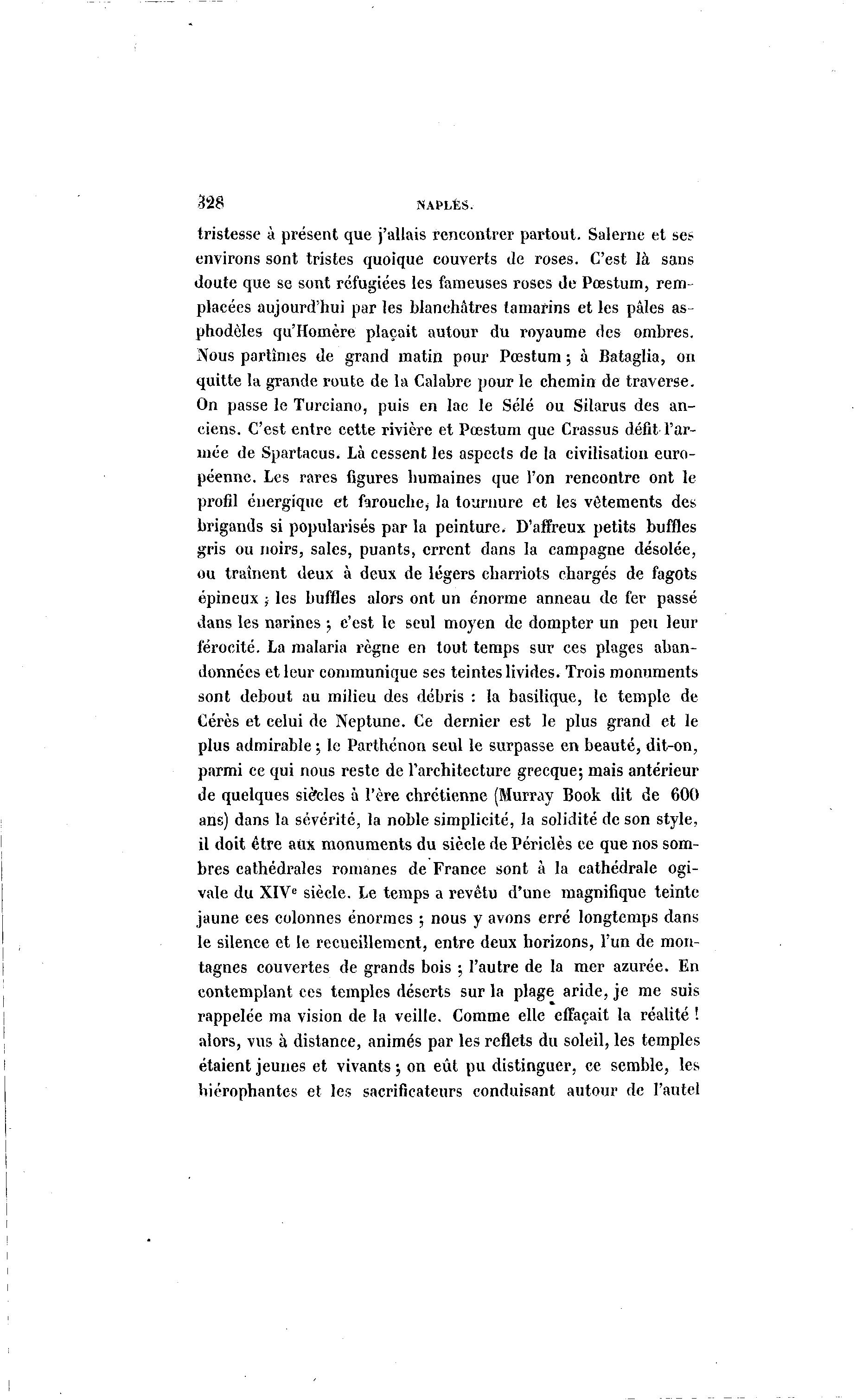 328 NAPLÈS. tristesse à présent que j'allais rencontrer partout. Salerne et ses environs sont tristes quoique couverts de roses. C'est là sans doute que se sont réfugiées les fameuses roses de Pœstum, rem- placées aujourd'hui par les blanchâtres tamarins et les pâles as- phodèles qu'Homère plaçait autour du royaume des ombres. Nous partîmes de grand matin pour Pœstum ; à Bataglia, on quitte la grande route de la Calabre pour le chemin de traverse. On passe le Turciano, puis en lac le Sélé ou Silarus des an- ciens. C'est entre cette rivière et Pœstum que Crassus défit Far- inée de Spartacus. Là cessent les aspects de la civilisation euro- péenne. Les rares figures humaines que l'on rencontre ont le profil énergique et farouche, la tournure et les vêtements des brigands si popularisés par la peinture. D'affreux petits buffles gris ou noirs, sales, puants, errent dans la campagne désolée, ou traînent deux à deux de légers charriots chargés de fagots épineux ; les buffles alors ont un énorme anneau de fer passé dans les narines ; c'est le seul moyen de dompter un peu leur férocité. La malaria règne en tout temps sur ces plages aban- données et leur communique ses teintes livides. Trois monuments sont debout au milieu des débris : la basilique, le temple de Cérès et celui de Neptune. Ce dernier est le plus grand et le plus admirable ; le Parthénon seul le surpasse en beauté, dit-on, parmi ce qui nous reste de l'architecture grecque; mais antérieur de quelques siè*cles à l'ère chrétienne (Murray Book dit de 600 ans) dans la sévérité, la noble simplicité, la solidité de son style, il doit être aux monuments du siècle de Périclès ce que nos som- bres cathédrales romanes de France sont à la cathédrale ogi- vale du XIVe siècle. Le temps a revêtu d'une magnifique teinte jaune ces colonnes énormes ; nous y avons erré longtemps dans le silence et le recueillement, entre deux horizons, l'un de mon- tagnes couvertes de grands bois ; l'autre de la mer azurée. En contemplant ces temples déserts sur la plage aride, je me suis rappelée ma vision de la veille. Comme elle effaçait la réalité ! alors, vus à distance, animés par les reflets du soleil, les temples étaient jeunes et vivants ; on eût pu distinguer, ce semble, les hiérophantes et les sacrificateurs conduisant autour de l'autel