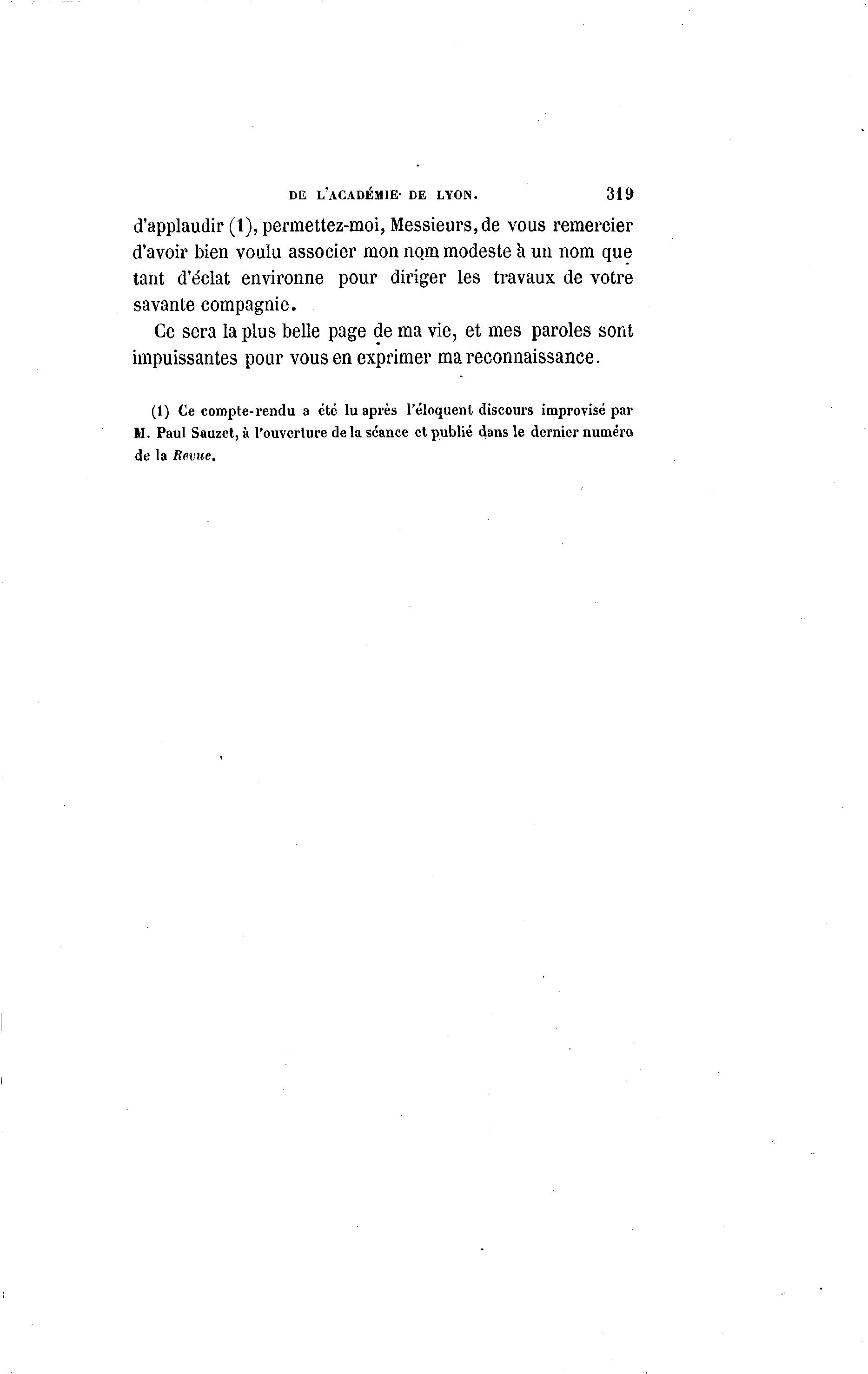 DE L'ACADÉMIE- DE LYON. 319 d'applaudir (1), permettez-moi, Messieurs, de vous remercier d'avoir bien voulu associer mon no.m modeste à un nom que tant d'éclat environne pour diriger les travaux de votre savante compagnie. Ce sera la plus belle page de ma vie, et mes paroles sont impuissantes pour vous en exprimer ma reconnaissance. (1) Ce compte-rendu a été lu après l'éloquent discours improvisé par M. Paul Sauzet, à l'ouverture de la séance et publié dans le dernier numéro de la Bévue.