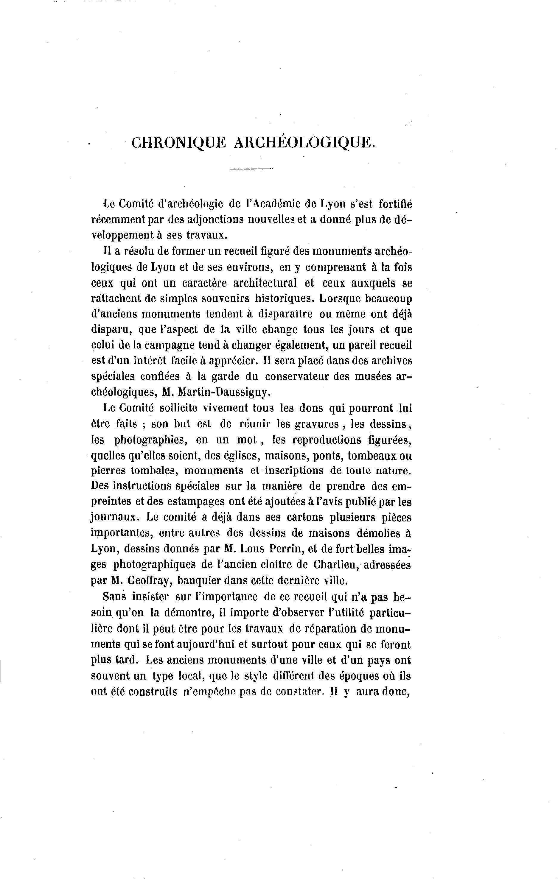 CHRONIQUE ARCHÉOLOGIQUE. Le Comité d'archéologie de l'Académie de Lyon s'est fortifié récemment par des adjonctions nouvelles et a donné plus de dé- veloppement à ses travaux. Il a résolu de former un recueil figuré des monuments archéo- logiques de Lyon et de ses environs, en y comprenant à la fois ceux qui ont un caractère architectural et ceux auxquels se rattachent de simples souvenirs historiques. Lorsque beaucoup d'anciens monuments tendent à disparaître ou même ont déjà disparu, que l'aspect de la ville change tous les jours et que celui de la campagne tend à changer également, un pareil recueil est d'un intérêt facile à apprécier. Il sera placé dans des archives spéciales confiées à la garde du conservateur des musées ar- chéologiques, M. Martin-Daussigny. Le Comité sollicite vivement tous les dons qui pourront lui être faits ; son but est de réunir les gravures, les dessins, les photographies, en un mot, les reproductions figurées, quelles qu'elles soient, des églises, maisons, ponts, tombeaux ou pierres tombales, monuments et inscriptions de toute nature. Des instructions spéciales sur la manière de prendre des em- preintes et des estampages ont été ajoutées à l'avis publié par les journaux. Le comité a déjà dans ses cartons plusieurs pièces importantes, entre autres des dessins de maisons démolies à Lyon, dessins donnés par M. Lous Perrin, et de fort belles ima- ges photographiques de l'ancien cloître de Charlieu, adressées par M. Geoffray, banquier dans cette dernière ville. Sans insister sur l'importance de ce recueil qui n'a pas be- soin qu'on la démontre, il importe d'observer l'utilité particu- lière dont il peut être pour les travaux de réparation de monu- ments qui se font aujourd'hui et surtout pour ceux qui se feront plus tard. Les anciens monuments d'une ville et d'un pays ont souvent un type local, que le style différent des époques où ils ont été construits n'empêche pas de constater. Il y aura donc,