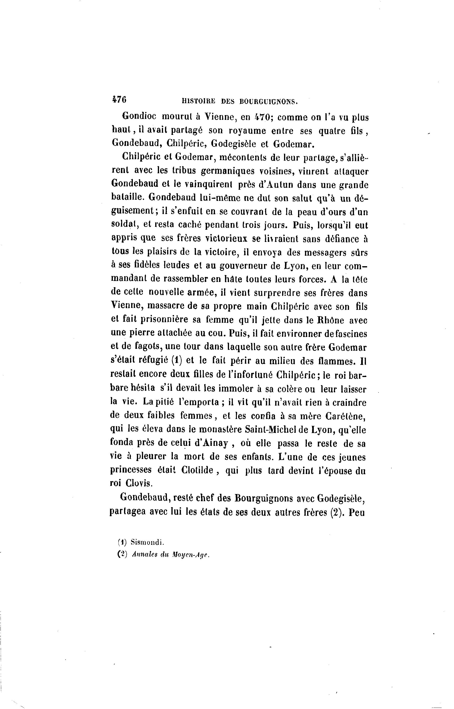 476 HISTOIRE DES BOURGUIGNONS. Gondioc mourut à Vienne, en 470; comme on l'a vu plus haut, il avait partagé son royaume entre ses quatre fils , Gondebaud, Chilpéric, Godegisèle et Godemar. Chilpéric et Godemar, mécontents de leur partage,s'alliè- rent avec les tribus germaniques voisines, vinrent altaquer Gondebaud el le vainquirent près d'Aulun dans une grande bataille. Gondebaud lui-même ne dut son salut qu'à un dé- guisement; il s'enfuit en se couvrant de la peau d'ours d'un soldai, et resta caché pendant trois jours. Puis, lorsqu'il eut appris que ses frères victorieux se livraient sans défiance à tous les plaisirs de la victoire, il envoya des messagers sûrs à ses fidèles leudes el au gouverneur de Lyon, en leur com- mandant de rassembler en hâle toutes leurs forces. A la tôle de celle nouvelle armée, il vient surprendre ses frères dans Vienne, massacre de sa propre main Chilpéric avec son fils el fait prisonnière sa femme qu'il jette dans le Rhône avec une pierre attachée au cou. Puis, il fait environner de fascines et de fagots, une tour dans laquelle son autre frère Godemar s'était réfugié (1) et le fait périr au milieu des flammes. Il restait encore deux filles de l'infortuné Chilpéric ; le roi bar- bare hésita s'il devait les immoler à sa colère ou leur laisser la vie. La pitié l'emporta ; il vit qu'il n'avait rien à craindre de deux faibles femmes, et les confia à sa mère Carélène, qui les éleva dans le monastère Saint-Michel de Lyon, qu'elle fonda près de celui d'Ainay , où elle passa le reste de sa vie à pleurer la mort de ses enfants. L'une de ces jeunes princesses était Clolilde , qui plus tard devint l'épouse du roi Clovis. Gondebaud, resté chef des Bourguignons avec Godegisèle, partagea avec lui les états de ses deux autres frères (2). Peu (1) Sismondi. (2) Annules du Moyen-Age.