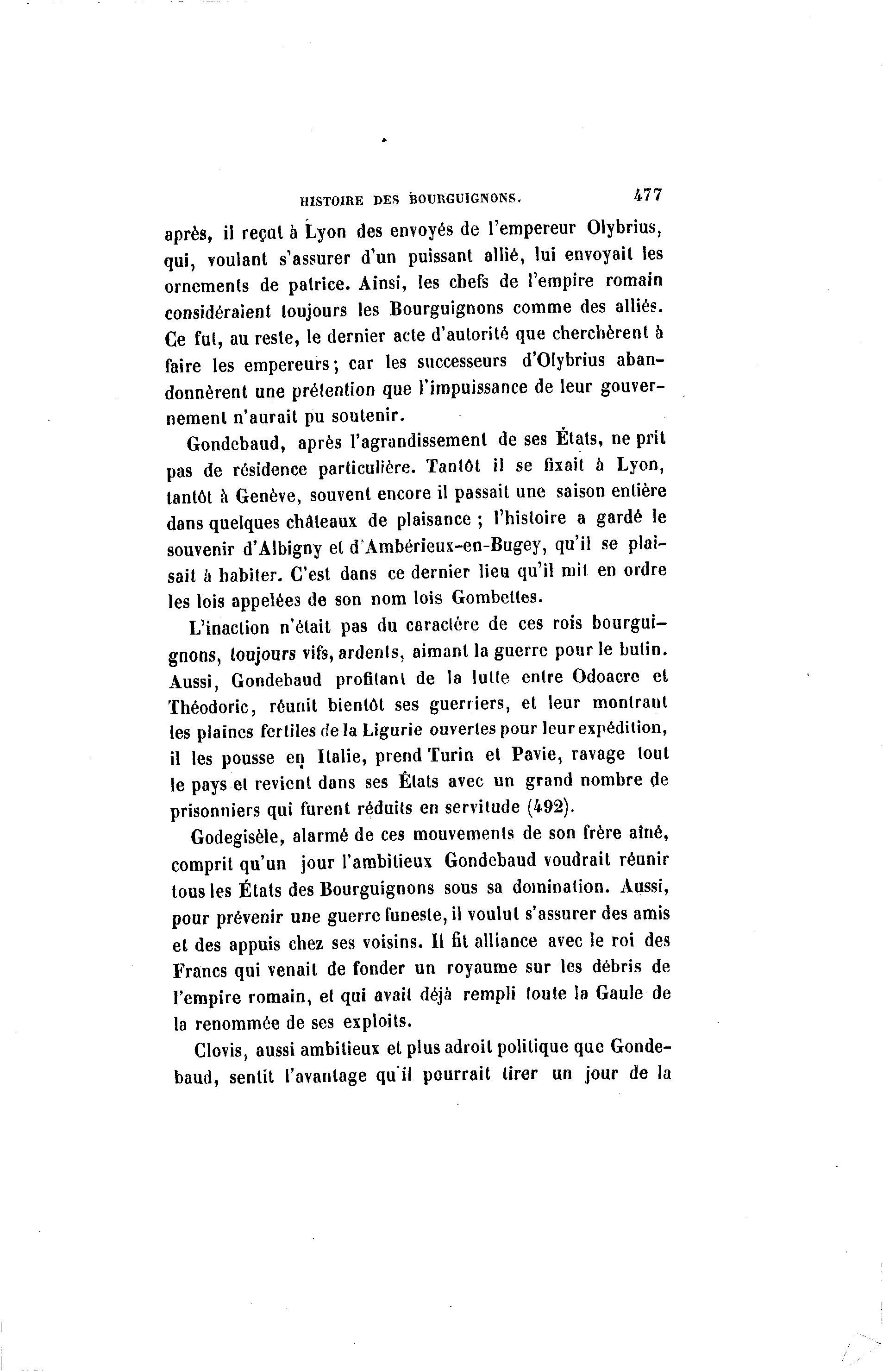HISTOIRE DES BOURGUIGNONS- 477 après, il reçut à Lyon des envoyés de l'empereur Olybrius, qui, voulant s'assurer d'un puissant allié, lui envoyait les ornements de patrice. Ainsi, les chefs de l'empire romain considéraient toujours les Bourguignons comme des alliés. Ce fut, au reste, le dernier acte d'autorité que cherchèrent à faire les empereurs ; car les successeurs d'OIybrius aban- donnèrent une prétention que l'impuissance de leur gouver- nement n'aurait pu soutenir. Gondebaud, après l'agrandissement de ses États, ne prit pas de résidence particulière. Tantôt il se fixait à Lyon, tantôt à Genève, souvent encore il passait une saison entière dans quelques châteaux de plaisance ; l'histoire a gardé le souvenir d'Albigny et d*Ambérieux-en-Bugey, qu'il se plai- sait à habiter. C'est dans ce dernier lieu qu'il mil en ordre les lois appelées de son nom lois Gombelles. L'inaction n'était pas du caractère de ces rois bourgui- gnons, toujours vifs, ardents, aimant la guerre pour le butin. Aussi, Gondebaud profilant de la lutte entre Odoacre et Théodoric, réunit bientôt ses guerriers, et leur montrant les plaines fertiles delà Ligurie ouvertes pour leur expédition, il les pousse en Italie, prend Turin et Pavie, ravage tout le pays et revient dans ses États avec un grand nombre de prisonniers qui furent réduits en servitude (492). Godegisèle, alarmé de ces mouvements de son frère aîné, comprit qu'un jour l'ambitieux Gondebaud voudrait réunir tous les États des Bourguignons sous sa domination. Aussi, pour prévenir une guerre funeste, il voulut s'assurer des amis et des appuis chez ses voisins. Il fit alliance avec le roi des Francs qui venait de fonder un royaume sur les débris de l'empire romain, et qui avait déjà rempli toute la Gaule de la renommée de ses exploits. Clovis, aussi ambitieux et plus adroit politique que Gonde- baud, sentit l'avantage qu'il pourrait tirer un jour de la