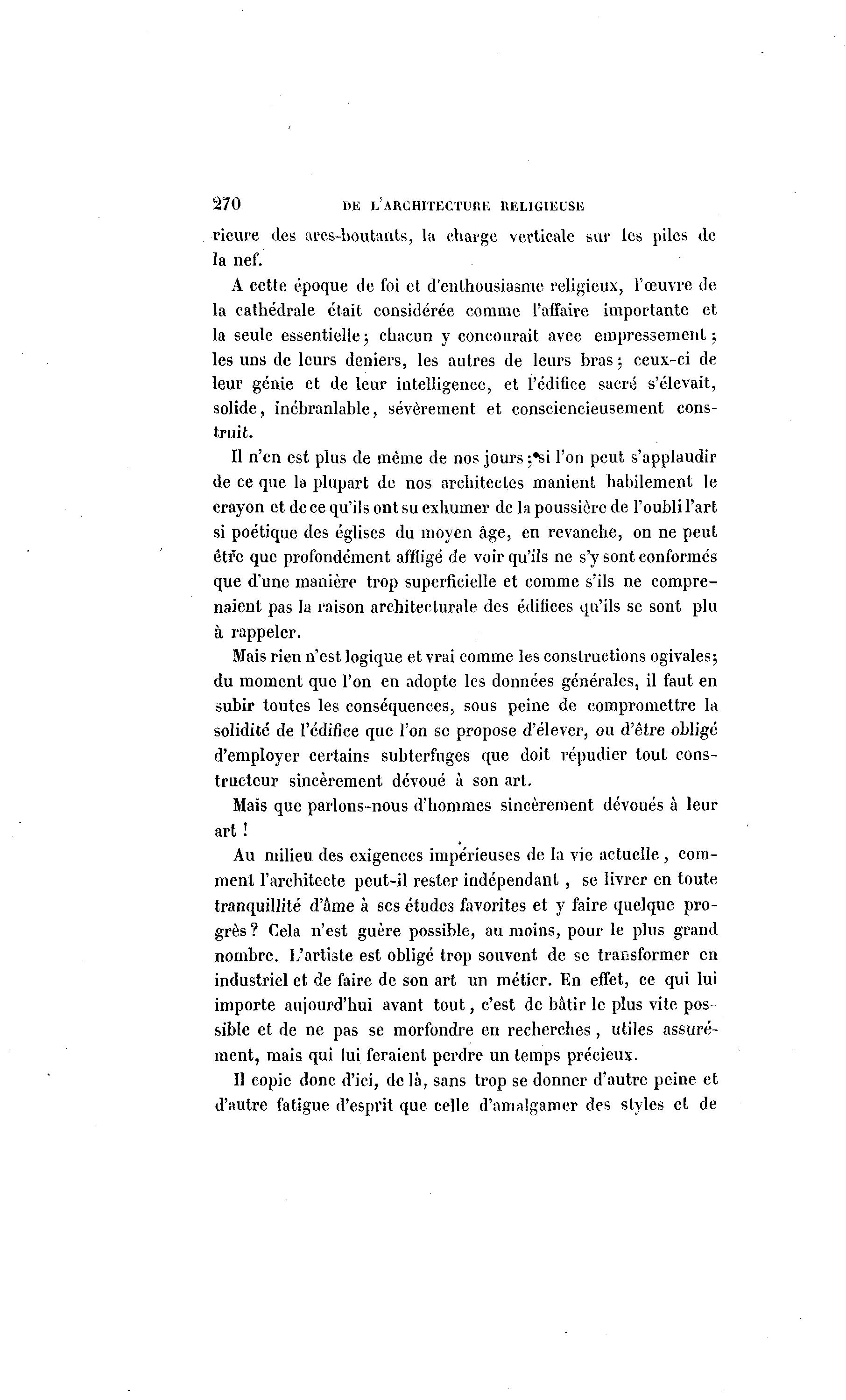270 DE L'ARCHITECTURE RELIGIEUSE rieure des arcs-boutants, la charge verticale sur les piles de la nef. A cette époque de foi et d'enthousiasme religieux, l'œuvre de la cathédrale était considérée comme l'affaire importante et la seule essentielle; chacun y concourait avec empressement; les uns de leurs deniers, les autres de leurs bras ; ceux-ci de leur génie et de leur intelligence, et l'édifice sacré s'élevait, solide, inébranlable, sévèrement et consciencieusement cons- truit. Il n'en est plus de même de nos jours ;*si l'on peut s'applaudir de ce que la plupart de nos architectes manient habilement le crayon et de ce qu'ils ont su exhumer de la poussière de l'oubli l'art si poétique des églises du moyen âge, en revanche, on ne peut être que profondément affligé de voir qu'ils ne s'y sont conformés que d'une manière trop superficielle et comme s'ils ne compre- naient pas la raison architecturale des édifices qu'ils se sont plu à rappeler. Mais rien n'est logique et vrai comme les constructions ogivales; du moment que l'on en adopte les données générales, il faut en subir toutes les conséquences, sous peine de compromettre la solidité de l'édifice que l'on se propose d'élever, ou d'être obligé d'employer certains subterfuges que doit répudier tout cons- tructeur sincèrement dévoué à son art. Mais que parlons-nous d'hommes sincèrement dévoués à leur art! Au milieu des exigences impérieuses de la vie actuelle., com- ment l'architecte peut-il rester indépendant , se livrer en toute tranquillité d'âme à ses études favorites et y faire quelque pro- grès ? Cela n'est guère possible, au moins, pour le plus grand nombre. L'artiste est obligé trop souvent de se tracsformer en industriel et de faire de son art un métier. En effet, ce qui lui importe aujourd'hui avant tout, c'est de bâtir le plus vite pos- sible et de ne pas se morfondre en recherches , utiles assuré- ment, mais qui lui feraient perdre un temps précieux. Il copie donc d'ici, de là , sans trop se donner d'autre peine et d'autre fatigue d'esprit que celle d'amalgamer des styles et de