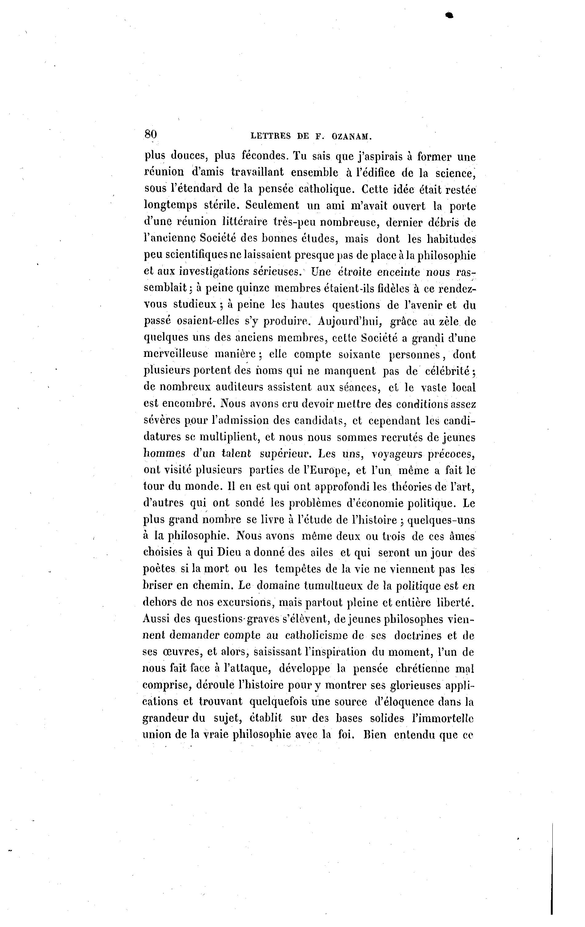 % 80 LETTRES DE F. OZANAM. plus douces, plus fécondes. Tu sais que j'aspirais à former une réunion d'amis travaillant ensemble à l'édifice de la science, sous l'étendard de la pensée catholique. Cette idée était restée longtemps stérile. Seulement un ami m'avait ouvert la porte d'une réunion littéraire très-peu nombreuse, dernier débris de l'anciennç Société des bonnes études, mais dont les habitudes peu scientifiques ne laissaient presque pas de place à la philosophie et aux investigations sérieuses. Une étroite enceinte nous ras- semblait; à peine quinze membres étaient-ils fidèles à ce rendez- vous studieux ; à peine les hautes questions de l'avenir et du passé osaient-elles s'y produire. Aujourd'hui, grâce au zèle de quelques uns des anciens membres, cette Société a grandi d'une merveilleuse manière ; elle compte soixante personnes, dont plusieurs portent des noms qui ne manquent pas de célébrité; de nombreux auditeurs assistent aux séances, et le vaste local est encombré. Nous avons cru devoir mettre des conditions assez sévères pour l'admission des candidats, et cependant les candi- datures se multiplient, et nous nous sommes recrutés de jeunes hommes d'un talent supérieur. Les uns, voyageurs précoces, ont visité plusieurs parties de l'Europe, et l'un même a fait le tour du monde. Il en est qui ont approfondi les théories de l'art, d'autres qui ont sondé les problèmes d'économie politique. Le plus grand nombre se livre à l'étude de l'histoire ; quelques-uns à la philosophie. Nous avons môme deux ou trois de ces âmes choisies à qui Dieu a donné des ailes et qui seront un jour des poètes si la mort ou les tempêtes de la vie ne viennent pas les briser en chemin. Le domaine tumultueux de la politique est en dehors de nos excursions, mais partout pleine et entière liberté. Aussi des questions-graves s'élèvent, déjeunes philosophes vien- nent demander compte au catholicisme de ses doctrines et de ses œuvres, et alors, saisissant l'inspiration du moment, l'un de nous fait face à l'attaque, développe la pensée chrétienne mal comprise, déroule l'histoire pour y montrer ses glorieuses appli- cations et trouvant quelquefois une source d'éloquence dans la grandeur du sujet, établit sur des bases solides l'immortelle union de la vraie philosophie avec la foi. Bien entendu que ce