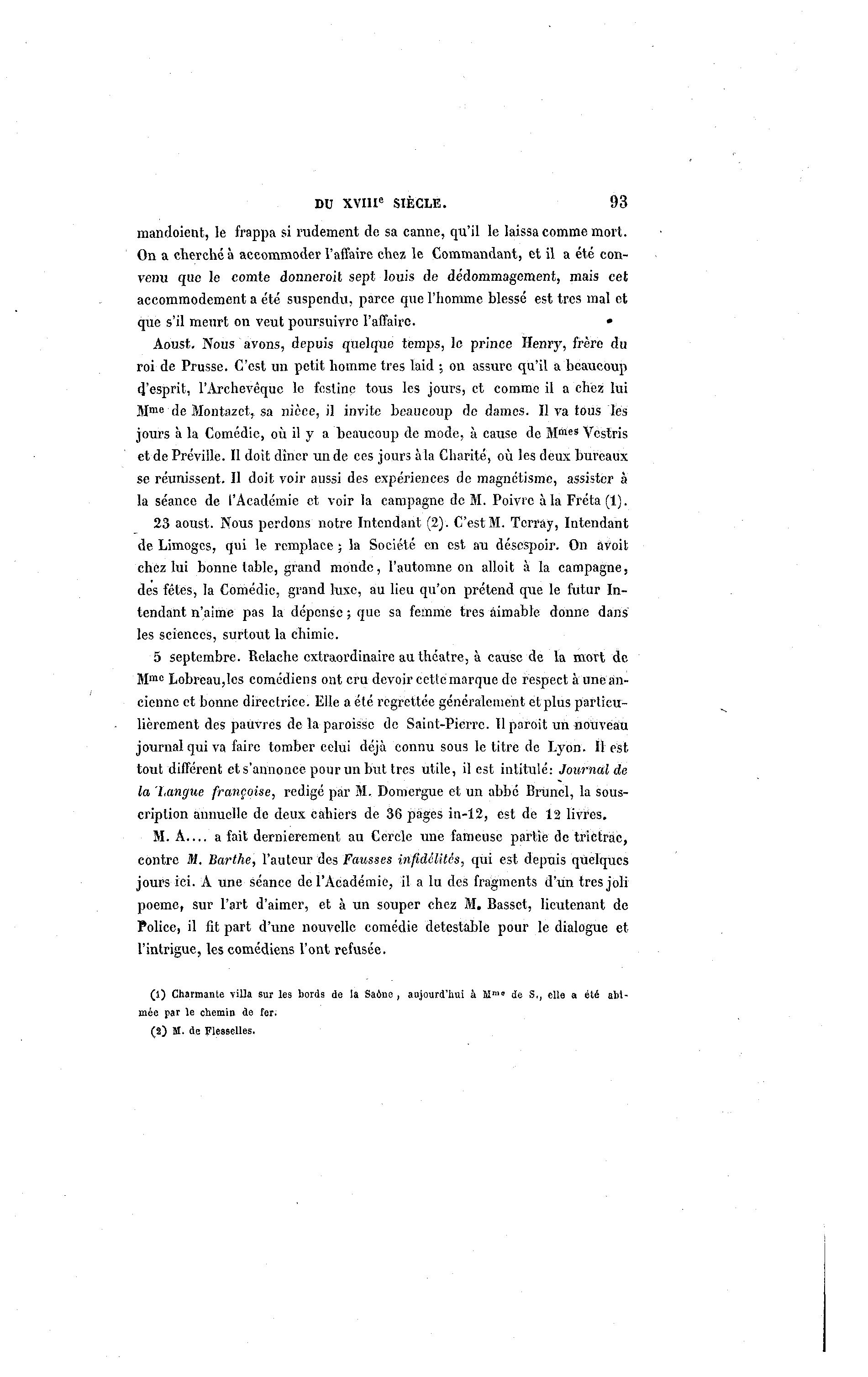 DU XVIIIe SIÈCLE. 93 mandoient, le frappa si rudement de sa canne, qu'il le laissa comme mort. On a cherché à accommoder l'affaire chez le Commandant, et il a été con- venu que le comte donnerait sept louis de dédommagement, mais cet accommodement a été suspendu, parce que l'homme blessé est très mal et que s'il meurt on veut poursuivre l'affaire. • Aoust. Nous avons, depuis quelque temps, lo prince Henry, frère du roi de Prusse. C'est un petit homme très laid ; on assure qu'il a beaucoup d/esprit, l'Archevêque le fcstine tous les jours, et comme il a chez lui M me de Montazet, sa nièce, il invite beaucoup de dames. Il va tous les jours à la Comédie, où il y a beaucoup de mode, à cause de M"*"8 Veslris et de Préville. Il doit dîner un de ces jours à la Charité, où les deux bureaux se réunissent. Il doit voir aussi des expériences de magnétisme, assister à la séance de l'Académie et voir la campagne de M. Poivre à la Fréta (1). 23 aoust. Nous perdons notre Intendant (2). C'est M. Tcrray, Intendant de Limoges, qui le remplace ; la Société en est au désespoir. On à voit chez lui bonne table, grand monde, l'automne on alloit à la campagne, des fêtes, la Comédie, grand luxe, au lieu qu'on prétend que le futur In- tendant n'aime pas la dépense ; que sa femme très aimable donne dans les sciences, surtout la chimie. 5 septembre. Relâche extraordinaire au théâtre, à cause de la mort de Mmc Lobreau,les comédiens ont cru devoir cette marque de respect à unean- cienne et bonne directrice. Elle a été regrettée généralement et plus particu- lièrement des pauvres de la paroisse de Saint-Pierre. Il paroit un nouveau journal qui va faire tomber celui déjà connu sous le titre do Lyon. Il est tout différent et s'annonce pour un but très utile, il est intitulé: Journal de la 'Langue française, rédigé par M. Domergue et un abbé Brunel, la sous- cription annuelle de deux cahiers de 36 pages in-12, est de 12 livres. M. A — a fait dernièrement au Cercle une fameuse partie de trictrac, contre M. Barthe, l'auteur des Fausses infidélités, qui est depuis quelques jours ici. A une séance de l'Académie, il a lu des fragments d'un très joli poème, sur l'art d'aimer, et à un souper chez M. Basset, lieutenant de Police, il fit part d'une nouvelle comédie détestable pour le dialogue et l'intrigue, les comédiens l'ont refusée. (1) Charmante villa sur les bords de la Saône , aujourd'hui à M™0 de S,, elle a été abî- mée par le chemin de fer. (2) M. de Flesselles.