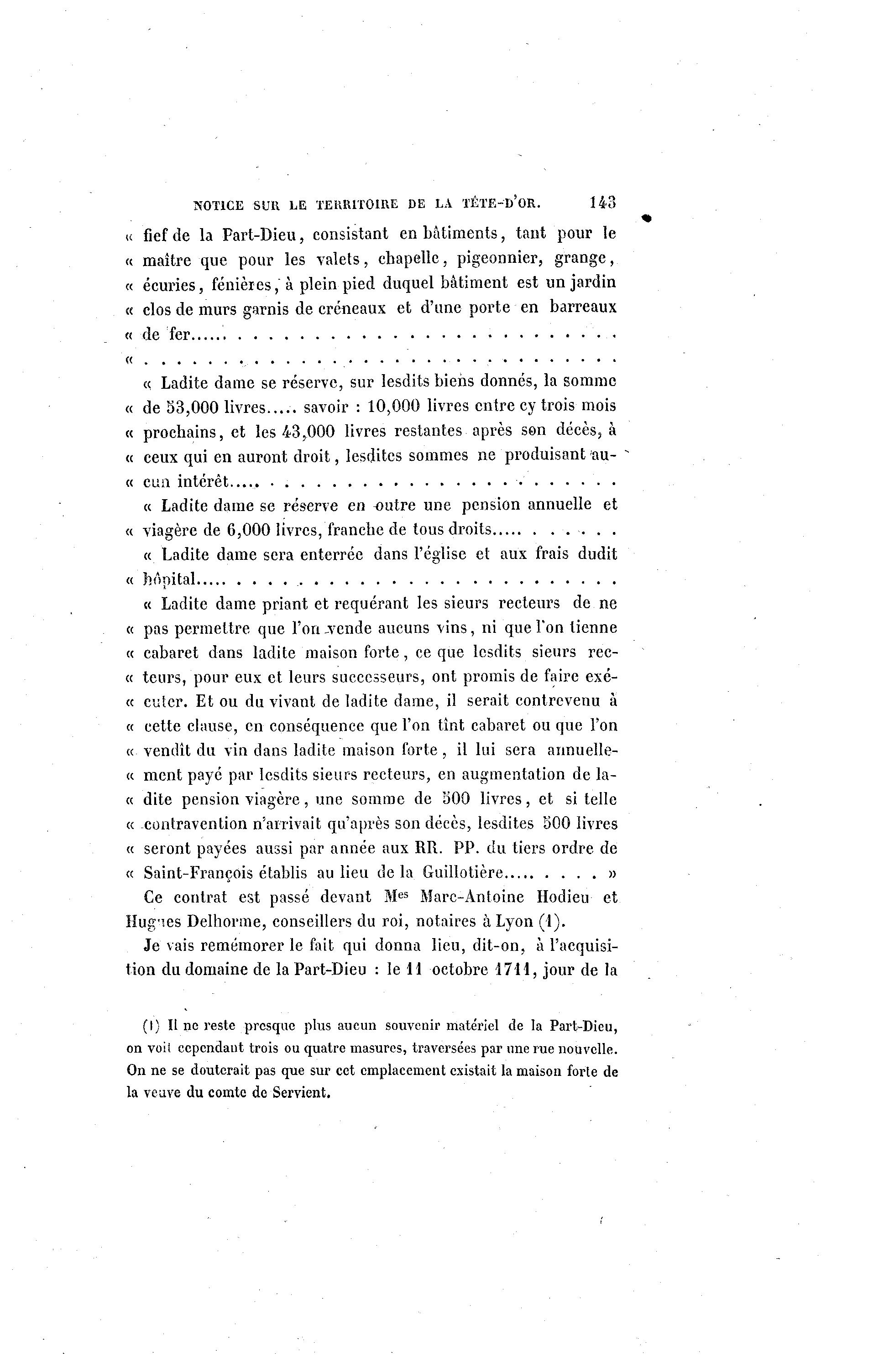 NOTICE SUE LE TERRITOIRE DE LA TÊTE-D'OR. 143 « fief de la Part-Dieu, consistant en bâtiments, tant pour le « maître que pour les valets, chapelle, pigeonnier, grange, « écuries, fenières, à plein pied duquel bâtiment est un jardin « clos de murs garnis de créneaux et d'une porte en barreaux « de fer « « Ladite dame se réserve, sur lesdits biens donnés, la somme « de 53,000 livres..... savoir : 10,000 livres entre cy trois mois « prochains, et les 43,000 livres restantes après son décès, à « ceux qui en auront droit, lesdites sommes ne produisant au- - « cun intérêt • « Ladite dame se réserve en outre une pension annuelle et « viagère de 6,000 livres, franche de tous droits « Ladite dame sera enterrée dans l'église et aux frais dudit « hôpital « Ladite dame priant et requérant les sieurs recteurs de ne « pas permettre que l'on -vende aucuns vins, ni que l'on tienne « cabaret dans ladite maison forte, ce que lesdits sieurs rec- « teurs, pour eux et leurs successeurs, ont promis de faire exé- « cuter. Et ou du vivant de ladite dame, il serait contrevenu à « cette clause, en conséquence que l'on tînt cabaret ou que l'on « vendît du vin dans ladite maison forte, il lui sera annuelle- « ment payé par lesdits sieurs recteurs, en augmentation de la- c dite pension viagère, une somme de SOO livres, et si telle e « contravention n'arrivait qu'après son décès, lesdites SOO livres « seront payées aussi par année aux RR. PP. du tiers ordre de « Saint-François établis au lieu delà Guillotière » Ce contrat est passé devant Mes Marc-Antoine Hodieu et Hug'ies Delhorme, conseillers du roi, notaires à Lyon (1). Je vais remémorer le fait qui donna lieu, dit-on, à l'acquisi- tion du domaine de la Part-Dieu : le 11 octobre 1711, jour de la (I) Il ne reste presque plus aucun souvenir matériel de la Part-Dieu, on voit cependant trois ou quatre masures, traversées par une rue nouvelle. On ne se douterait pas que sur cet emplacement existait la maison forte de la veuve du comte de Servient.