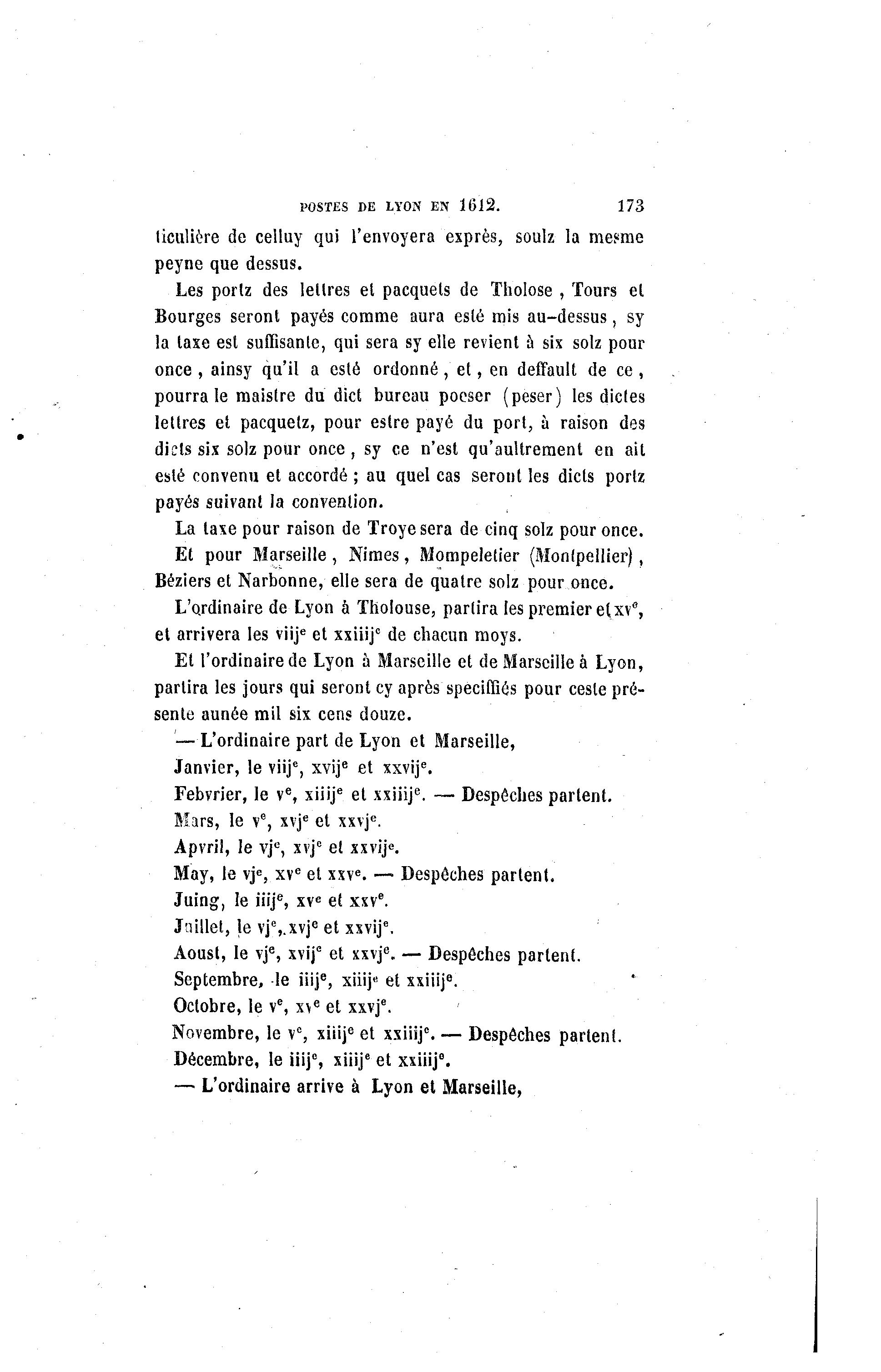 POSTES DE LYON EN 1612. 173 liculière de celluy qui l'envoyera exprès, soulz la meeme peyne que dessus. Les porlz des lettres et pacquets de Tholose , Tours et Bourges seront payés comme aura esté mis au-dessus, sy la taxe est suffisante, qui sera sy elle revient à six solz pour once , ainsy qu'il a esté ordonné , et, en deffault de ce , pourra le maistre du dict bureau poeser (peser) les dictes lettres et pacquetz, pour estre payé du port, à raison des diels six solz pour once , sy ce n'est qu'aultrement en ait esté convenu et accordé ; au quel cas seront les dicts portz payés suivant la convention. La taxe pour raison de Troyesera de cinq solz pour once. Et pour Marseille , Nîmes, Mompeletier (Montpellier), Béziers et Narbonne, elle sera de quatre solz pour once. L'ordinaire de Lyon à Tholouse, partira les premier et xv", et arrivera les viije et xxiiij0 de chacun moys. Et l'ordinaire de Lyon à Marseille et de Marseille à Lyon, partira les jours qui seront cy après speciffiôs pour cesle pré- sente aunée mil six cens douze. — L'ordinaire part de Lyon et Marseille, Janvier, le viije, xvije et xxvije. Febvrier, le ve, xiiije et xxiiije. — Despêches partent. Mars, le ve, xvje et xxvje. Apvril, le vjc, xvje et xxvip. May, le vj<=, xve et xxve. — Despêches partent. Juing, le iiije, xve et xxve. Juillet, le vj\.xvje et xxvif. Aoust, le vje, xvif et xxvje. — Despêches partent. Septembre, -le iiije, xiiije et xxiiij6. Octobre, le ve, xve et xxvje. Novembre, le vc, xiiije et xxiiije. — Despêches partent. Décembre, le iiije, xiiije et xxiiij0. — L'ordinaire arrive à Lyon et Marseille,