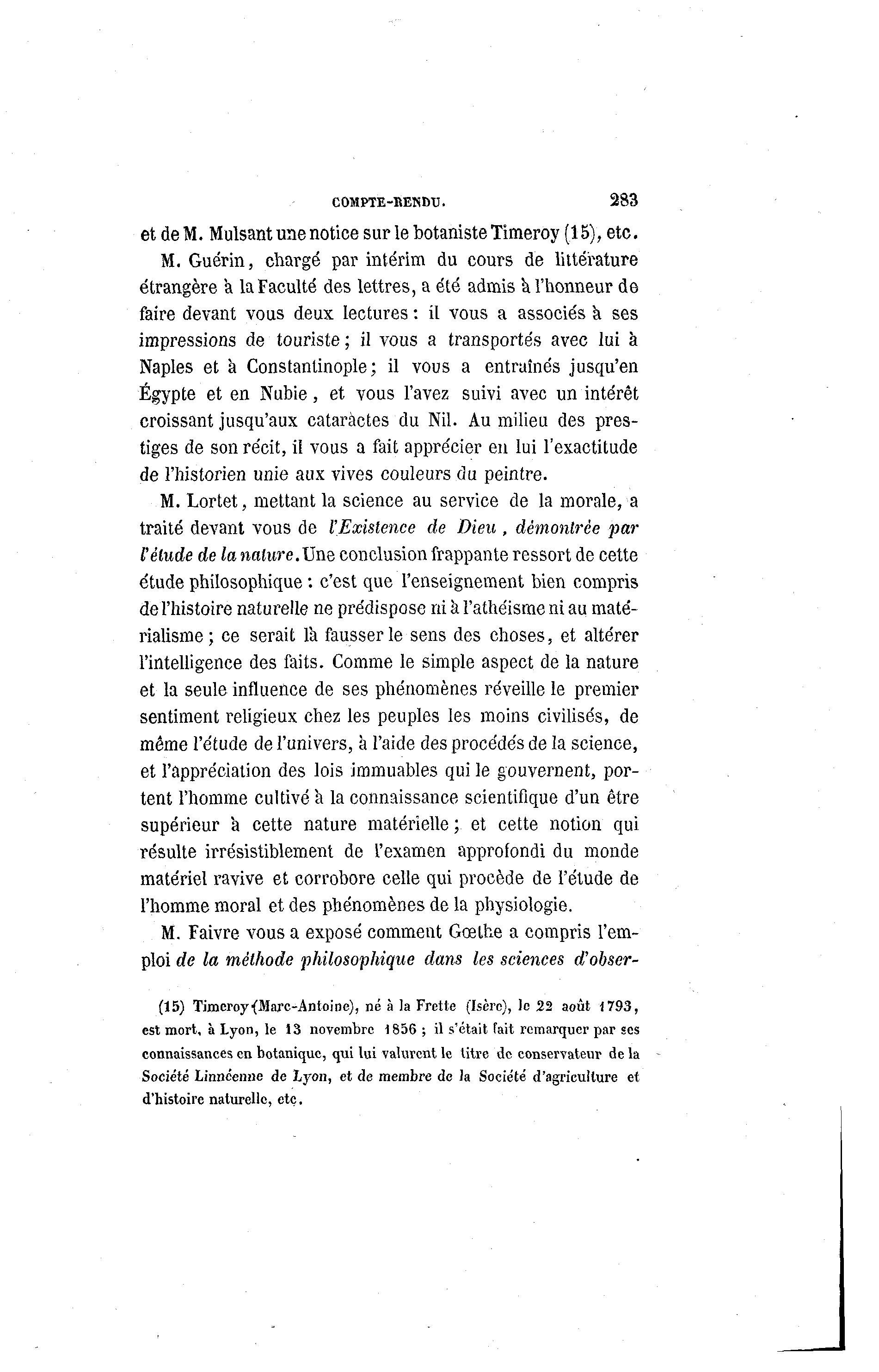 et de M. Mulsant une notice sur le botaniste Timeroy (15), etc.
